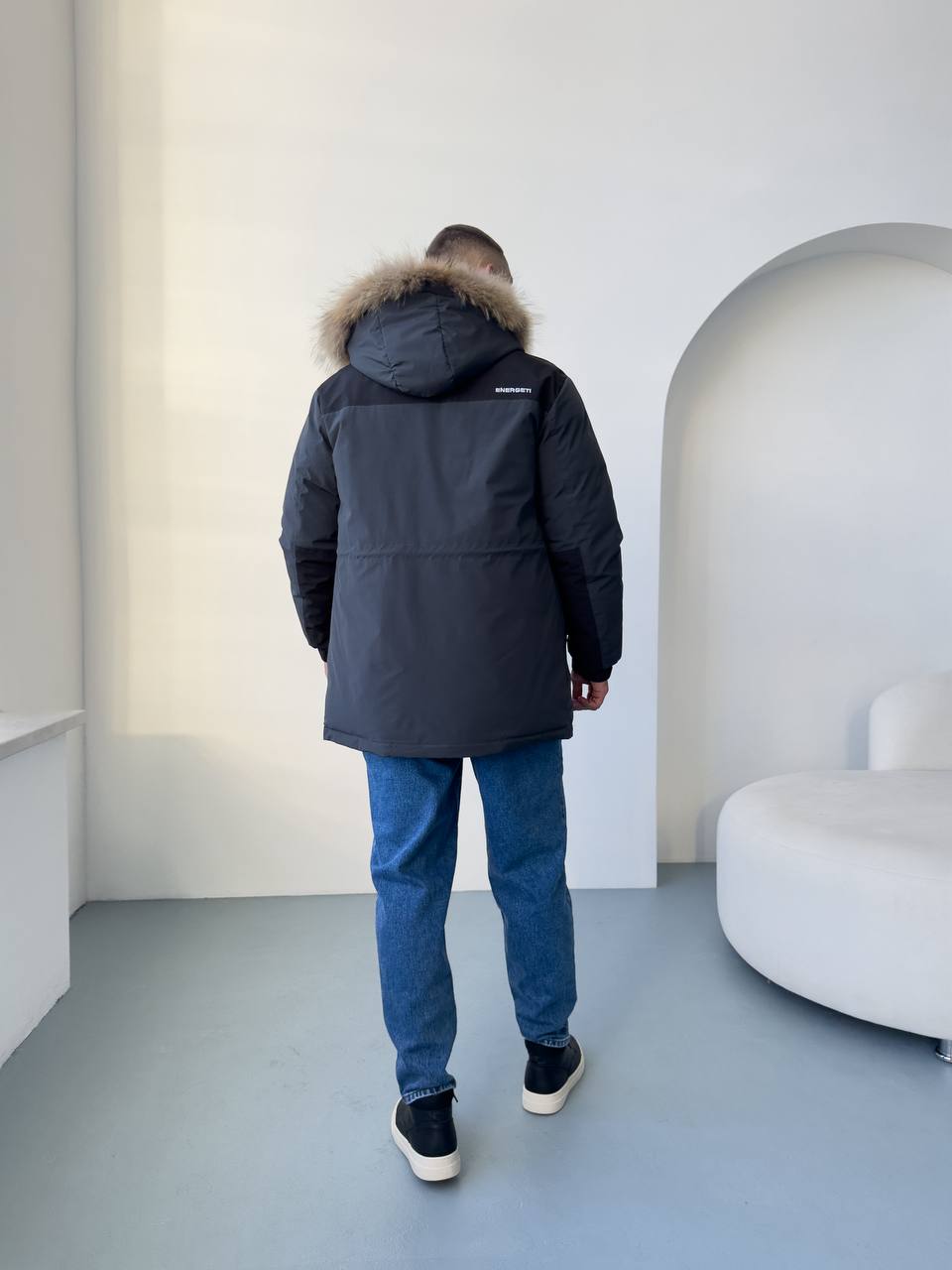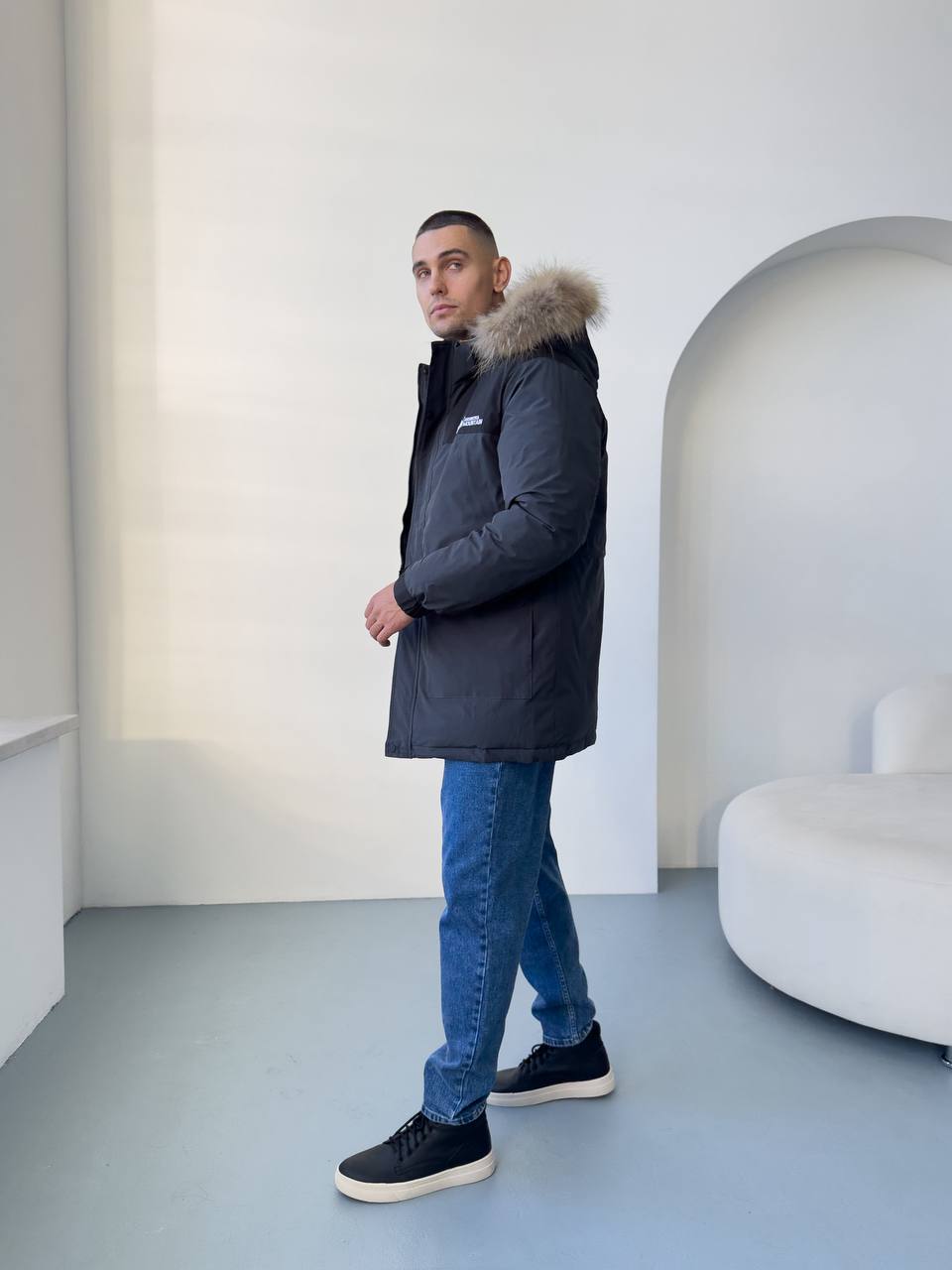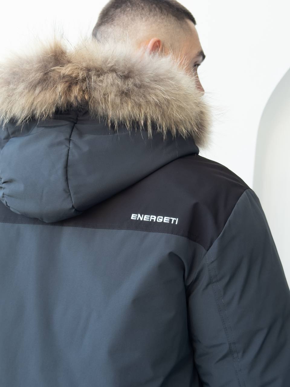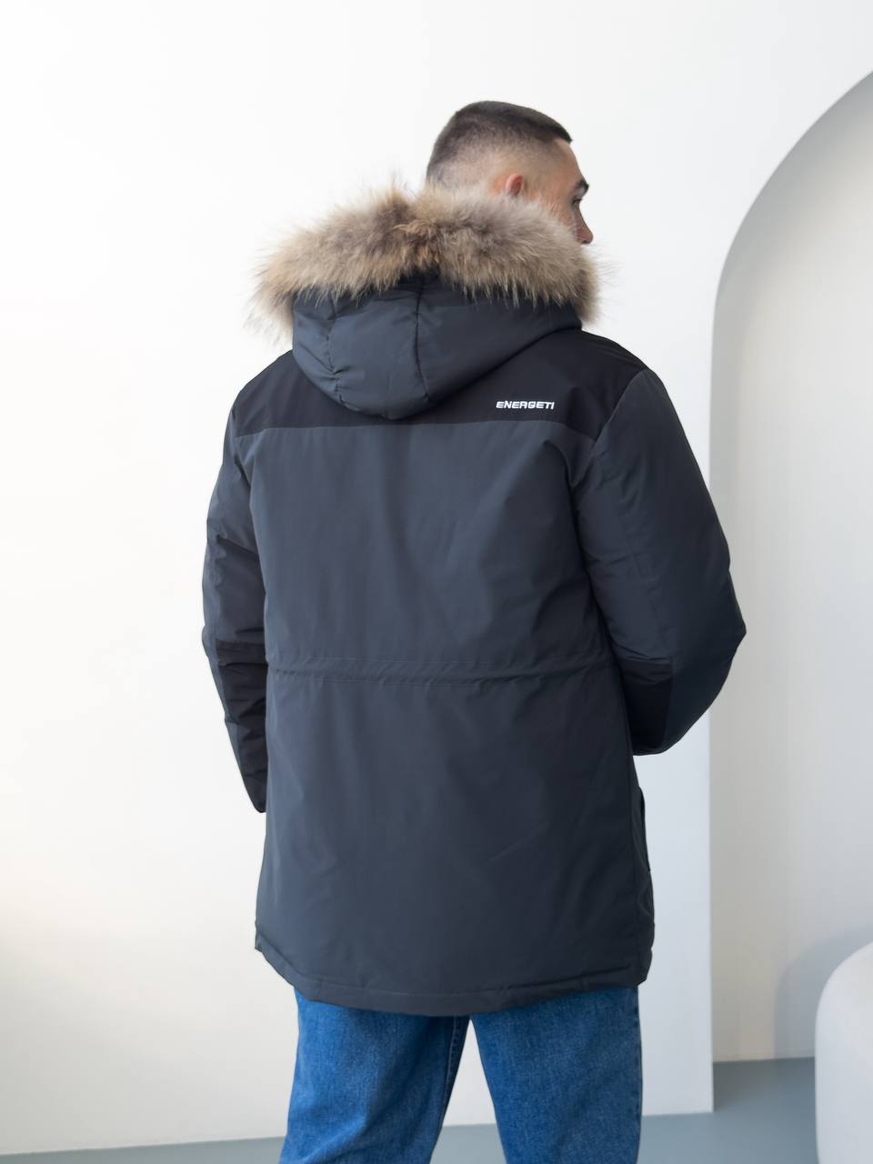 Мужская Зимняя Графитовая Куртка с Мехом на Капюшоне и Фиксаторами на Рукавах