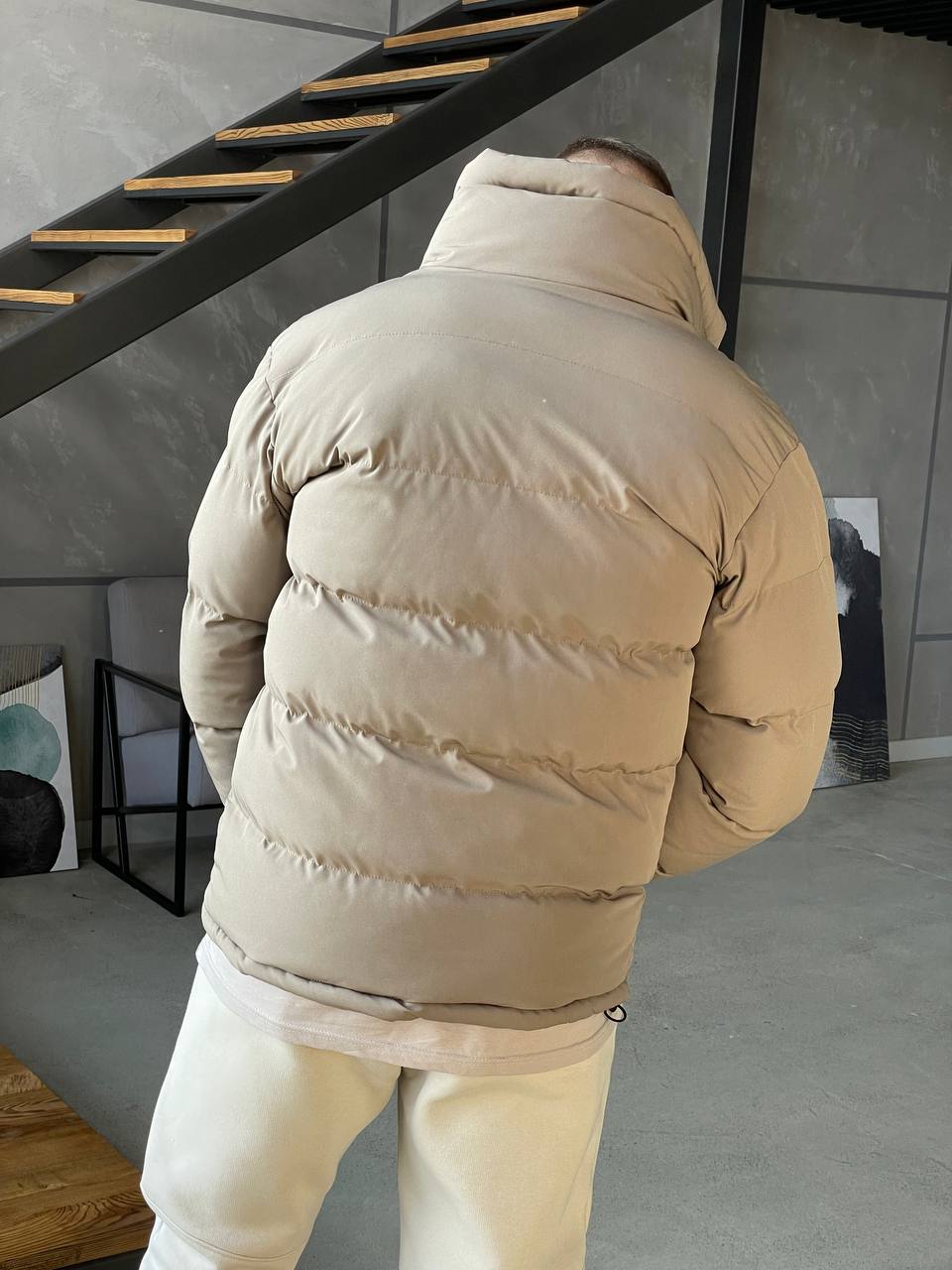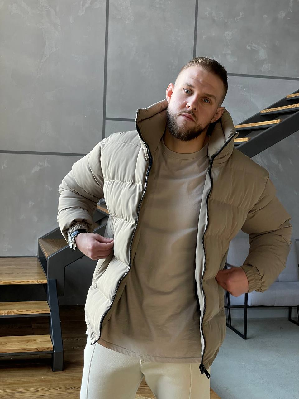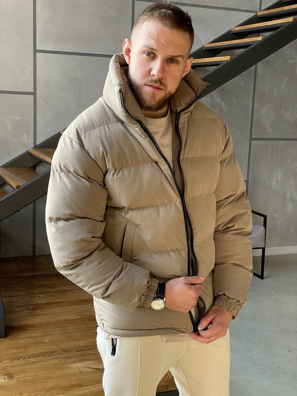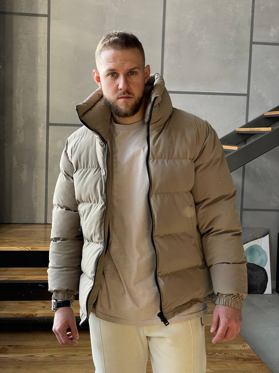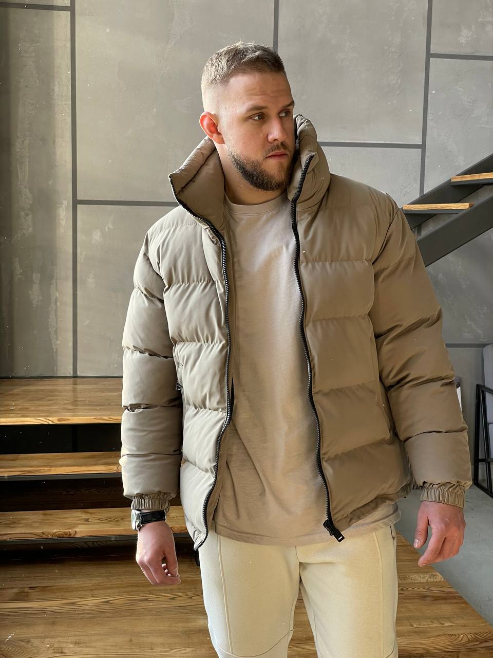 Мужская Зимняя Коричневая Мокко Куртка Базовая – Стеганая Дутая Высокий Воротник