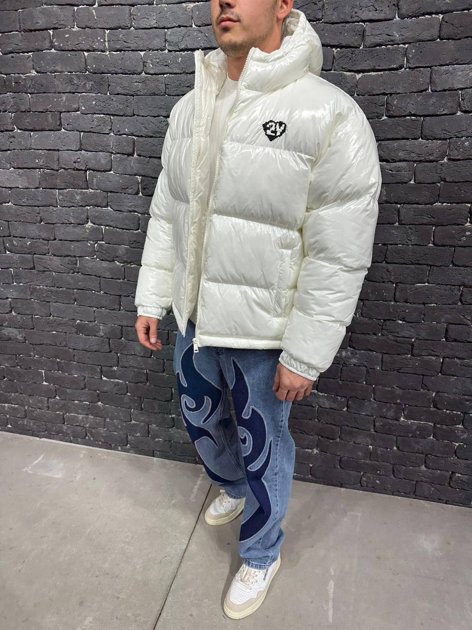 Мужская Зимняя Лаковая Белая Куртка – Дутая с Капюшоном и Манжетами на Резинках