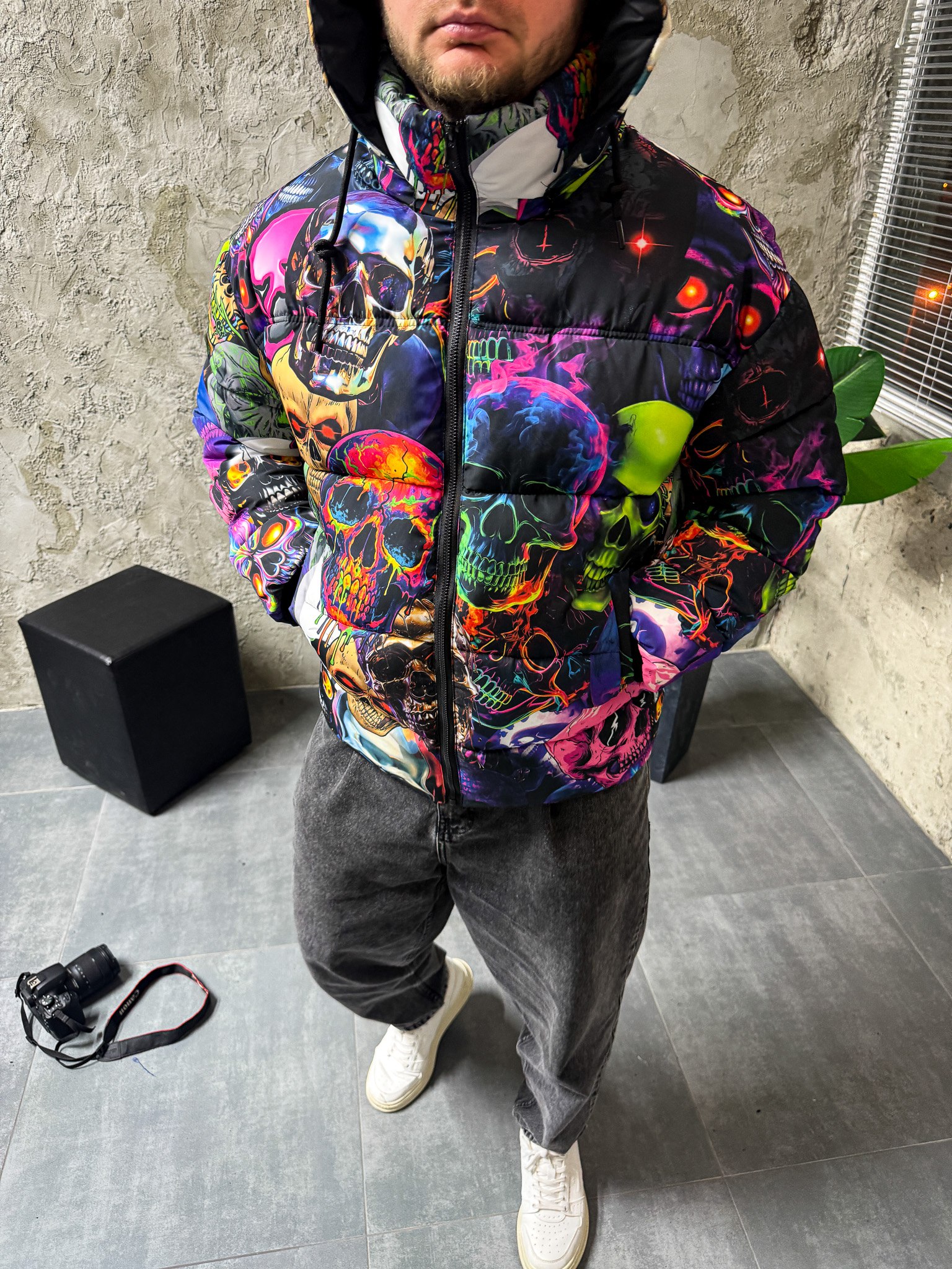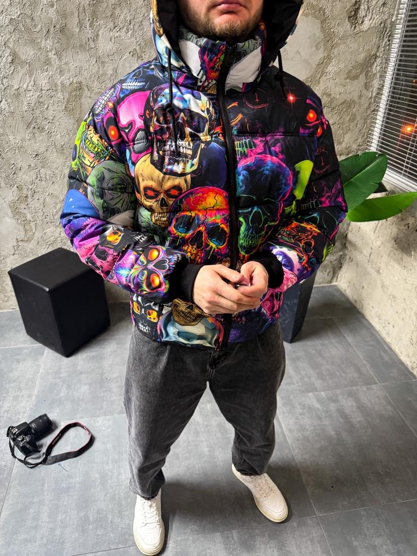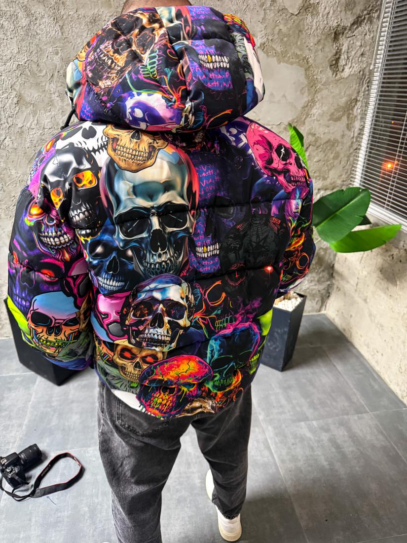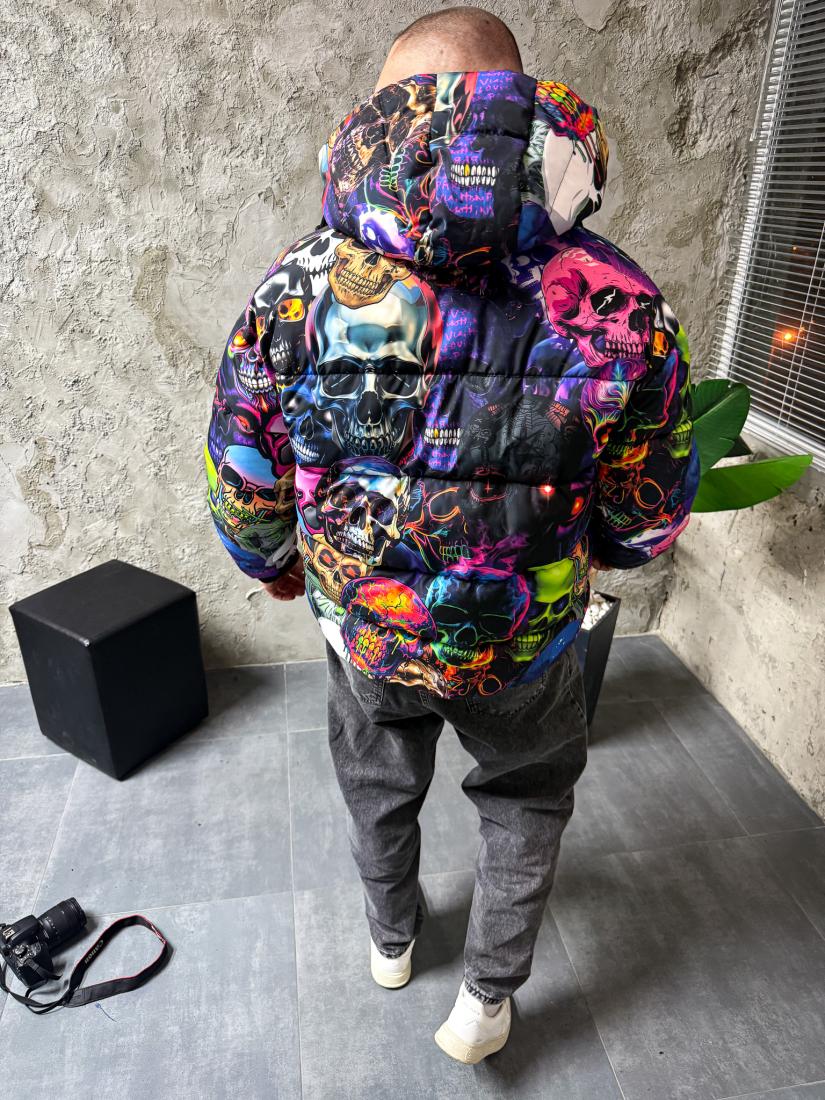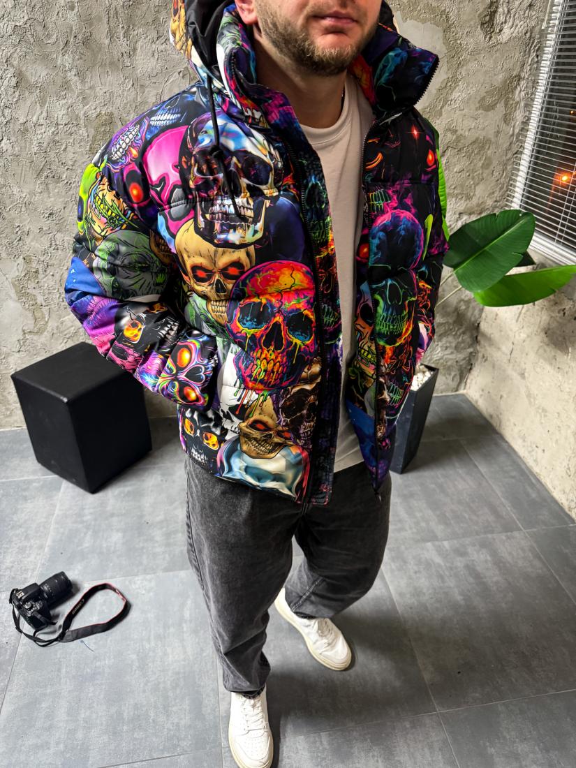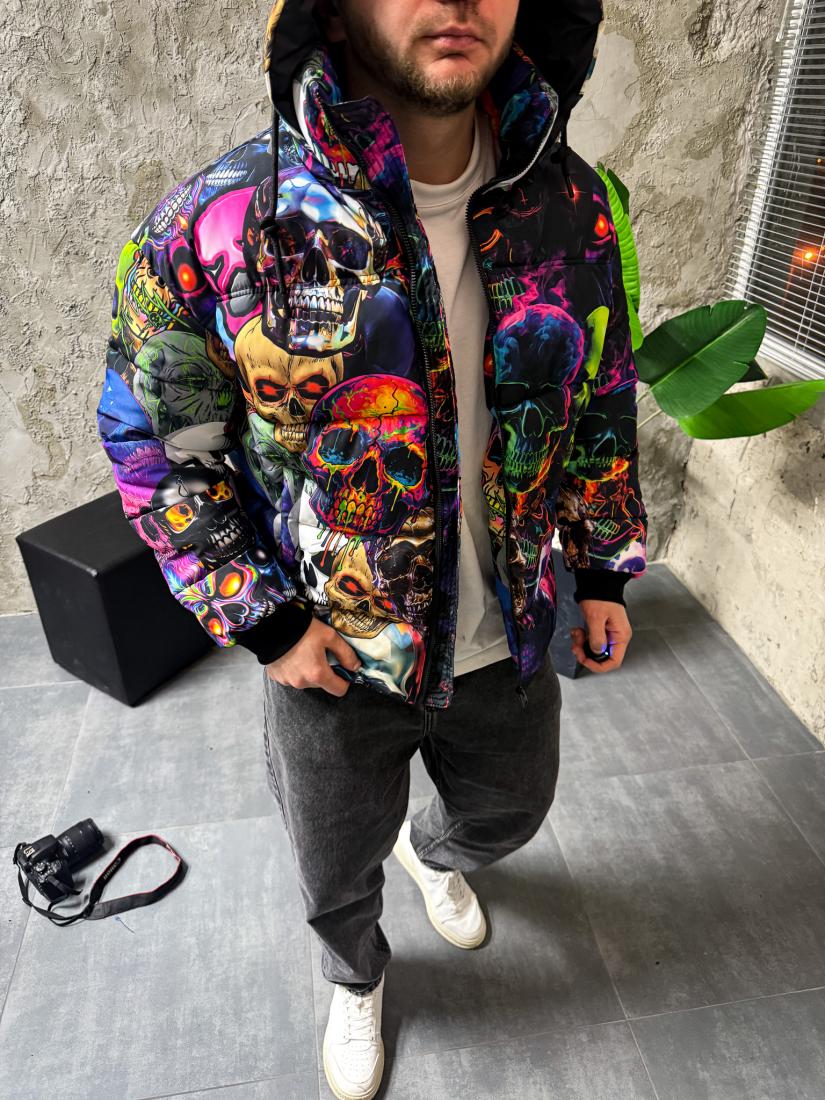 Мужская Зимняя Разноцветная Куртка с Капюшоном и Высоким Горлом – Пуховик в Принт с Черепами