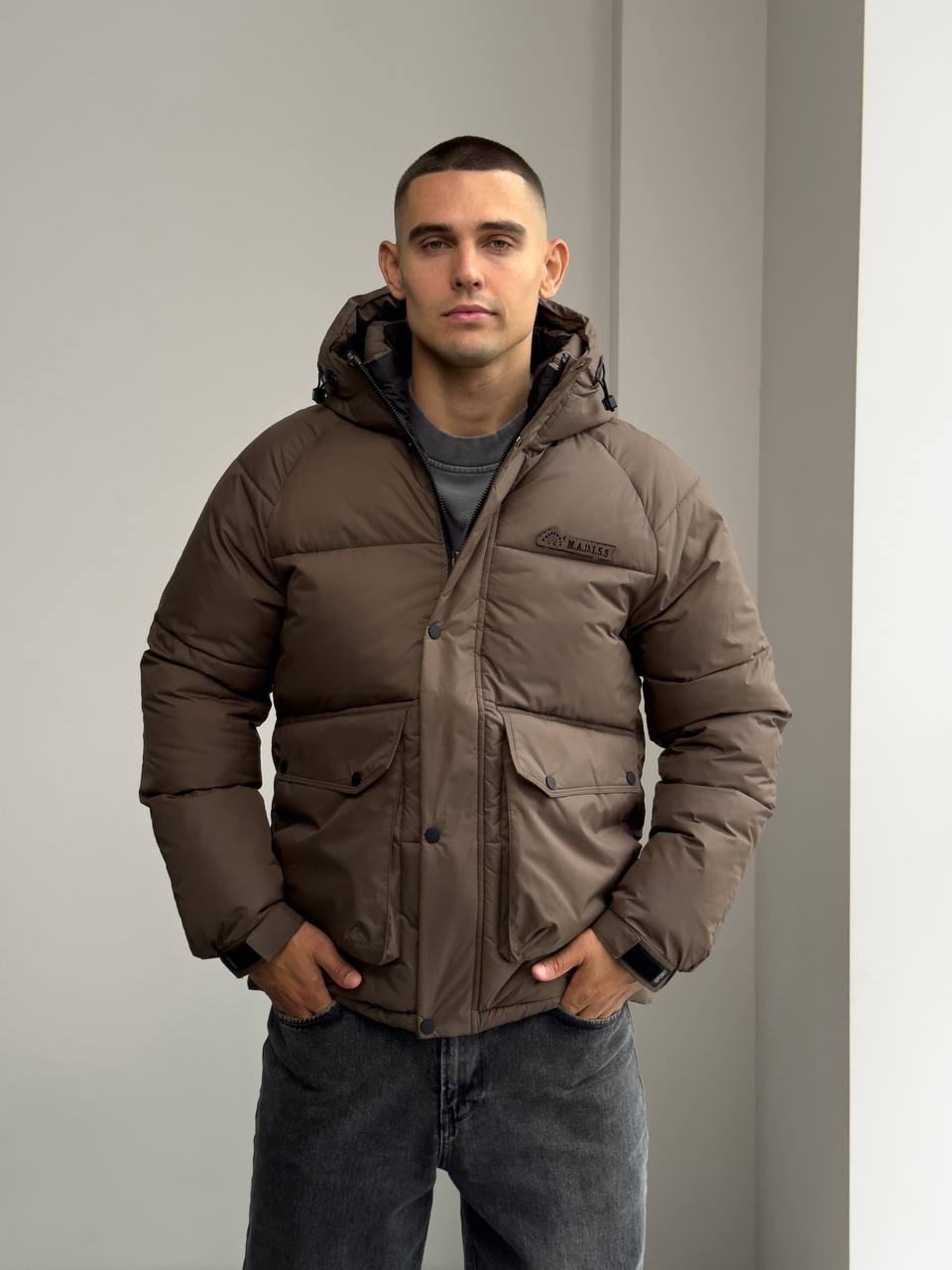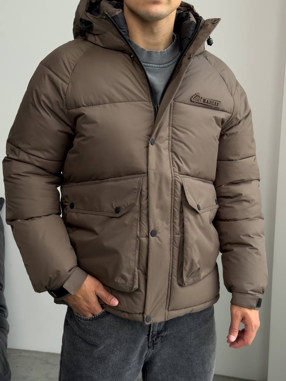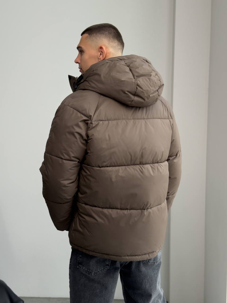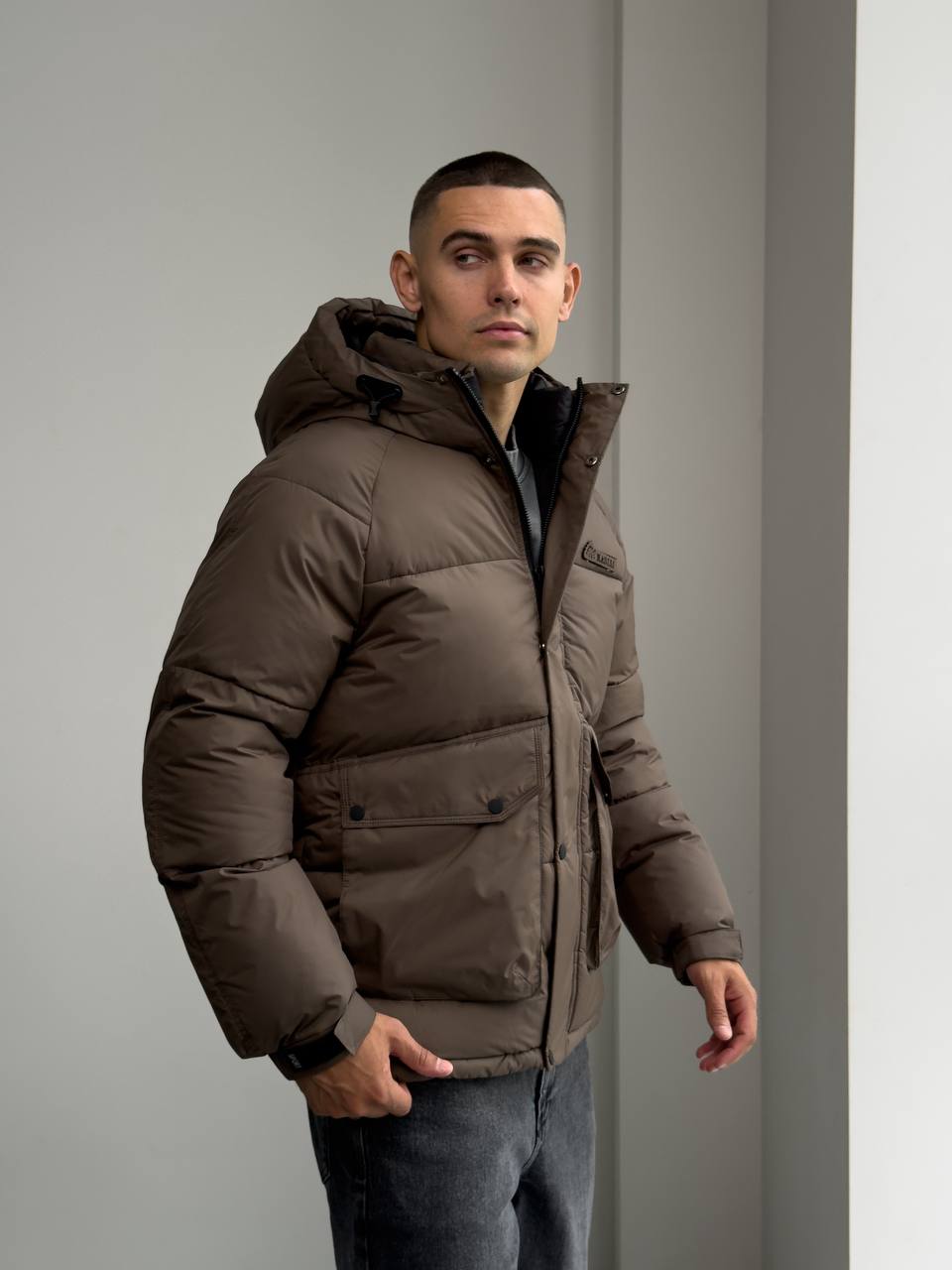 Мужская Зимняя Стеганая Коричневая Куртка с Капюшоном и Фиксаторами на Рукавах