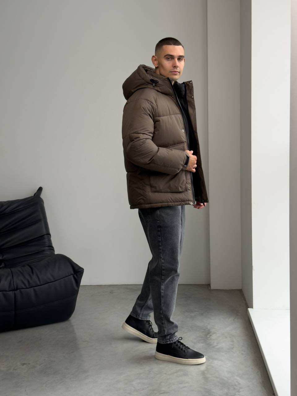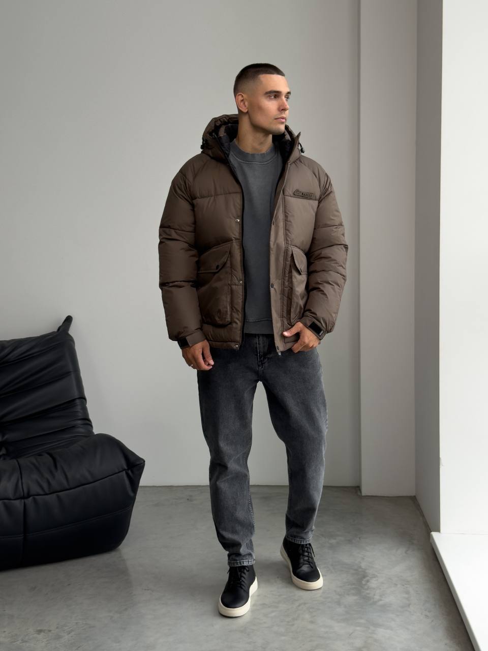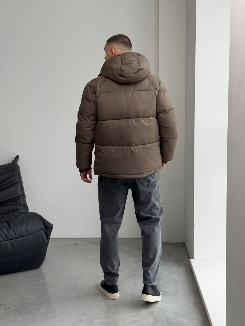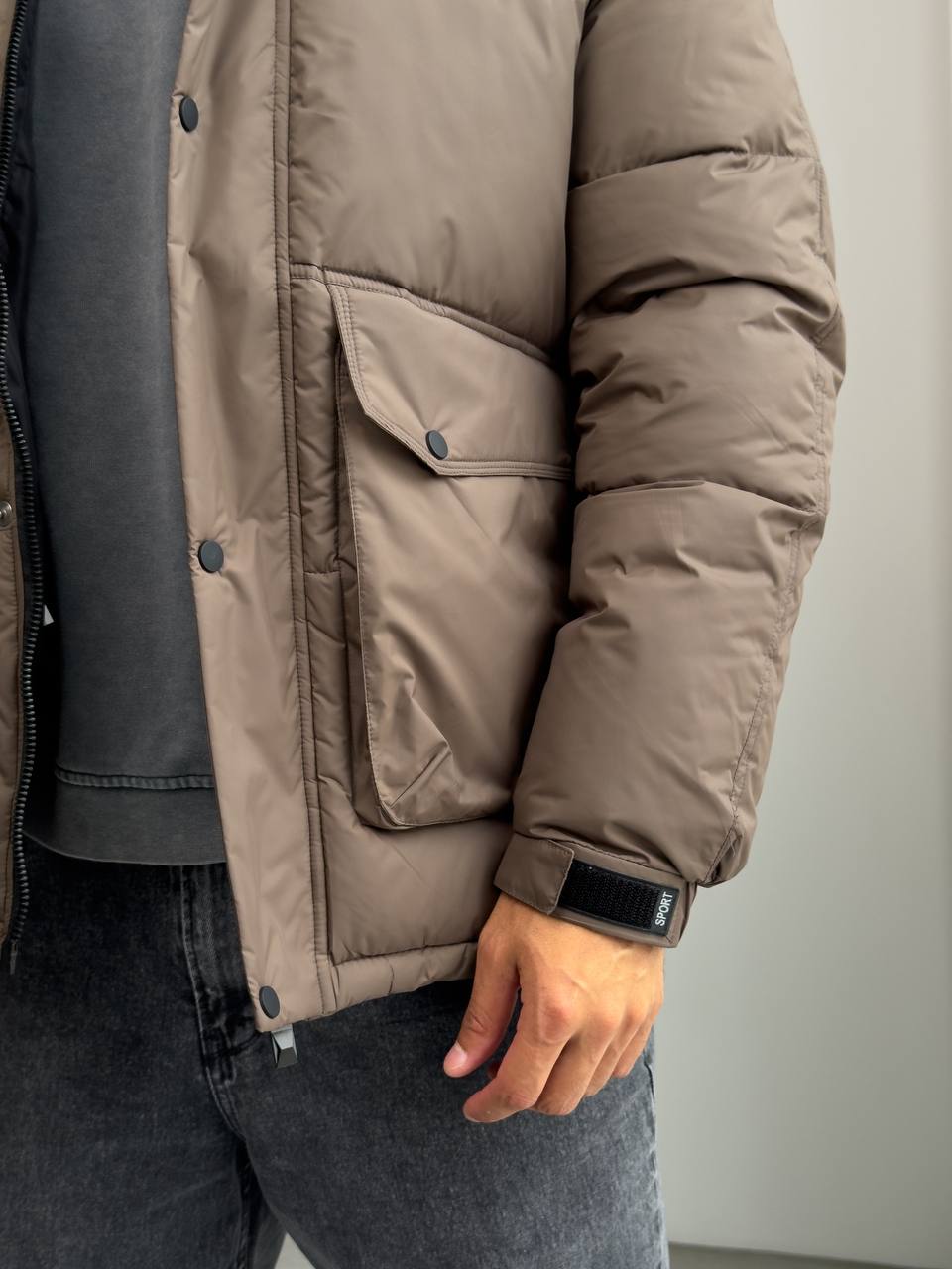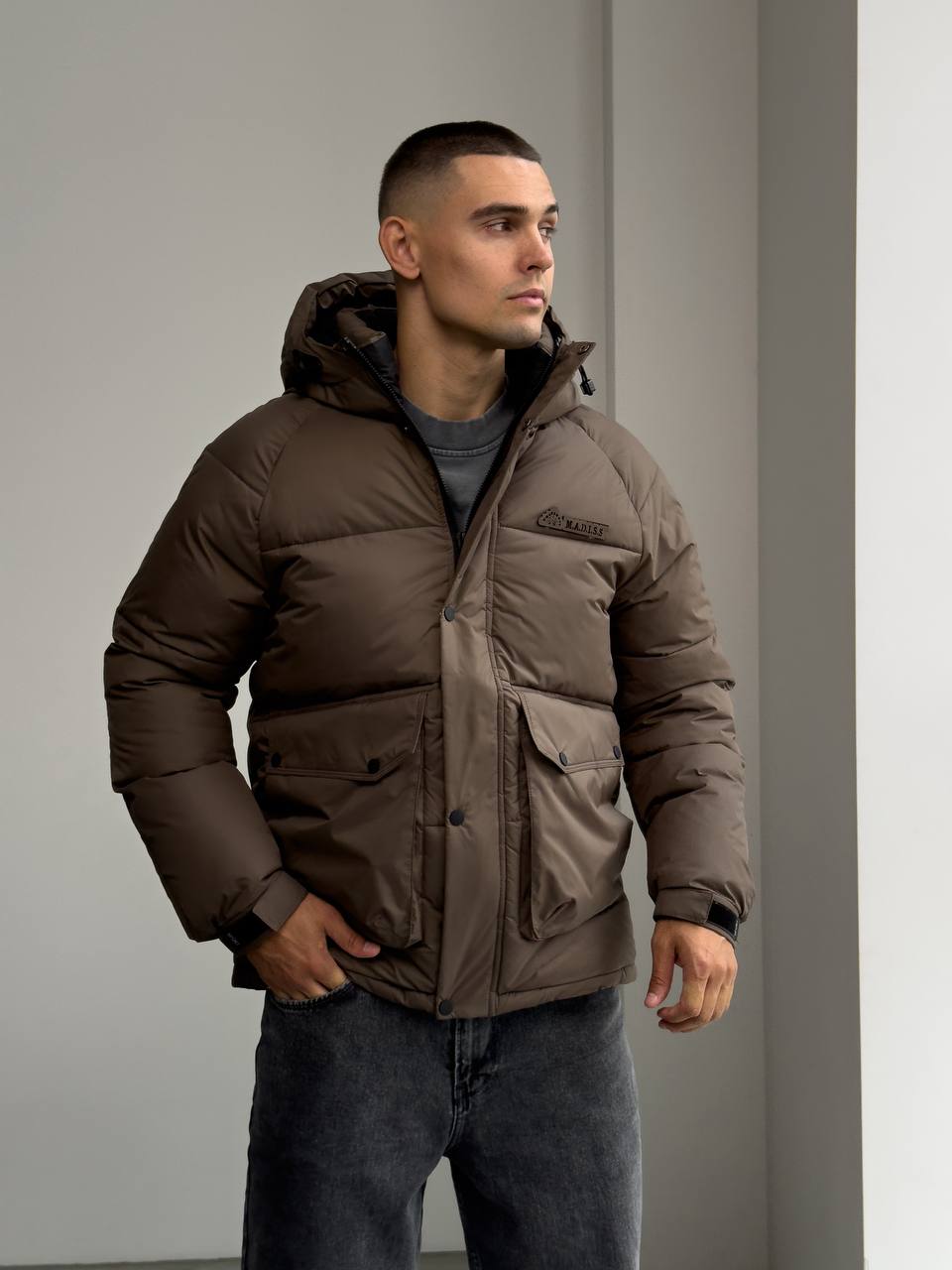 Мужская Зимняя Стеганая Коричневая Куртка с Капюшоном и Фиксаторами на Рукавах