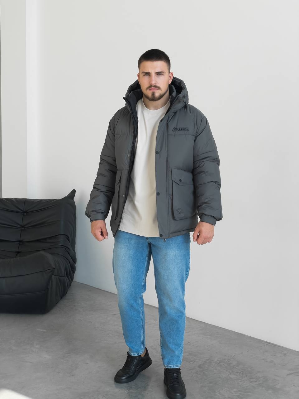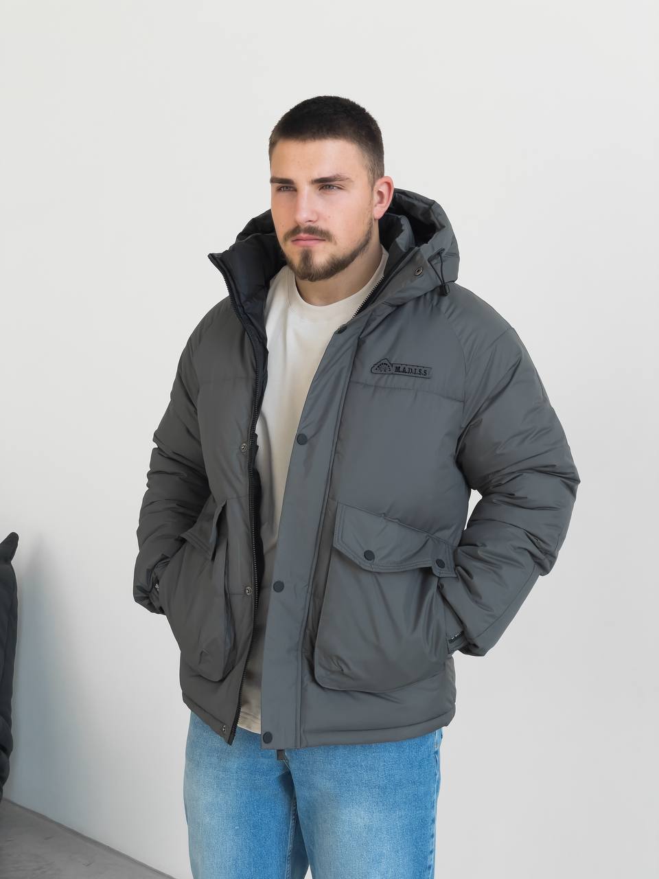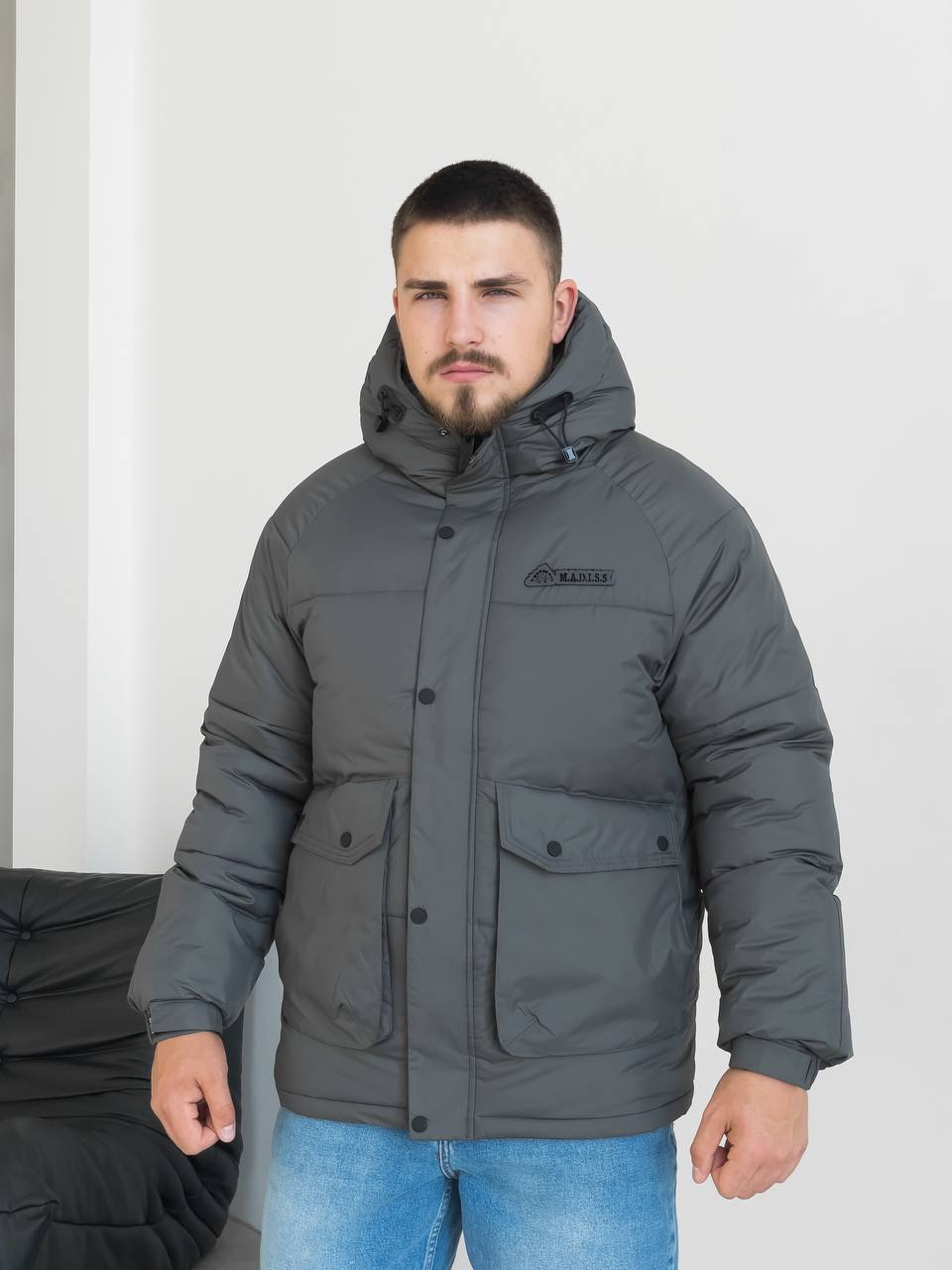 Мужская Зимняя Темно-Серая Куртка с Капюшоном – Стеганая Дутик с Накладными Карманами