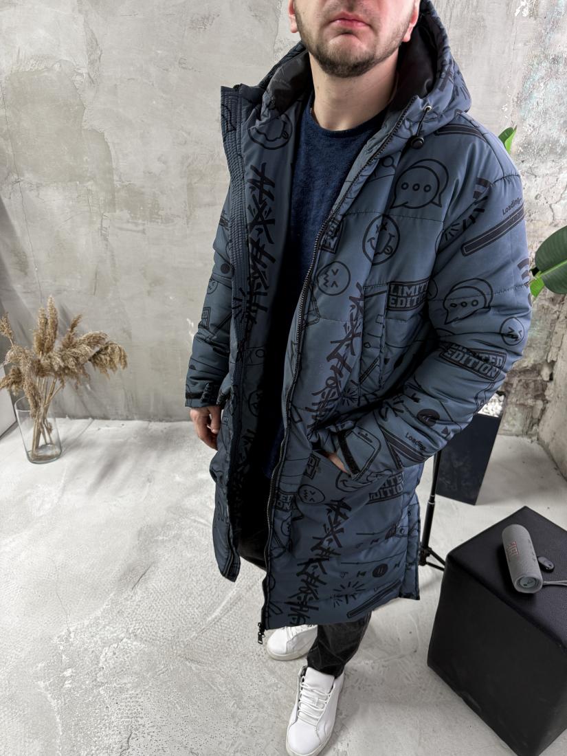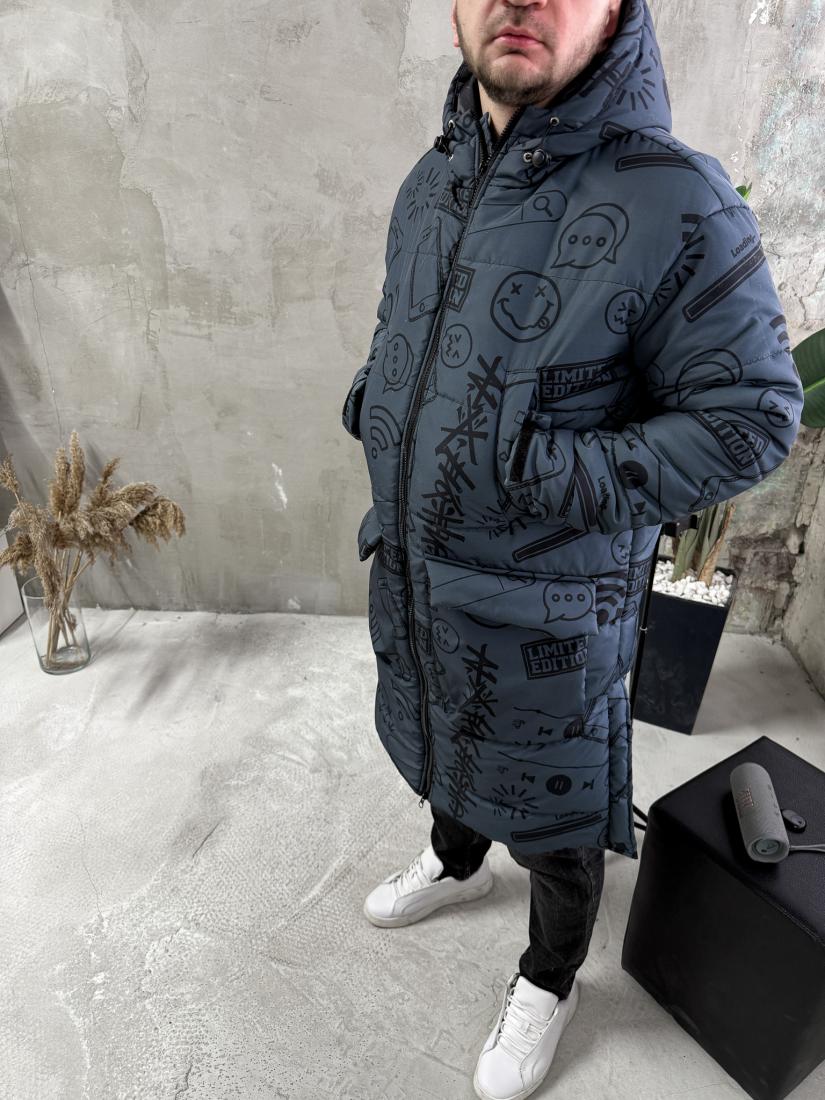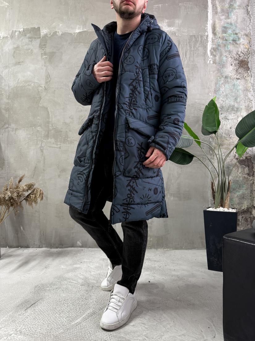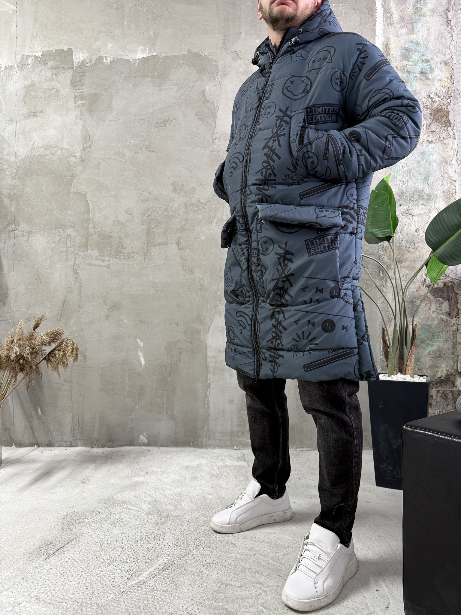 Мужская Зимняя Удлиненная Графитовая Куртка Принтованная с Карманами на Флисе