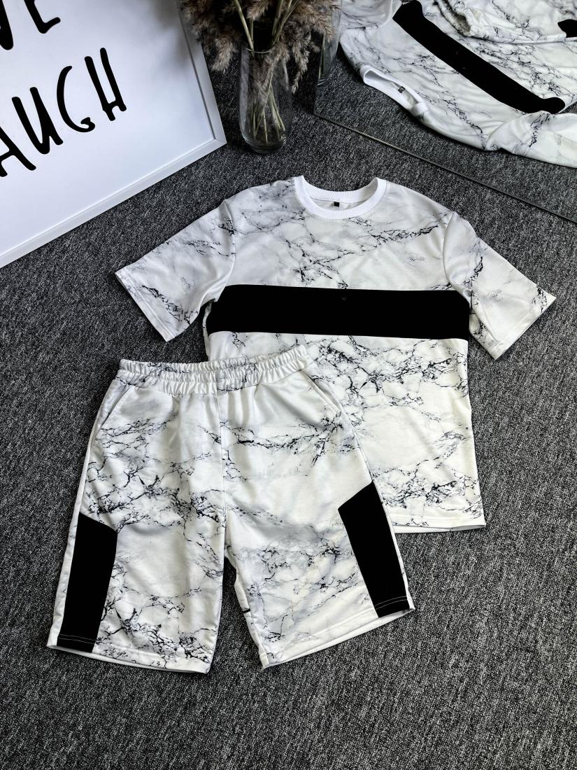 Мужской Белый Летний Комплект в Мраморный Принт с Черными Вставками – Футболка + Шорты
