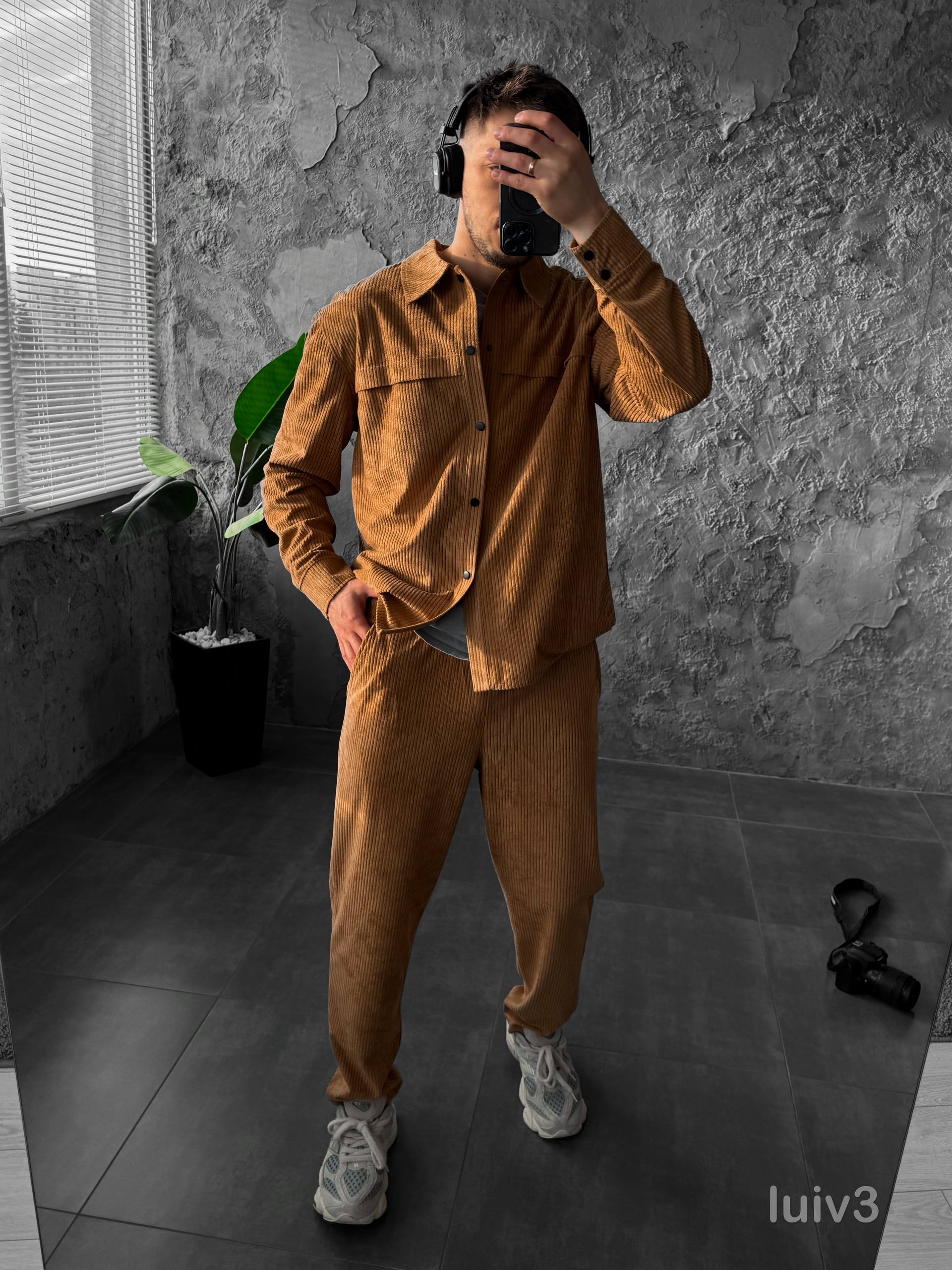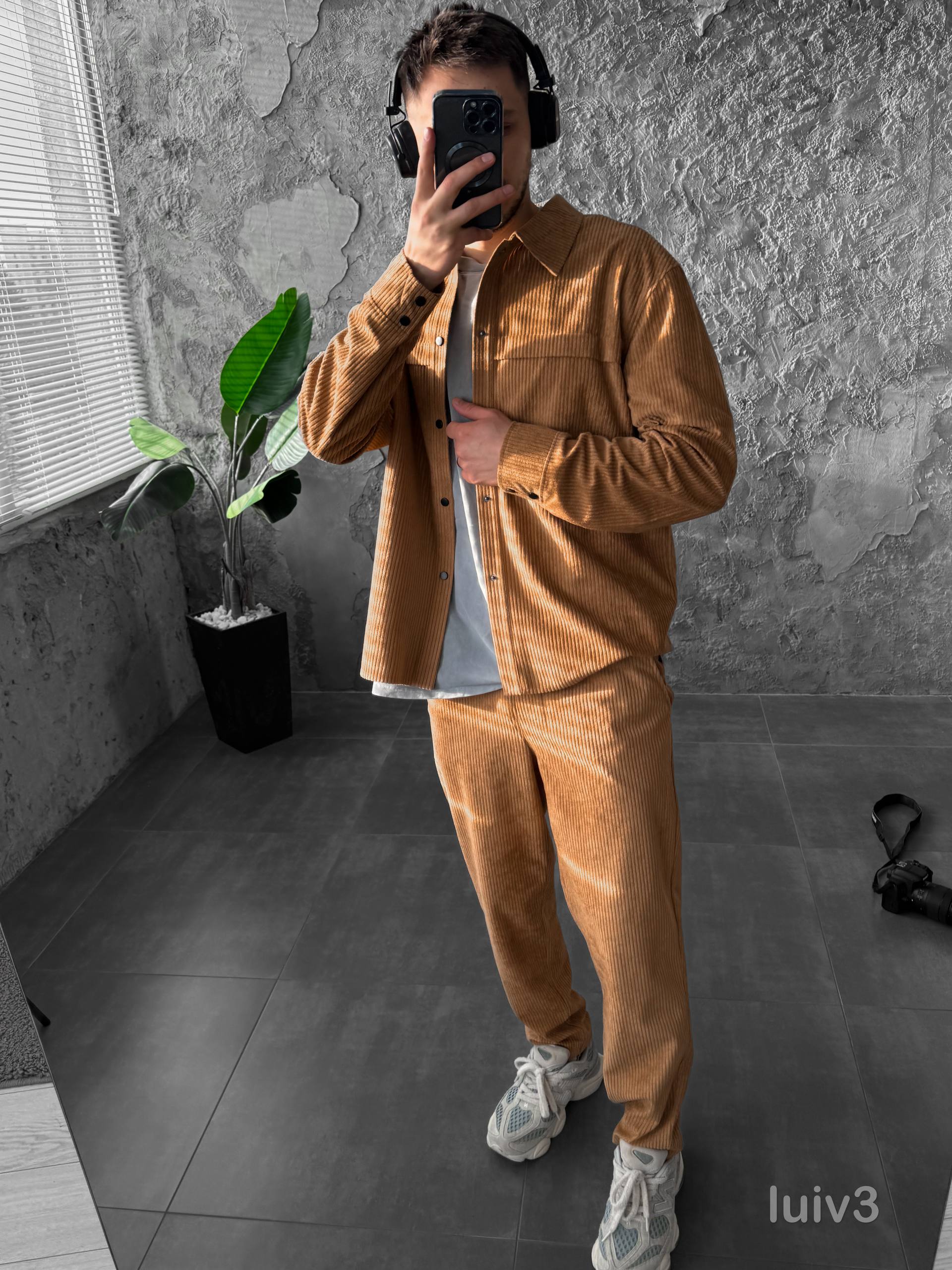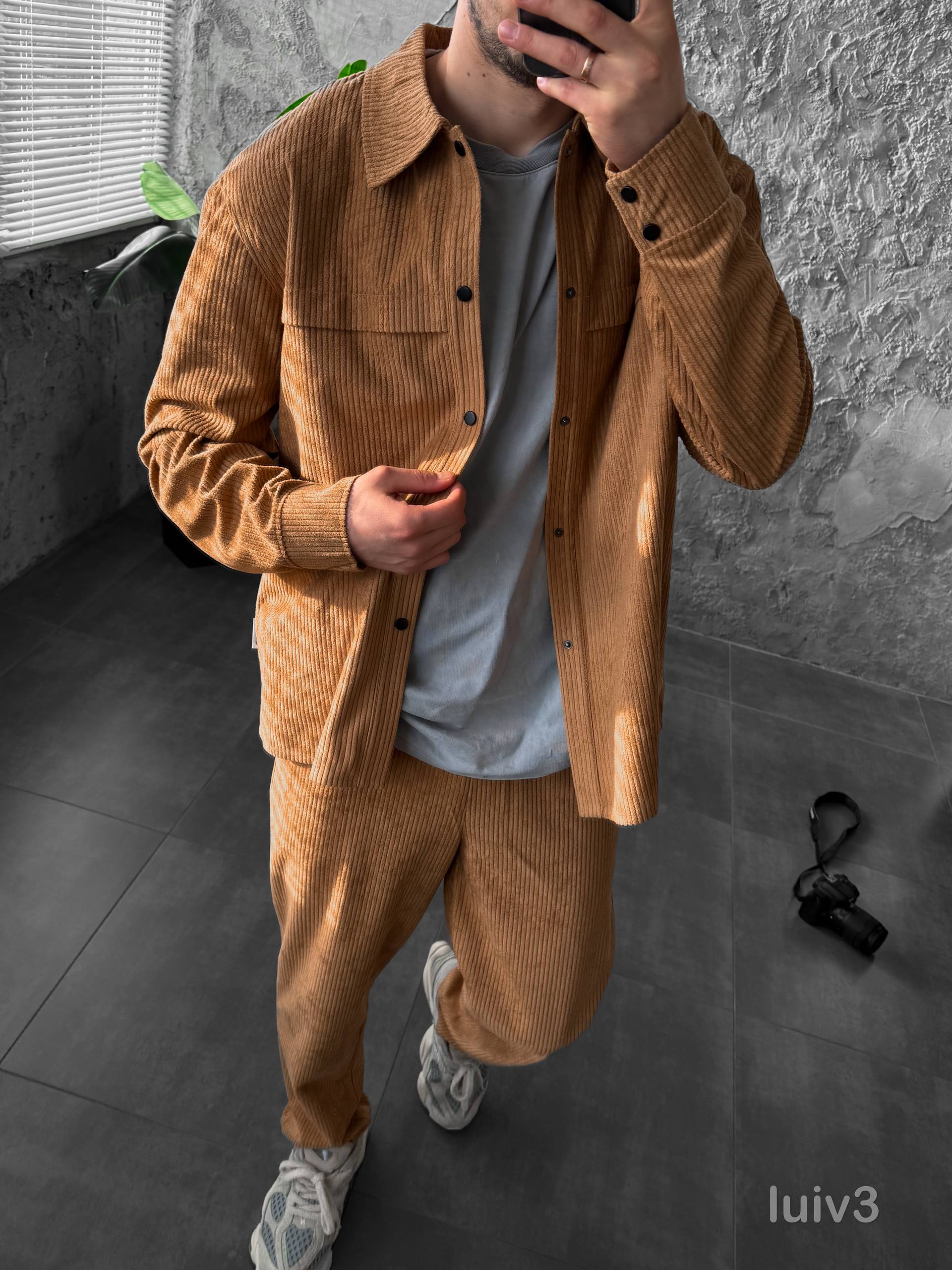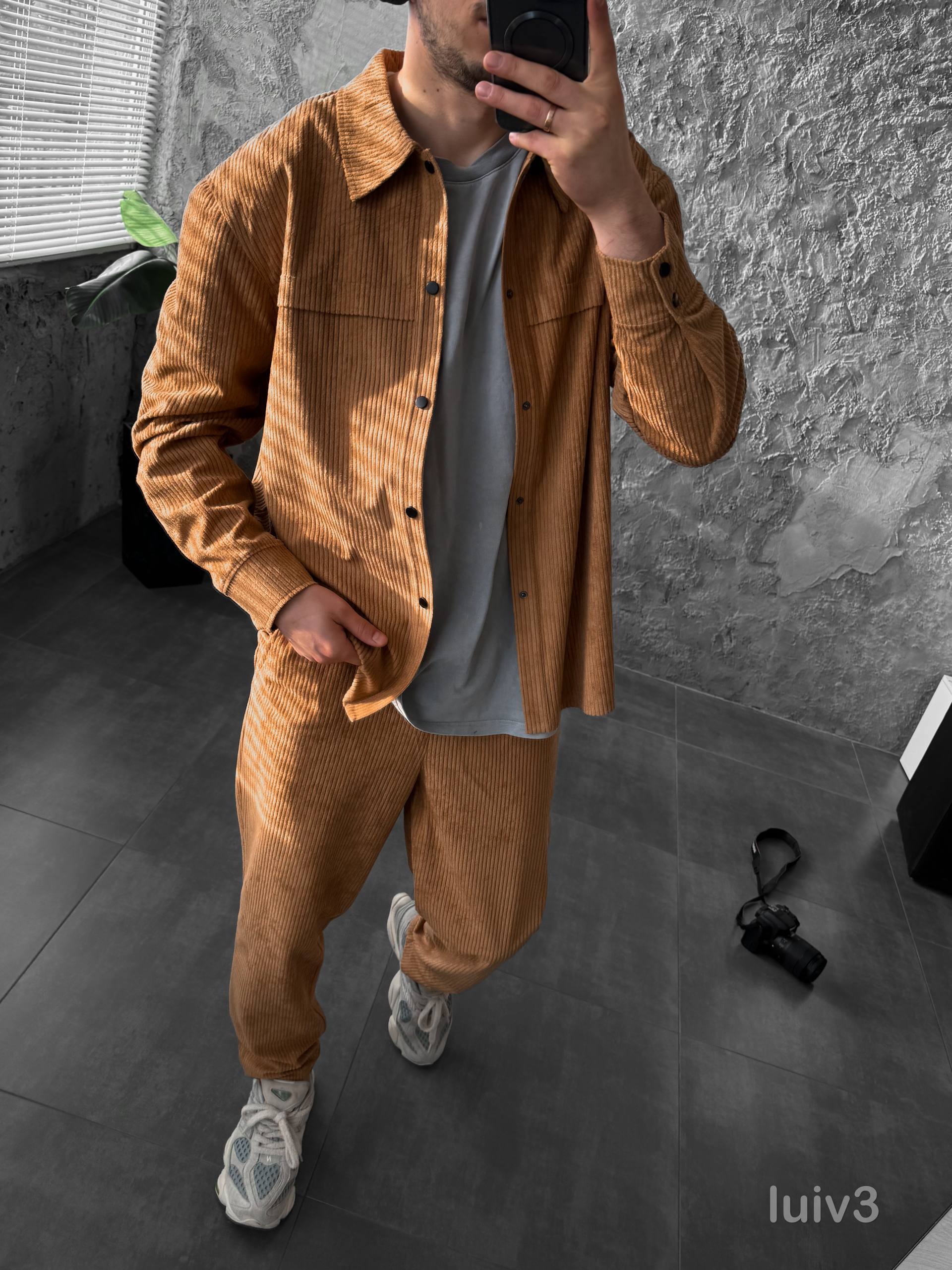Мужской Бежевый Свободный Вельветовый Костюм – Рубашка на Кнопках + Брюки