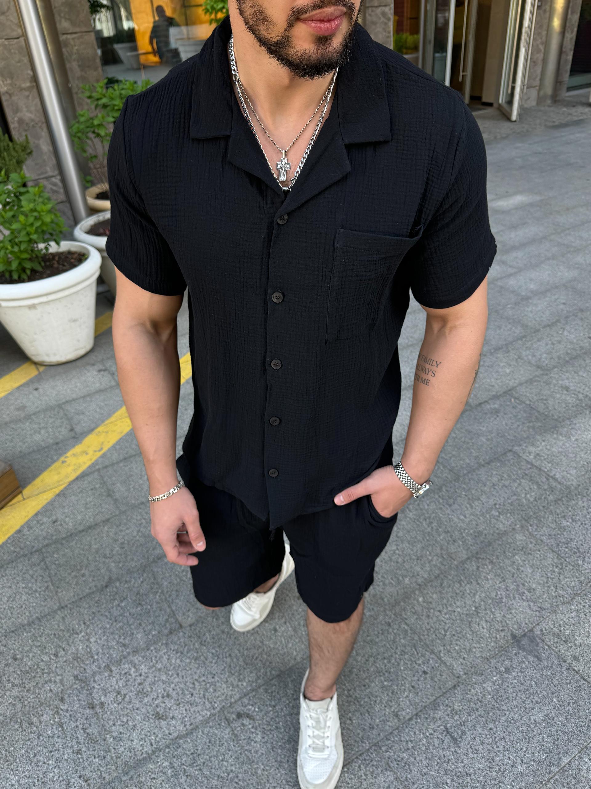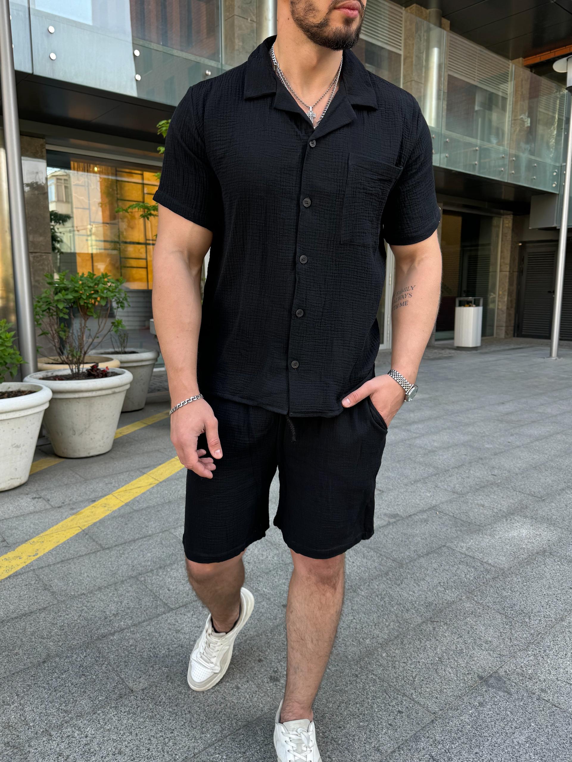 Мужской Черный Легкий Летний Муслиновый Костюм Комплект (Рубашка + Шорты)
