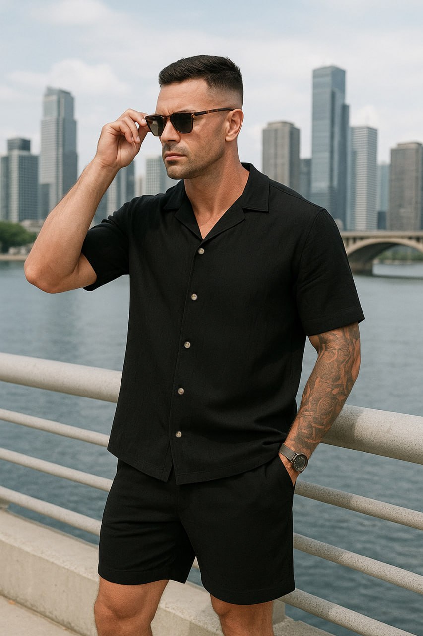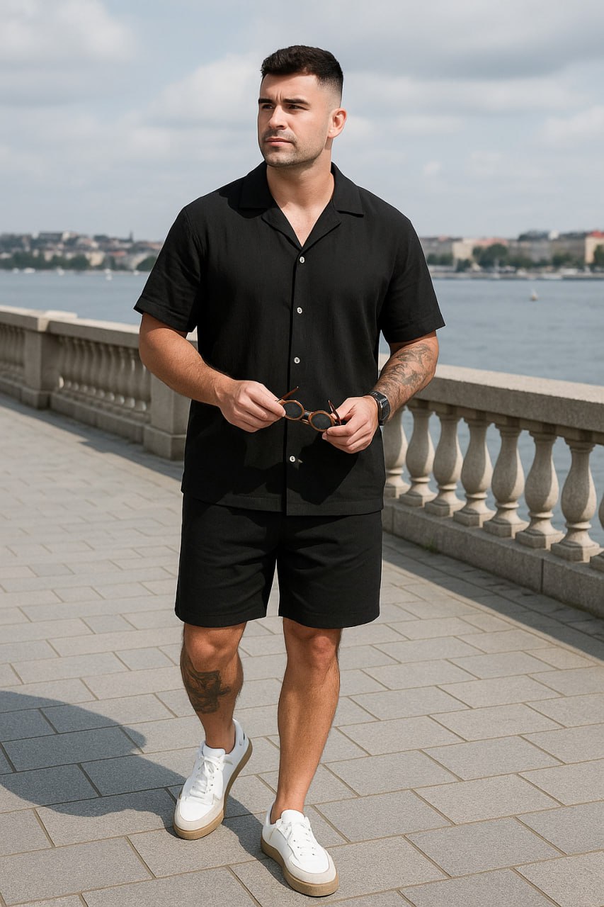 Мужской Черный Летний Костюм Лен – Рубашка с Коротким Рукавом + Шорты