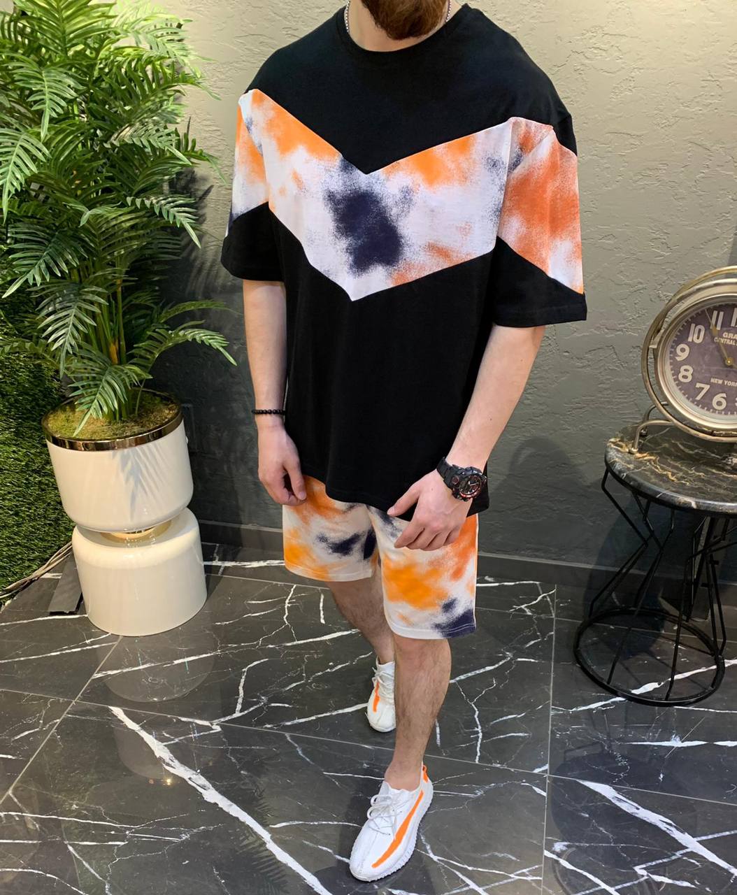 Мужской Черный Оранжевый Летний Комплект – с Разноцветными Пятнистыми Шортами и Вставкой на Футболке