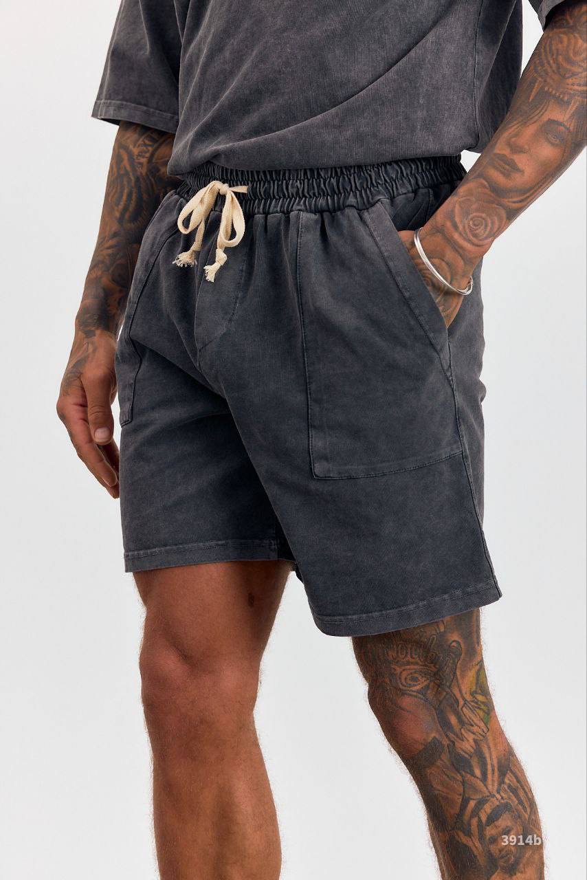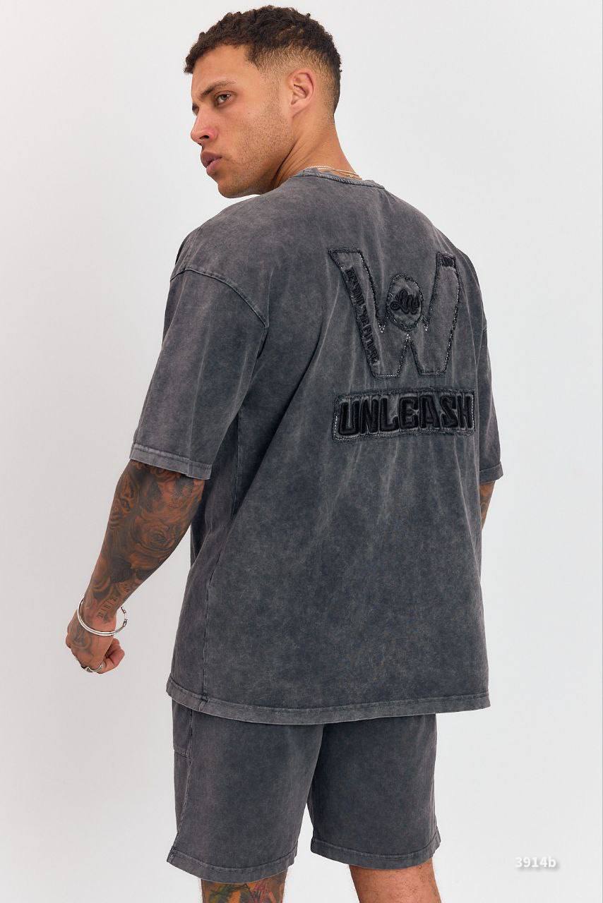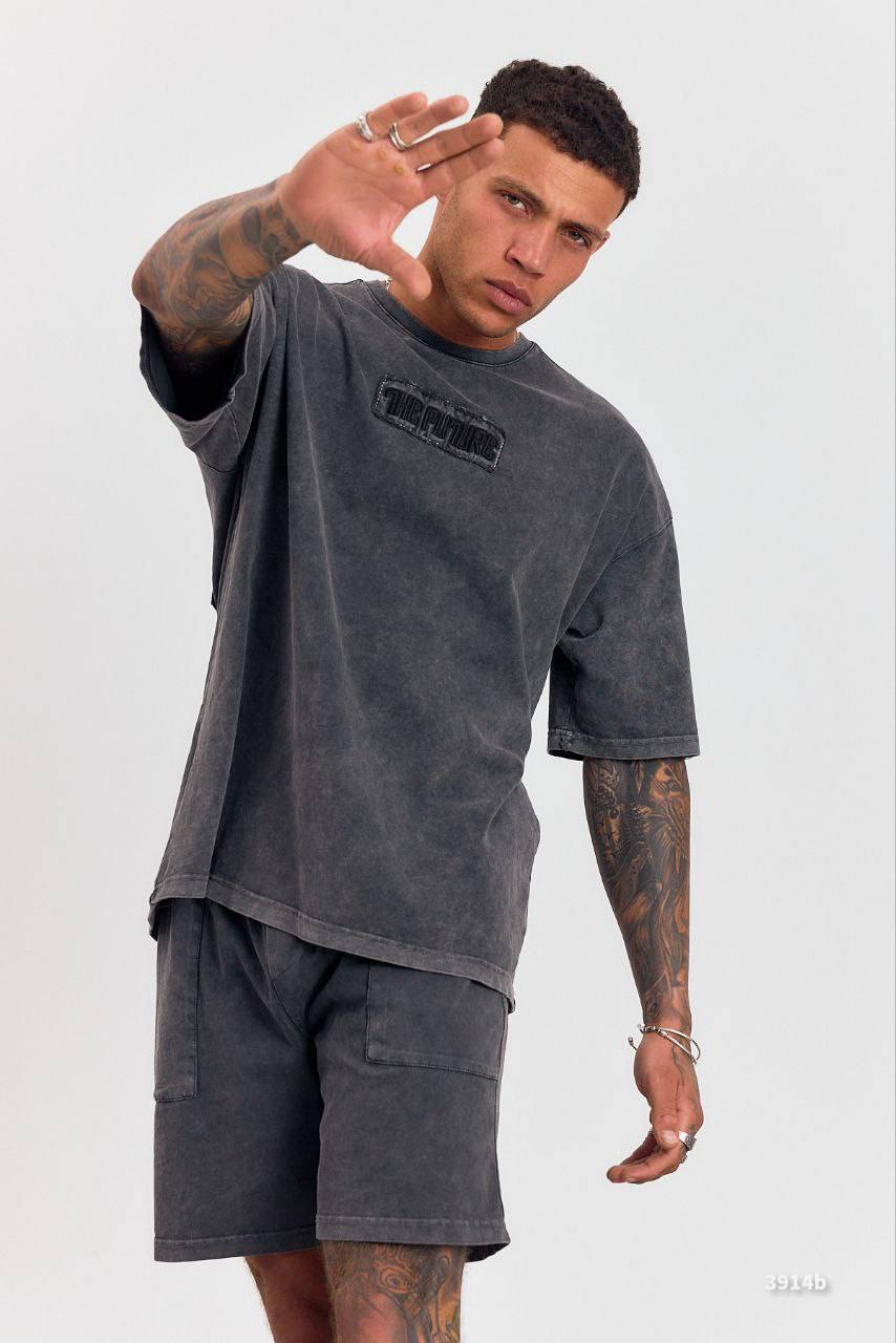 Мужской Графитовый Летний Костюм Двунитка Варенка с Вышивкой (Футболка + Шорты)