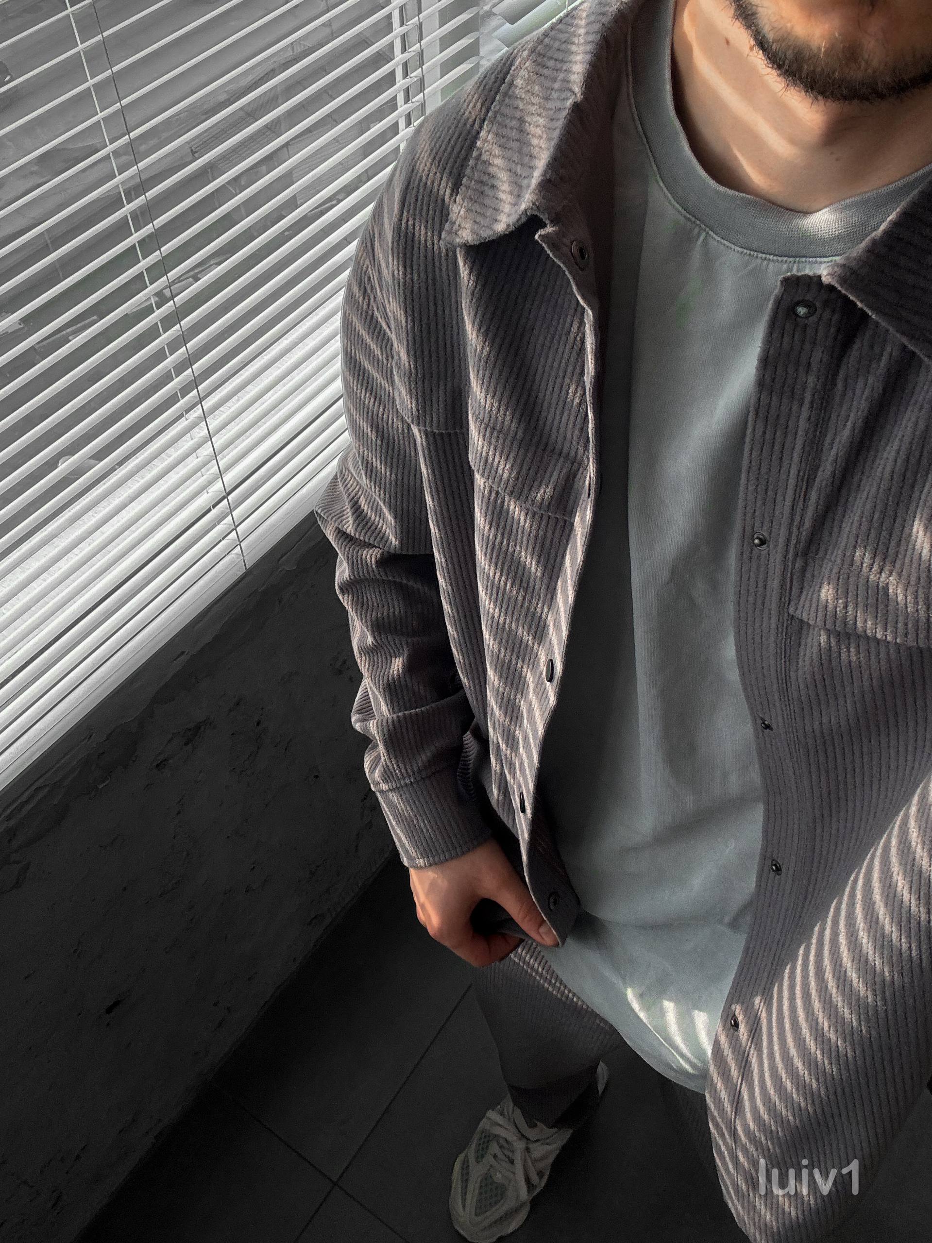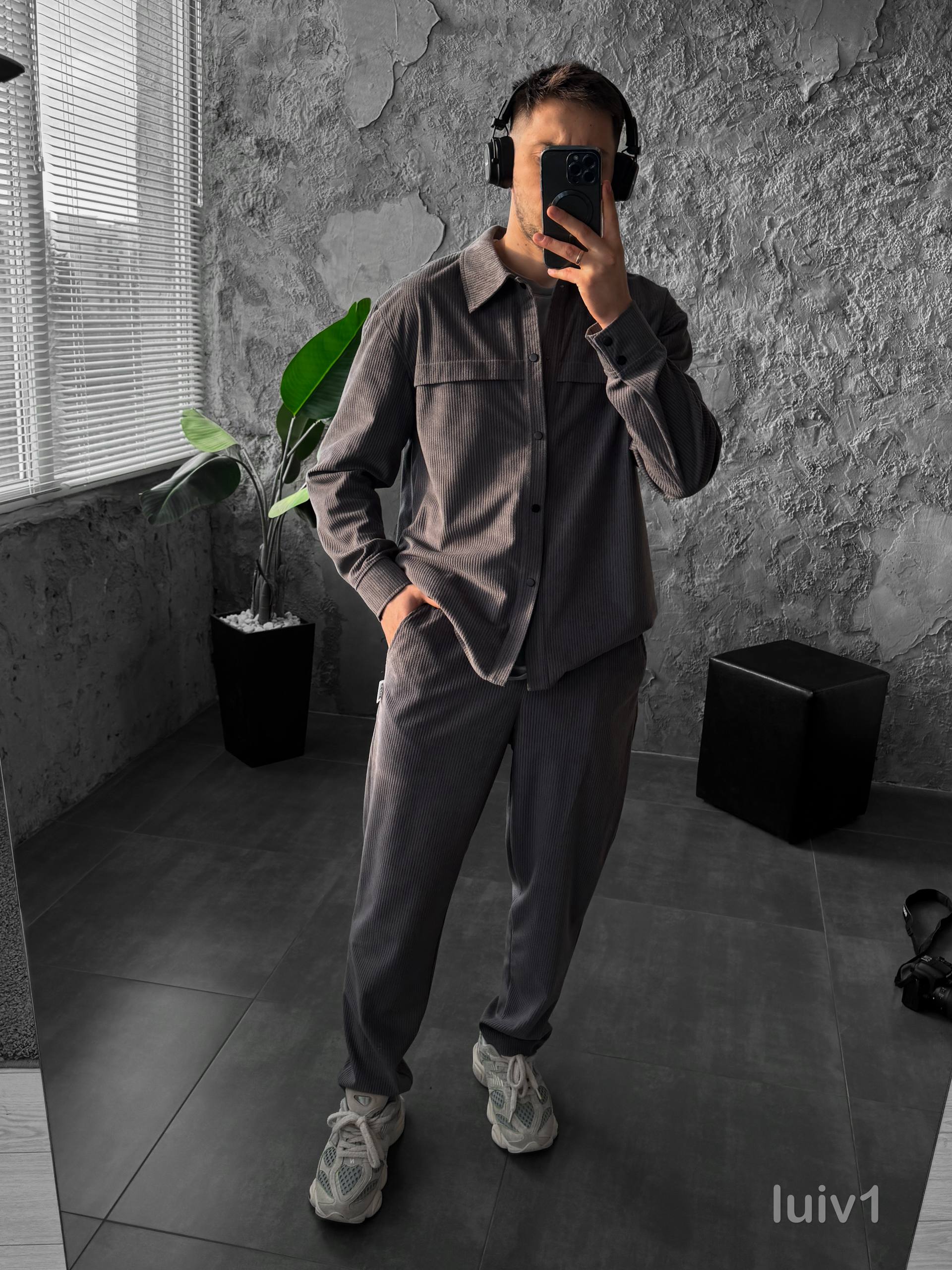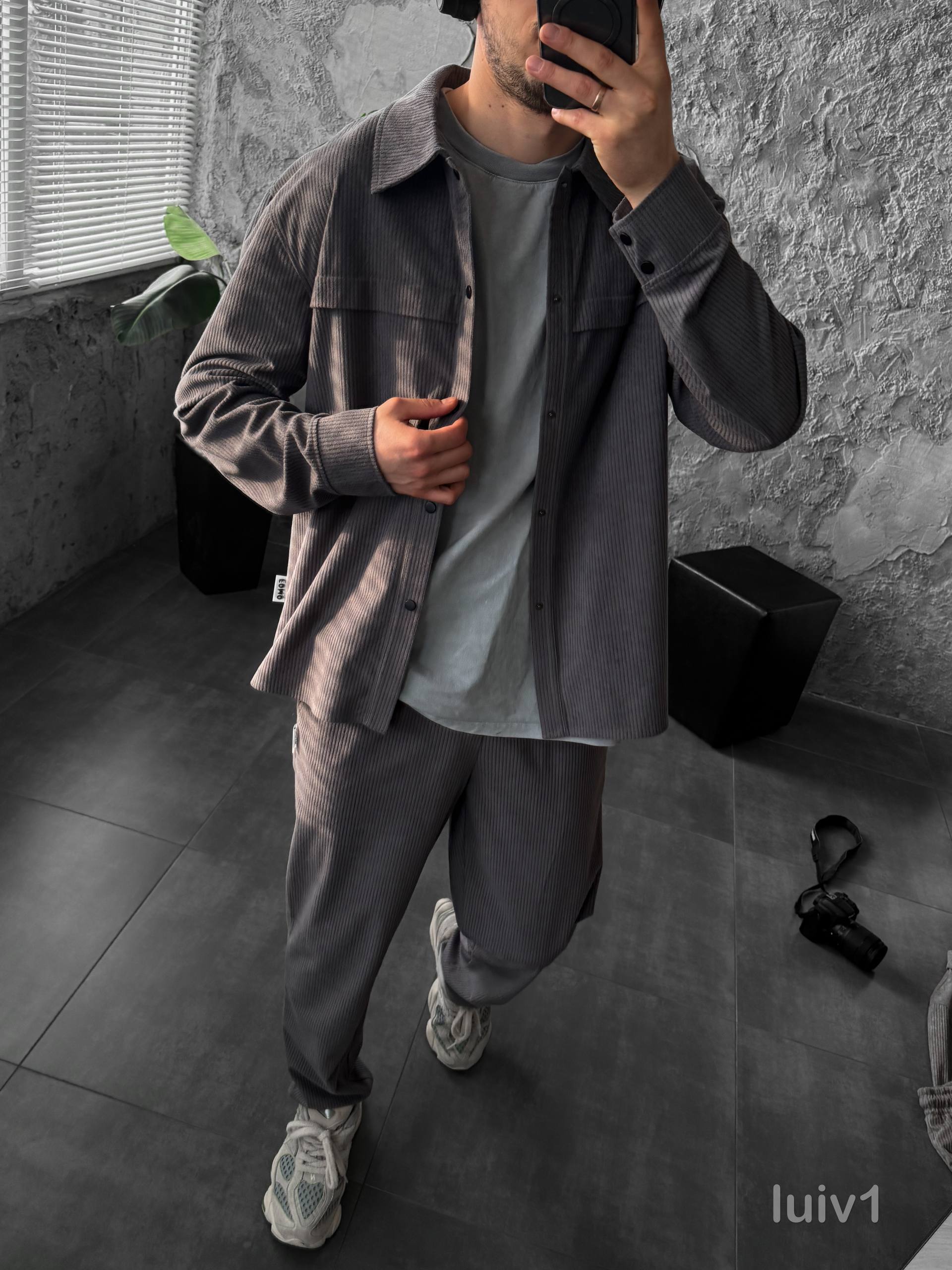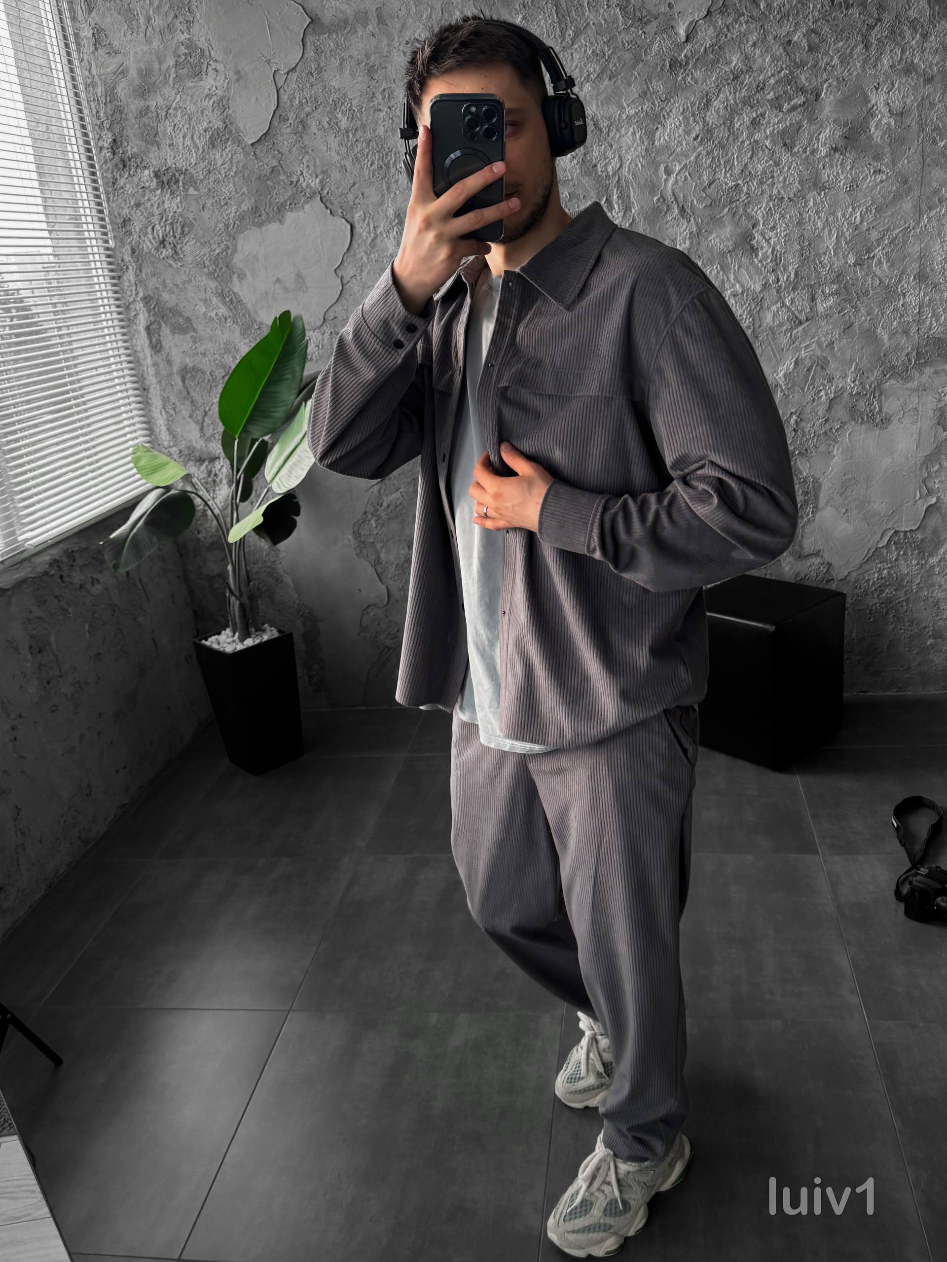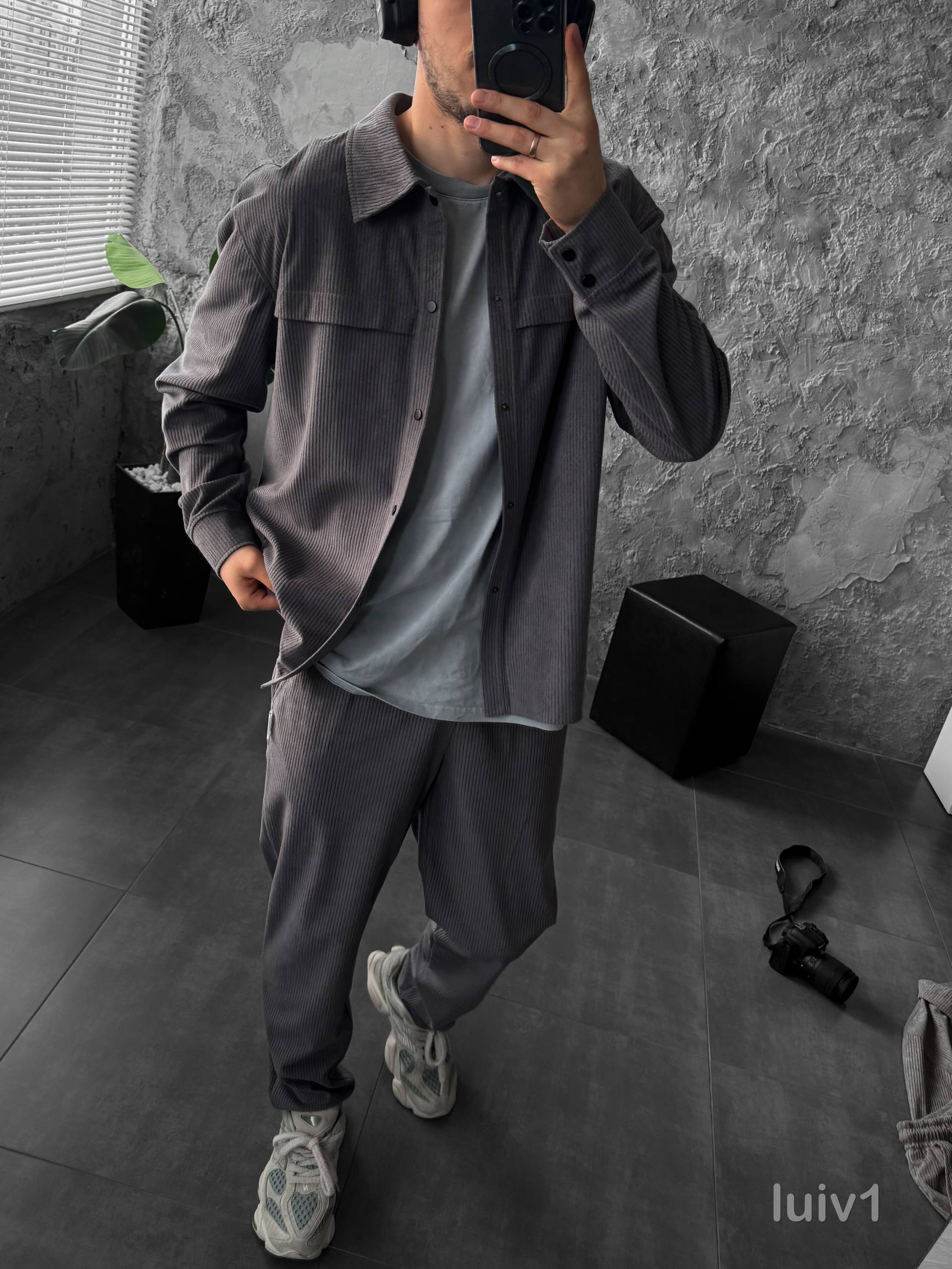 Мужской Графитовый Свободный Вельветовый Костюм – Рубашка на Кнопках + Брюки