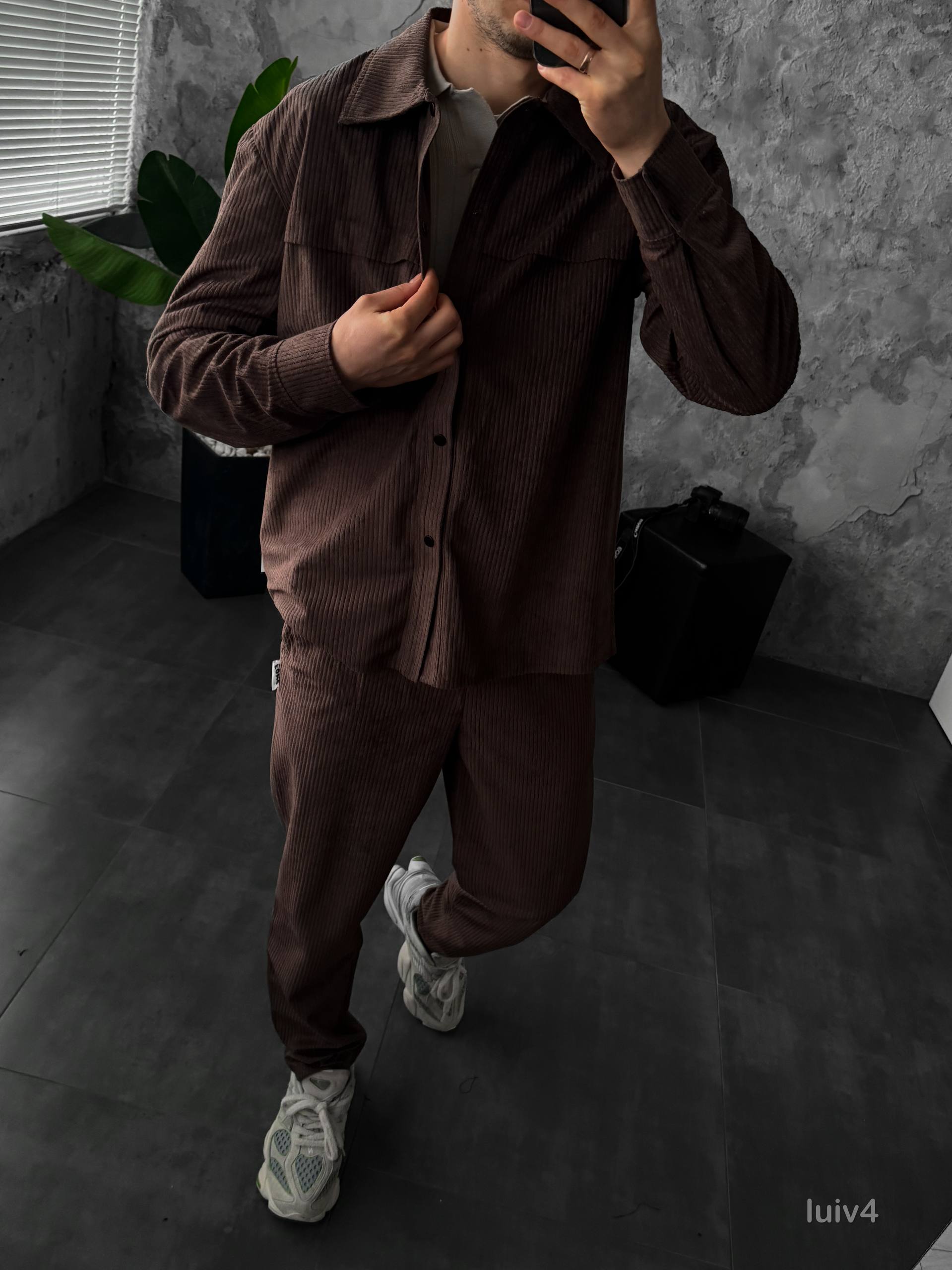 Мужской Коричневый Свободный Вельветовый Костюм – Рубашка на Кнопках + Брюки