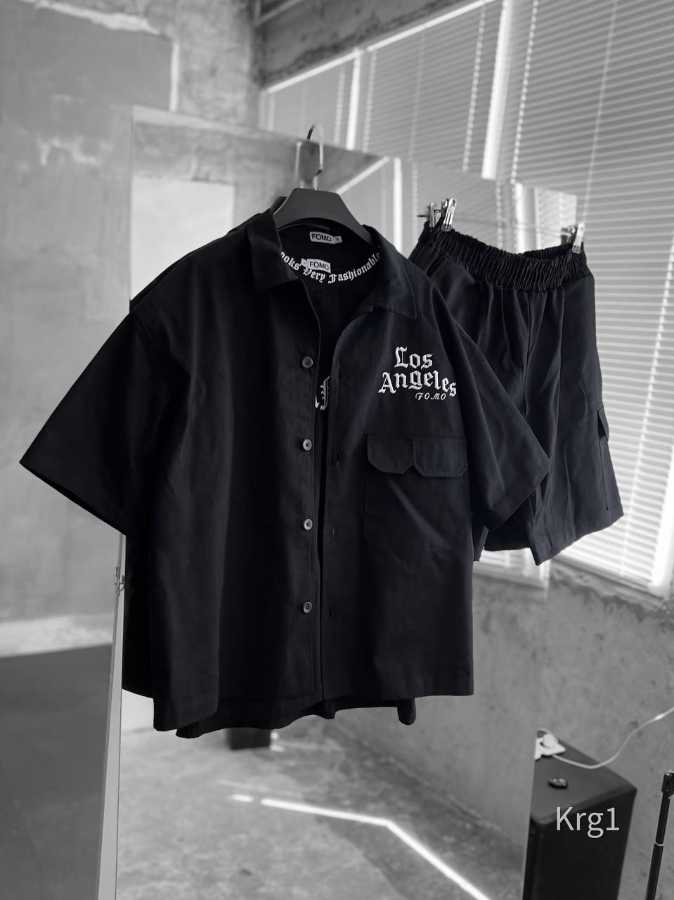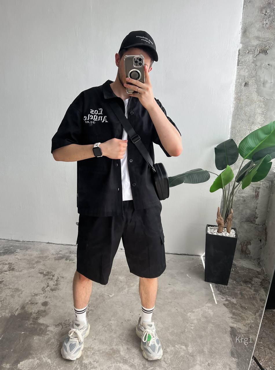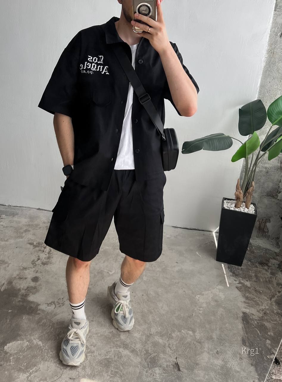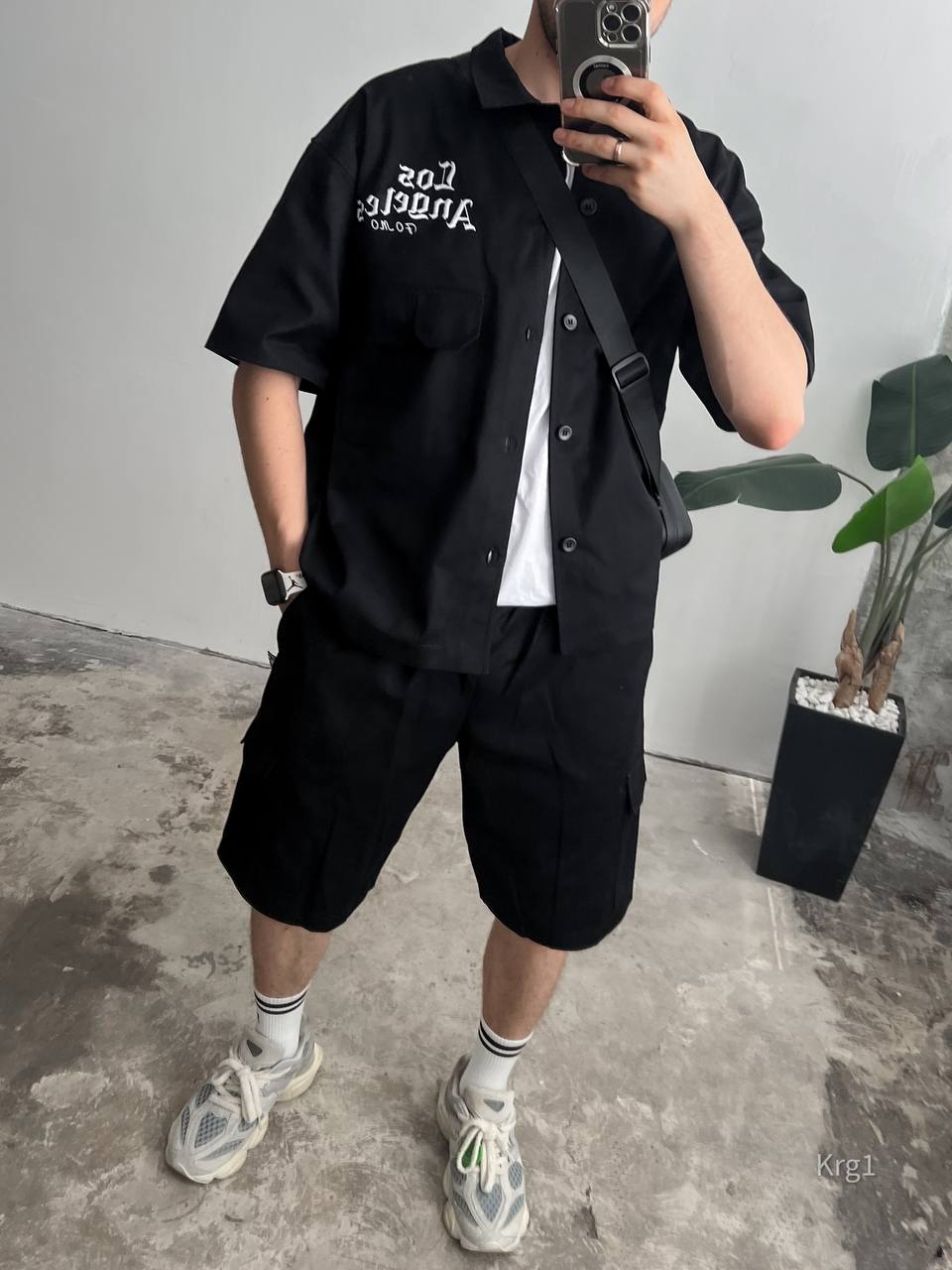 Мужской Коттоновый Черный Летний Костюм Рубашка Шорты Свободного Кроя с Вышивкой и Накладными Карманами