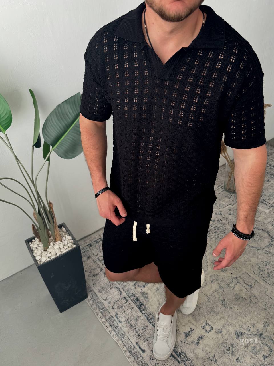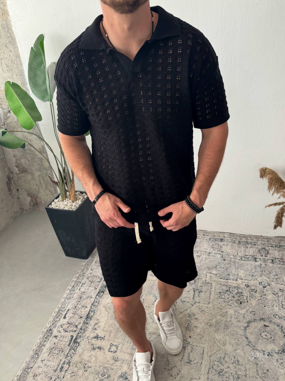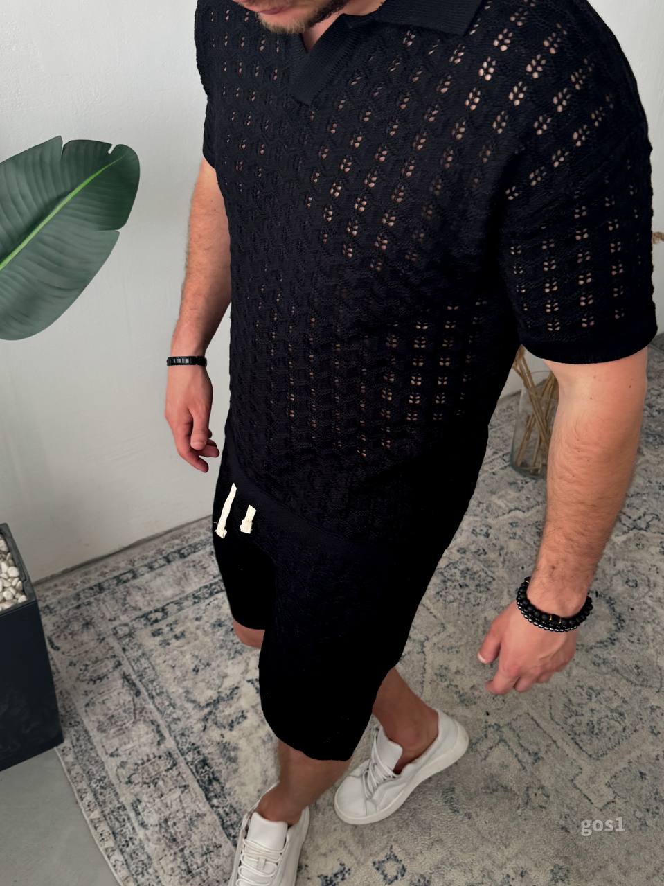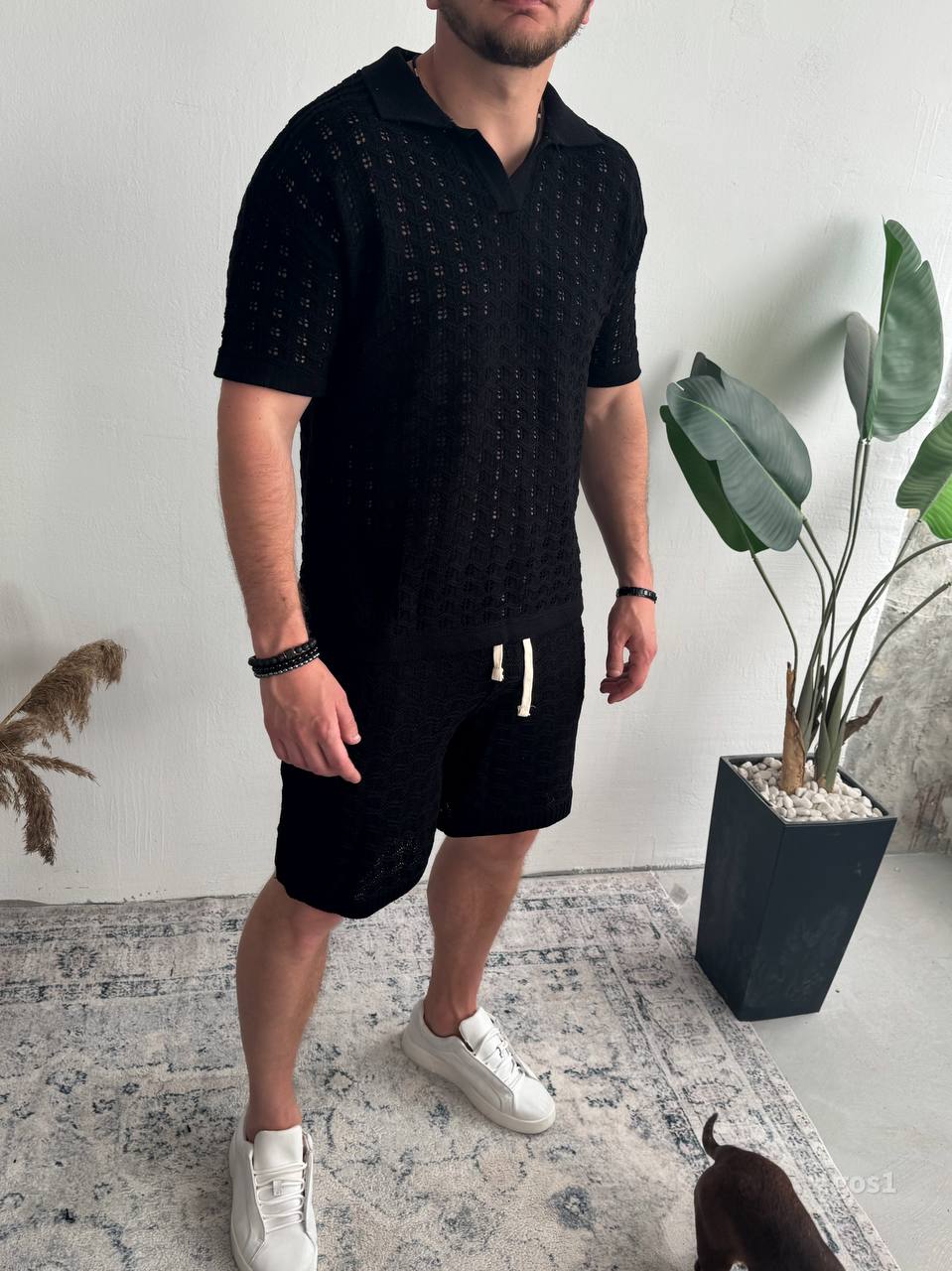 Мужской Летний Ажурный Черный Костюм с Перфорацией – Комплект Футболка Шорты