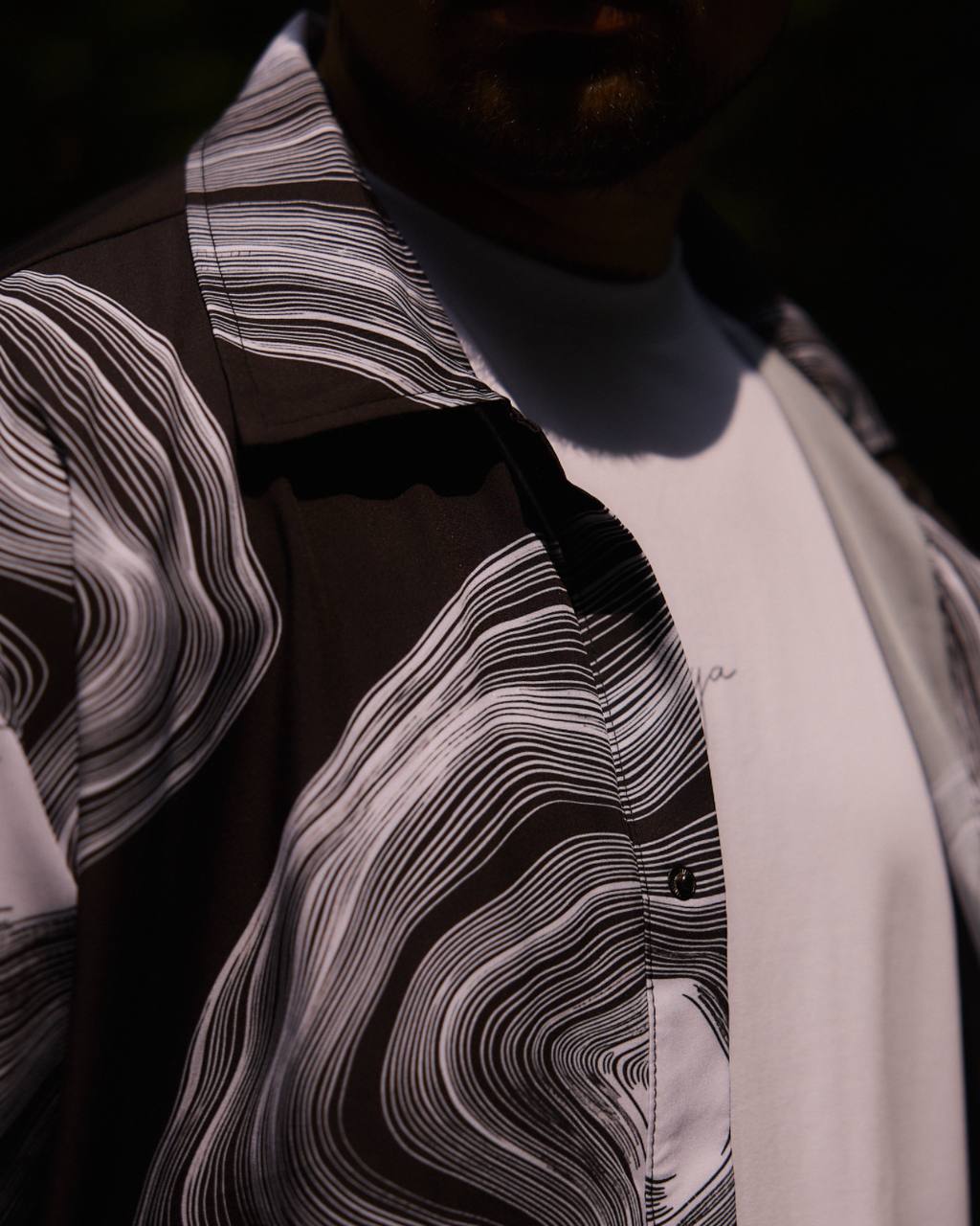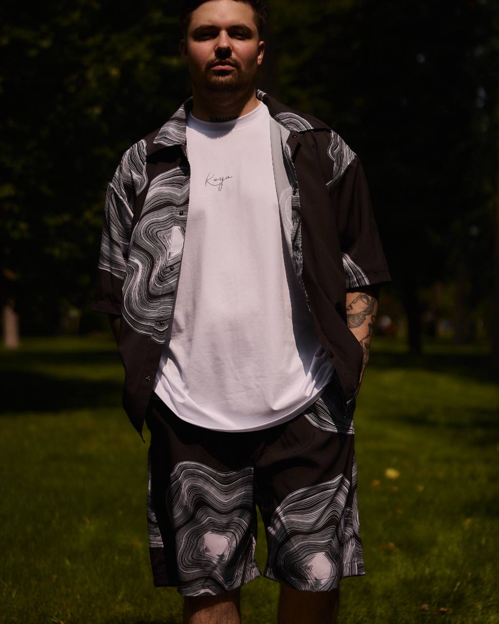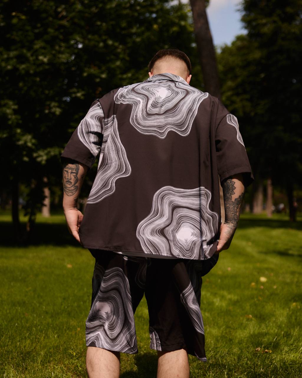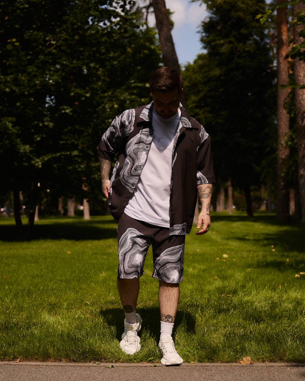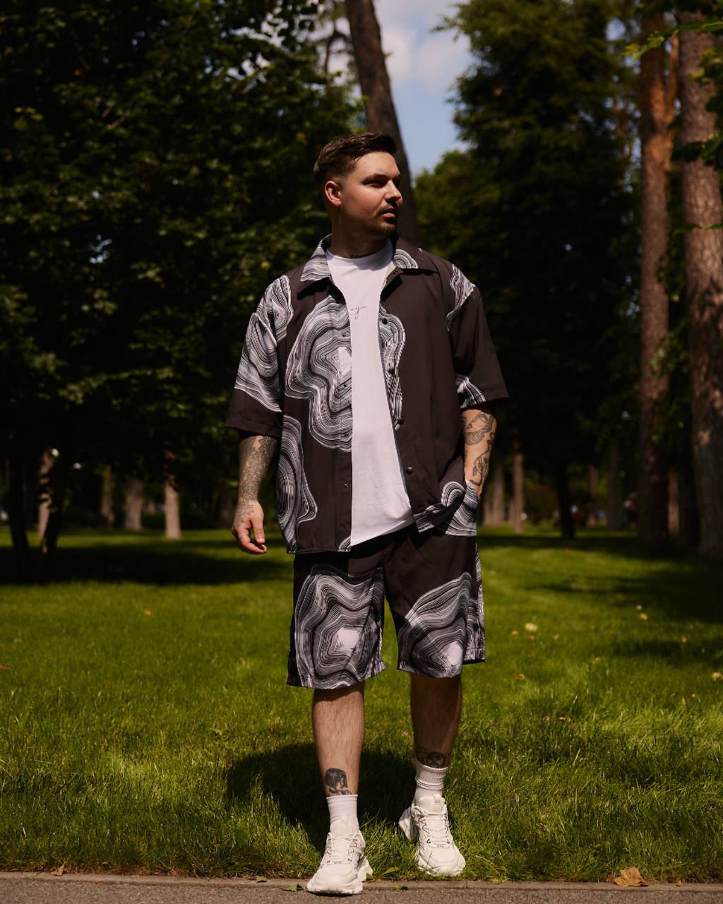 Мужской Летний Черный Комплект Рубашка Шорты Оверсайз в Принт Разводы