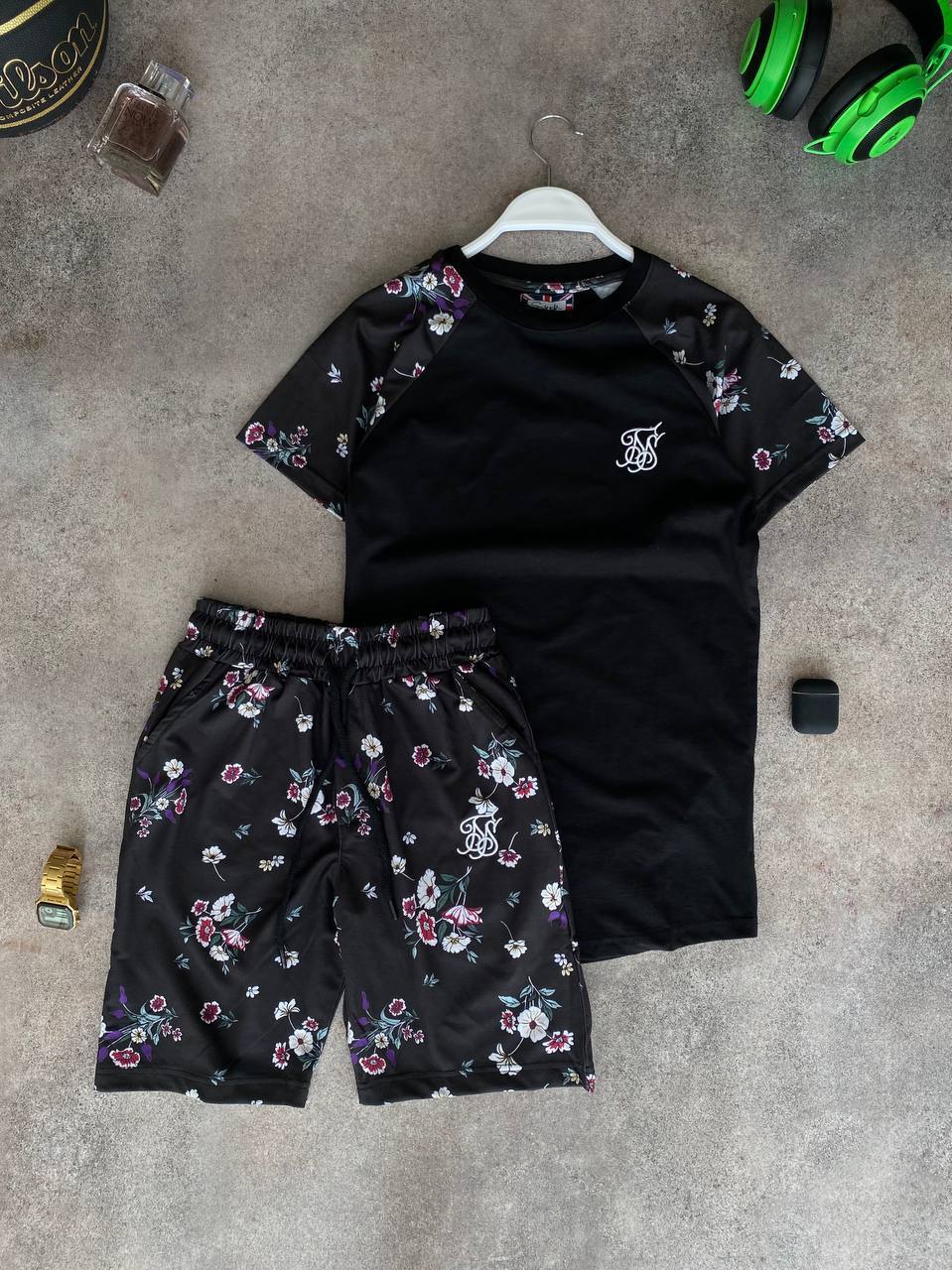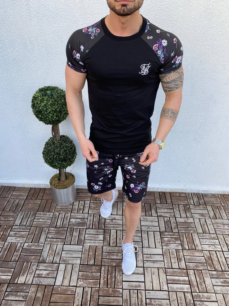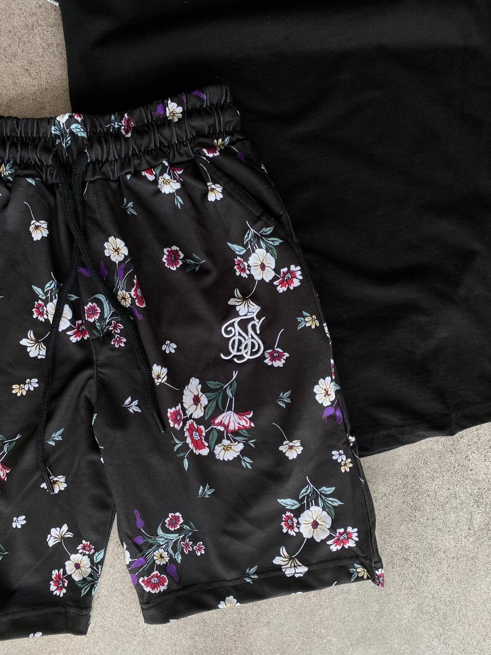 Мужской Летний Черный Комплект с Цветочным Принтом на Шортах и Рукавах (Футболка + Шорты)