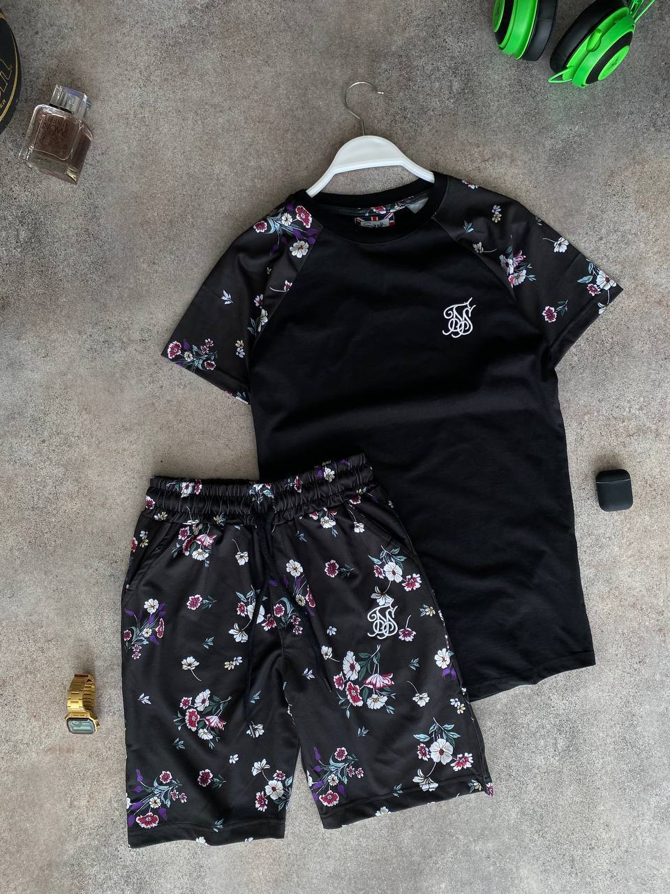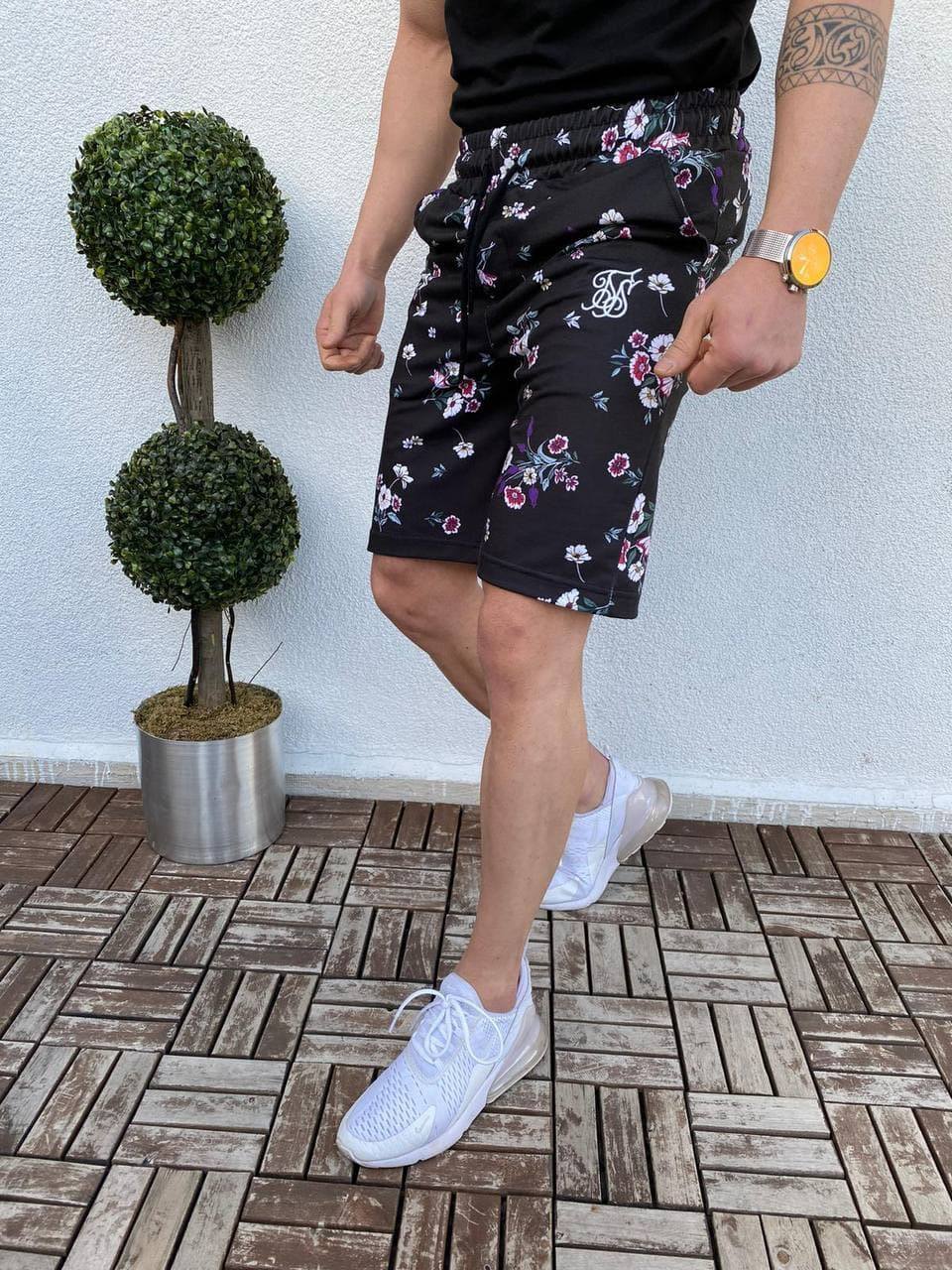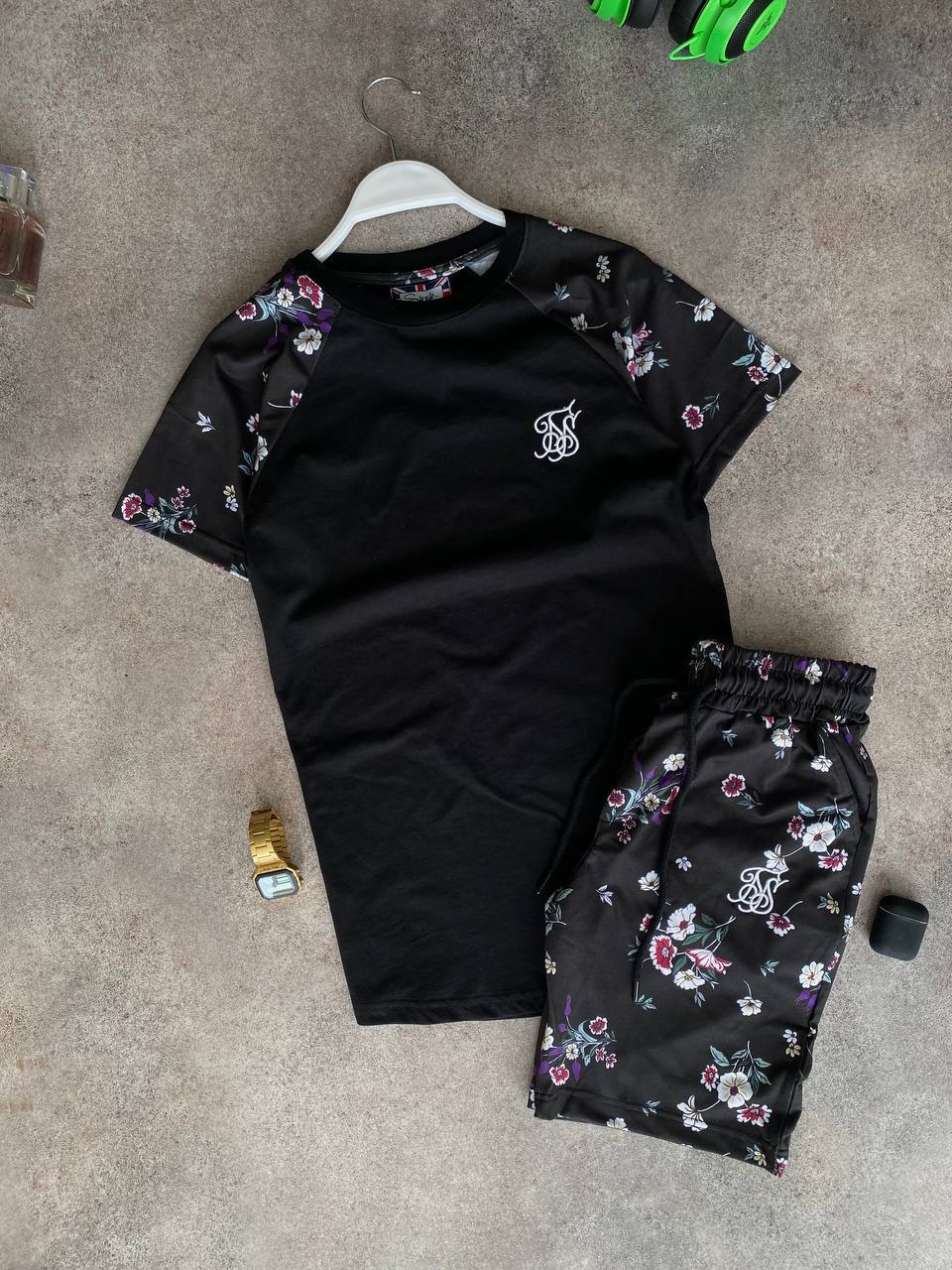 Мужской Летний Черный Комплект с Цветочным Принтом на Шортах и Рукавах (Футболка + Шорты)