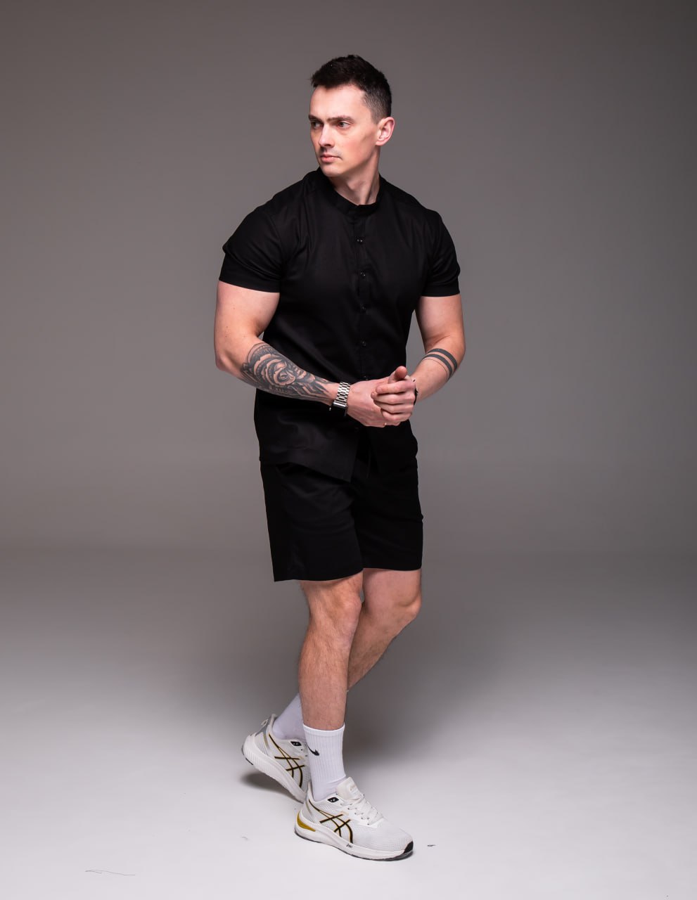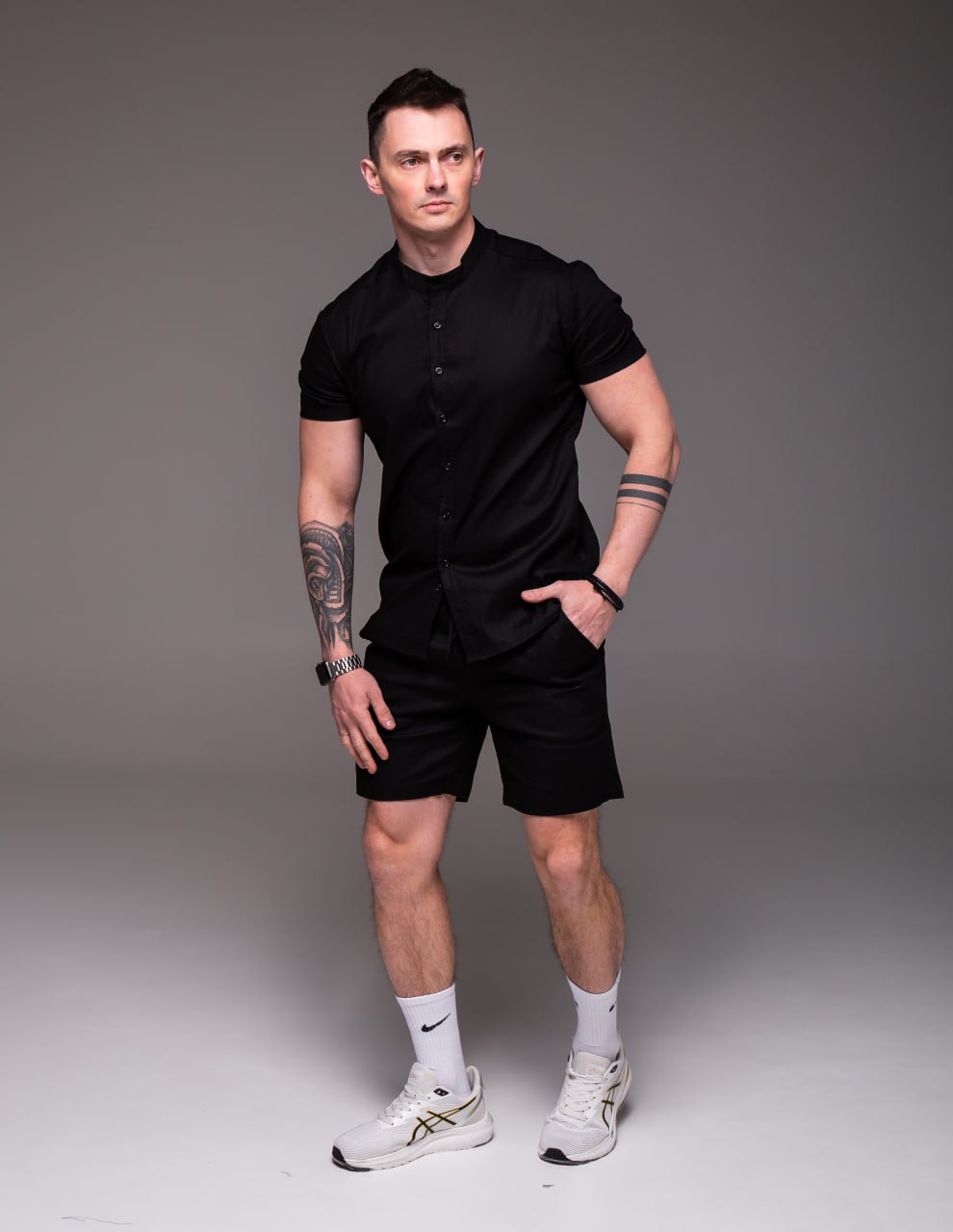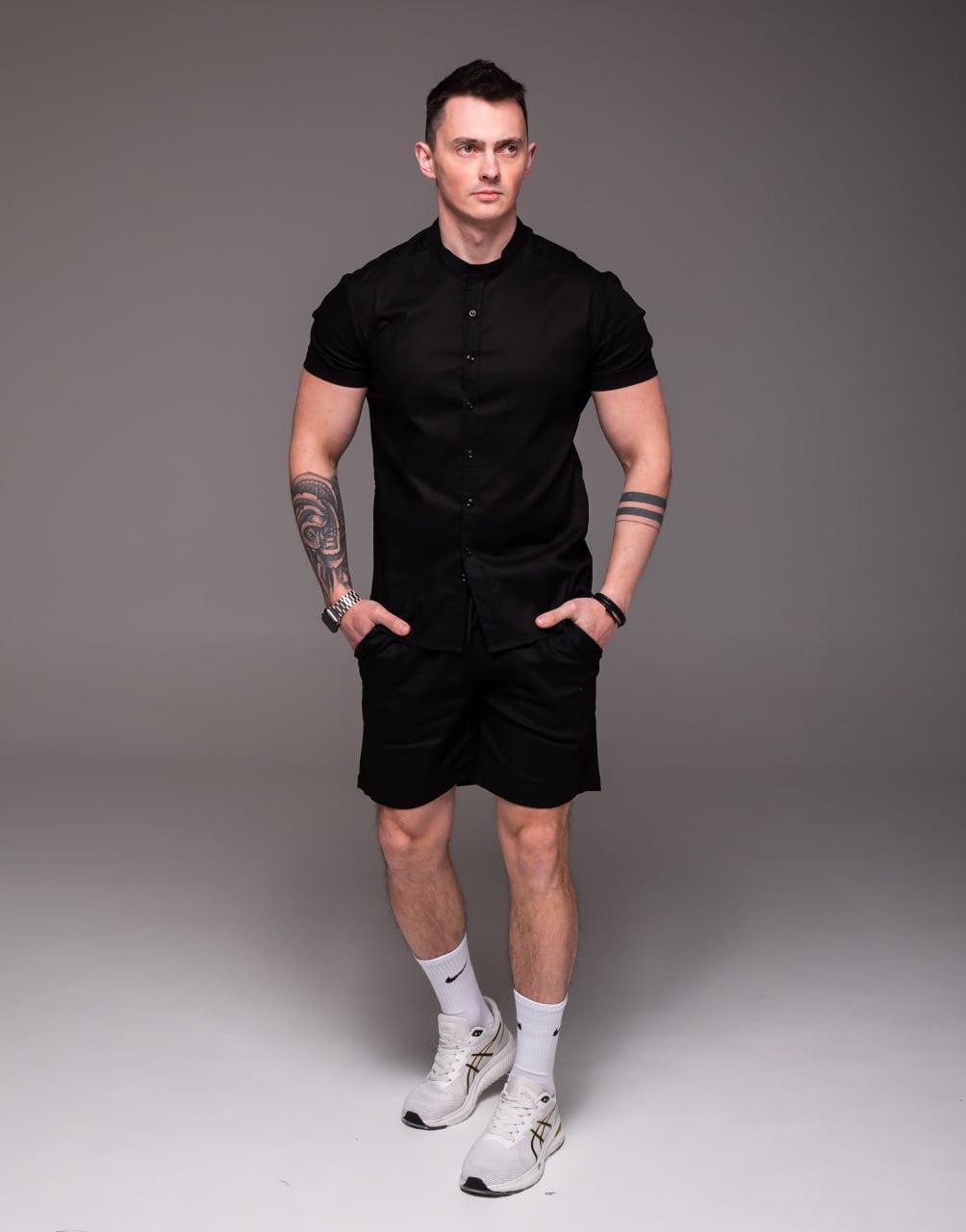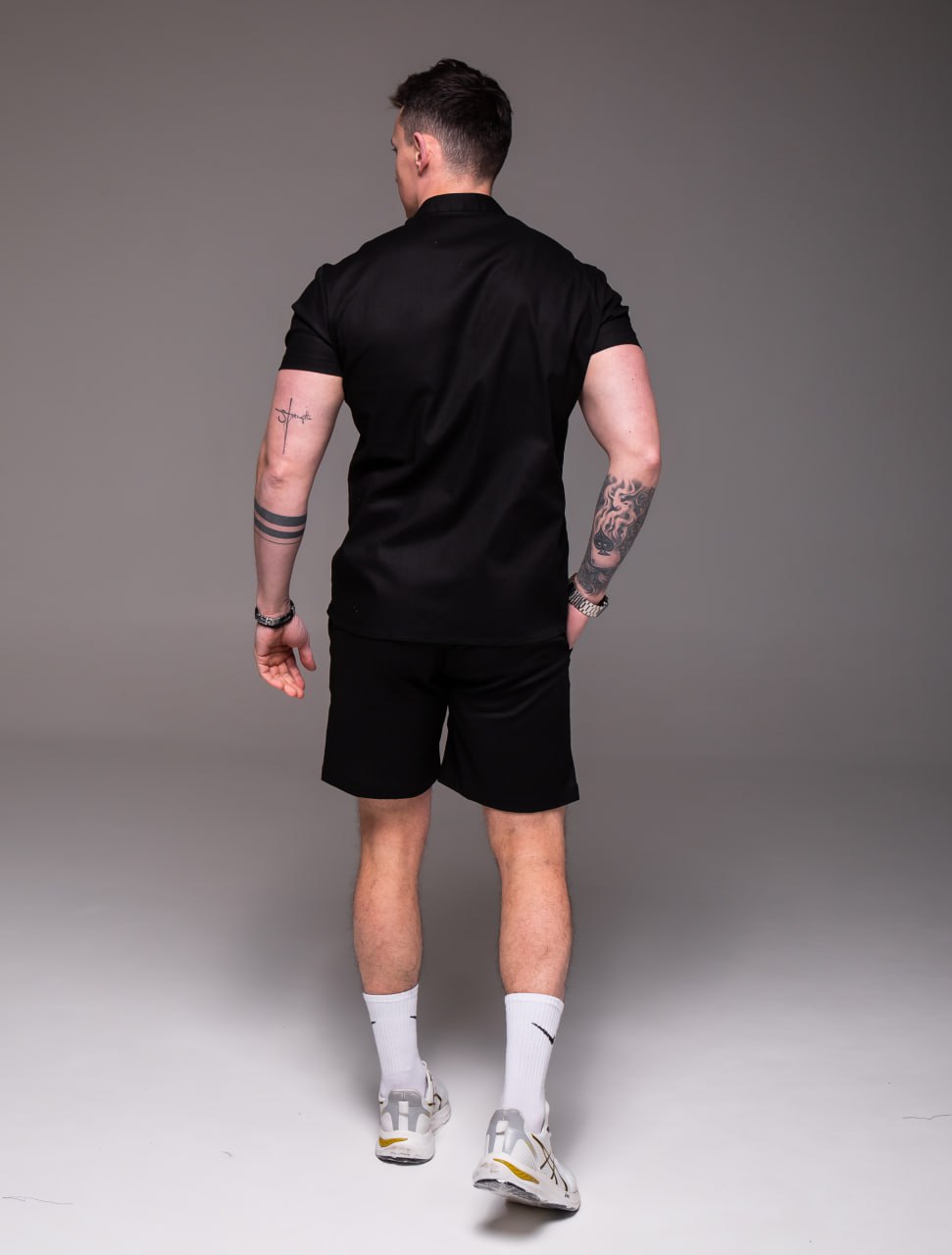 Мужской Летний Черный Костюм Лен – Базовый Комплект Рубашка Шорты