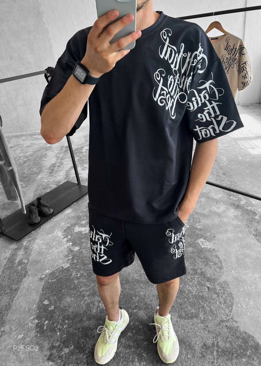 Мужской Летний Графитовый Комплект Футболка Шорты – Свободный Хлопковый с Надписью
