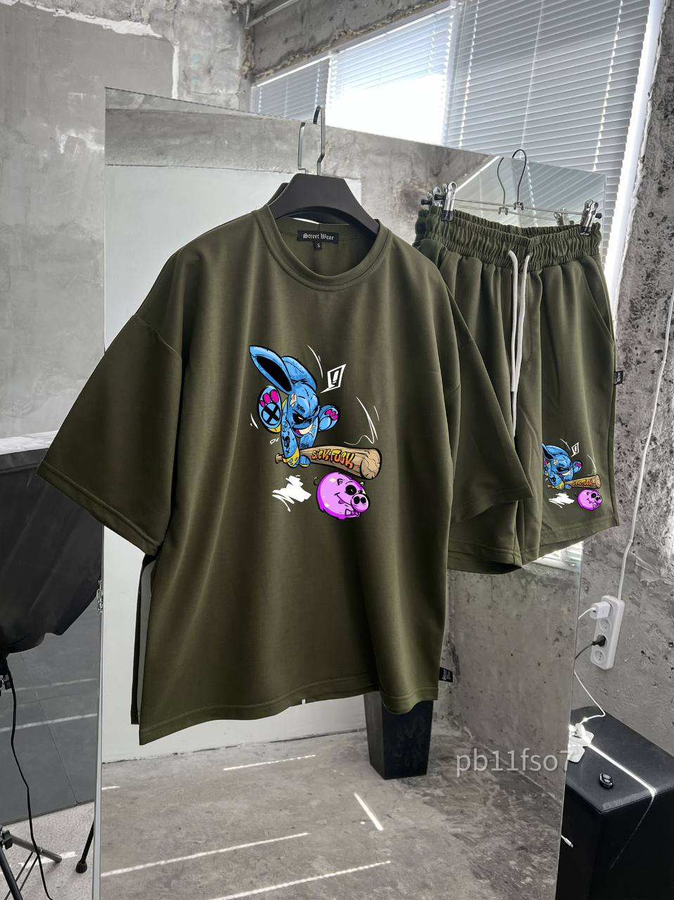 Мужской Летний Комплект Футболка Шорты Хаки – Хлопковый с Принтом Заец с Битой