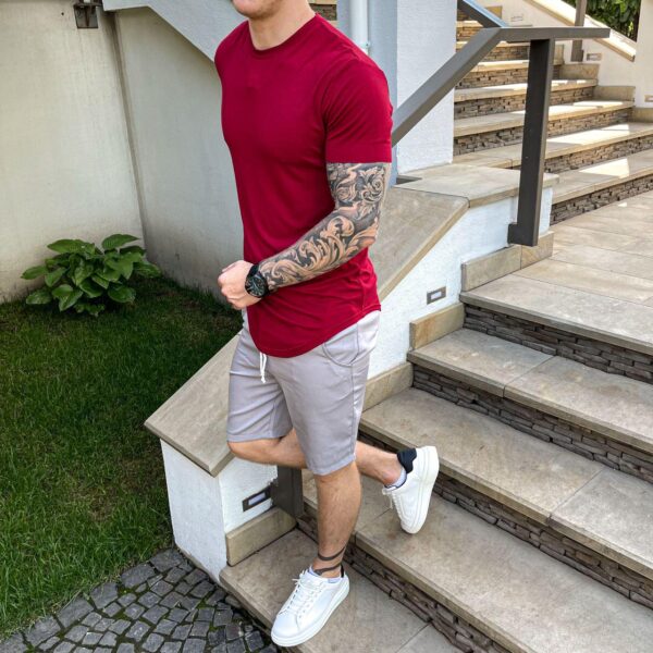 Мужской Летний Комплект Классический Базовый – Приталенная Красная Футболка Лонг + Серые Шорты на Шнурках