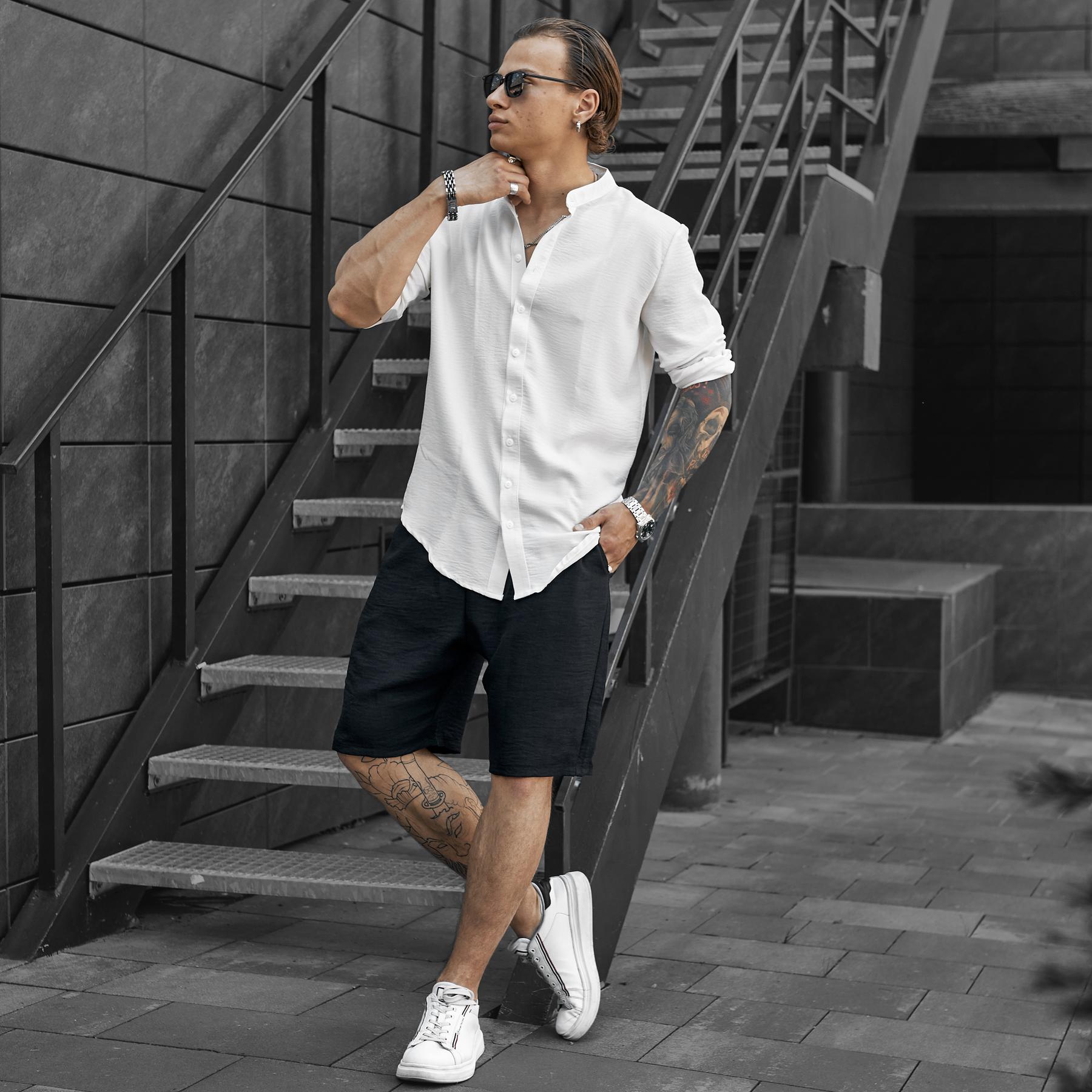 Мужской Летний Костюм Комплект Лен База – Белая Рубашка + Черные Шорты