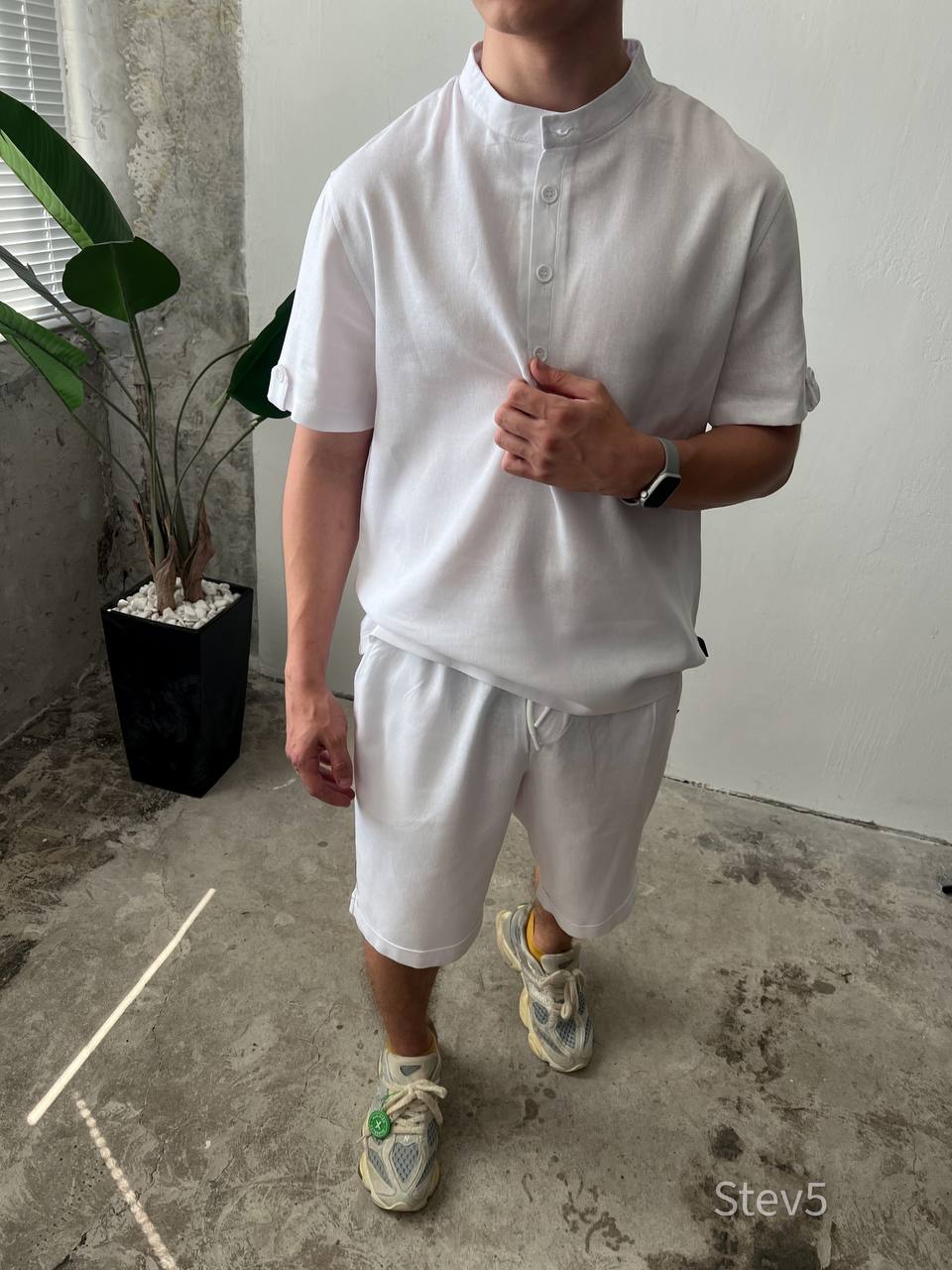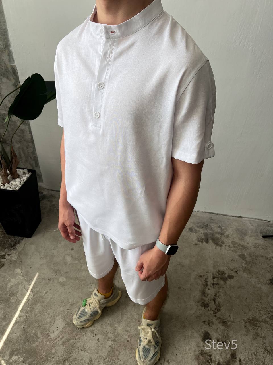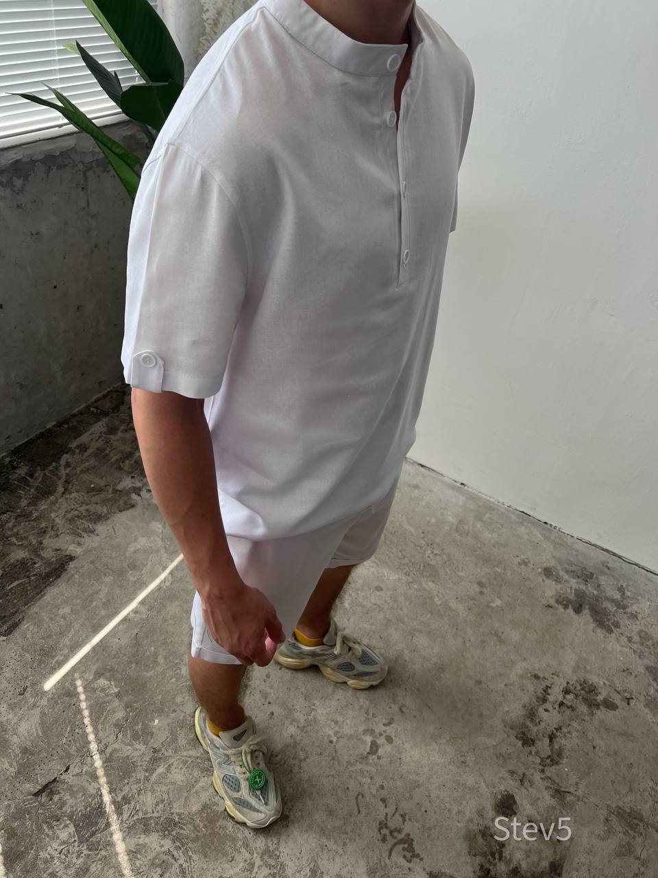Мужской Льняной Белый Летний Костюм Свободного Кроя – Рубашка с Короткими Рукавами + Шорты с Подворотами