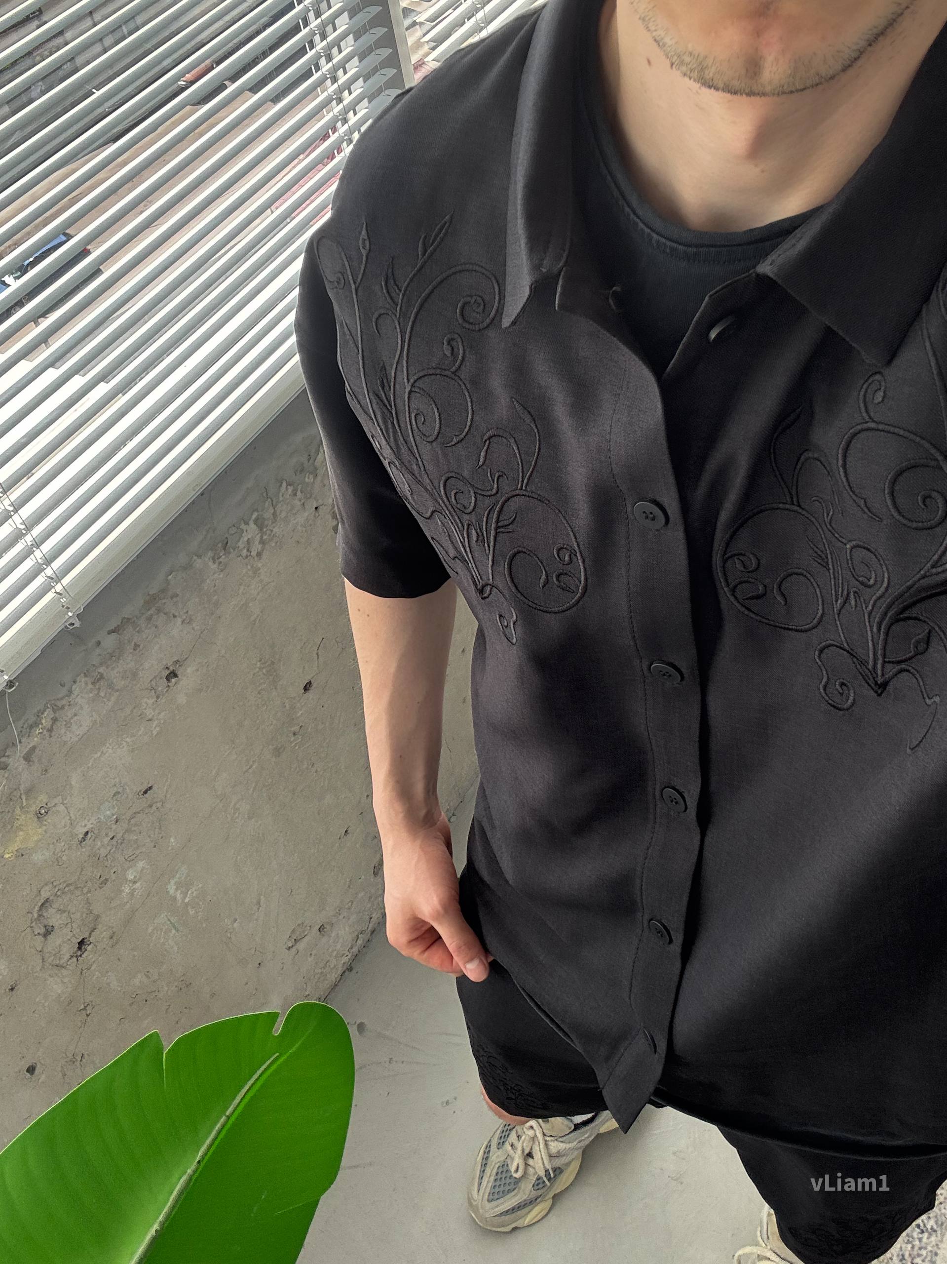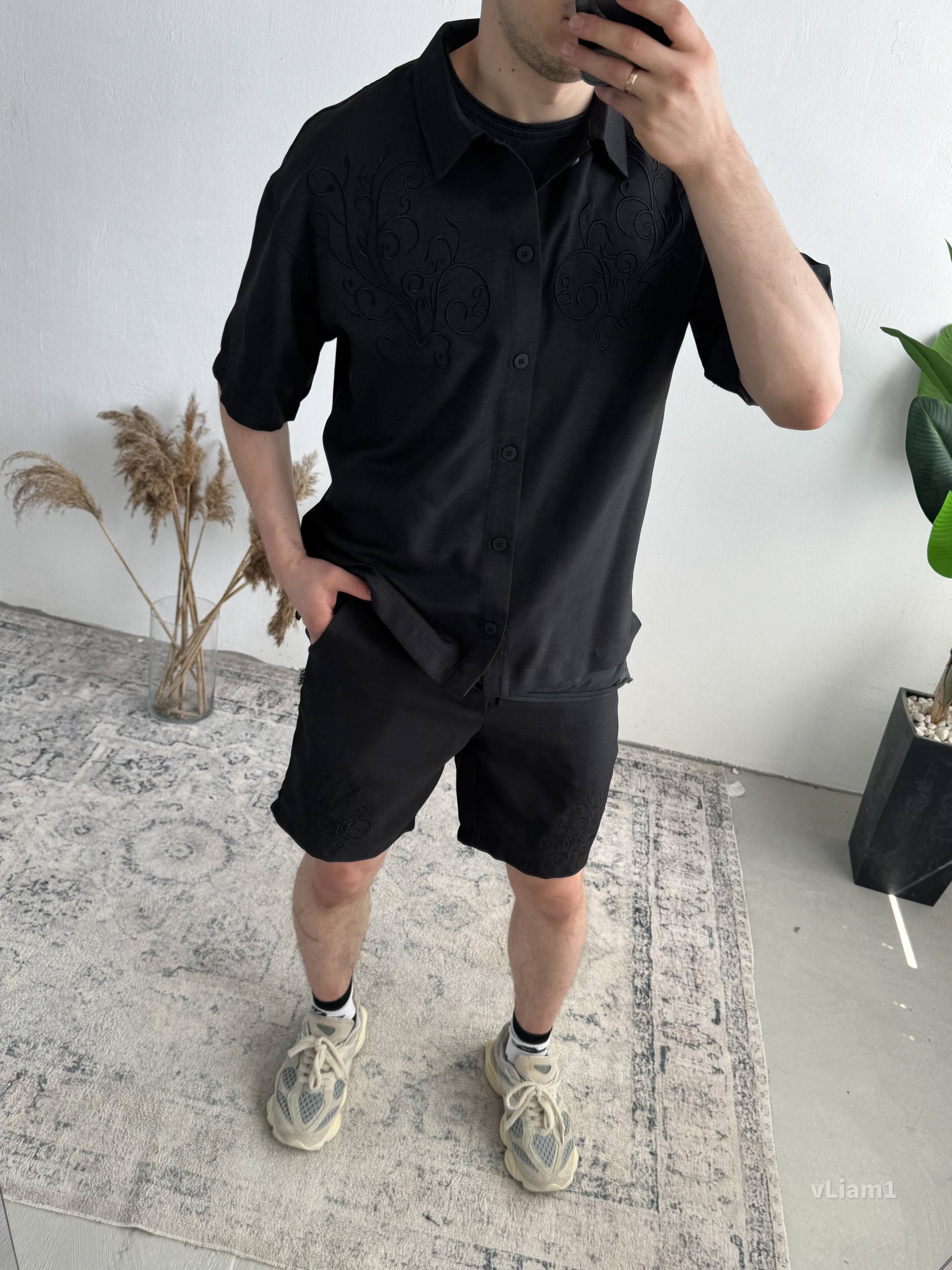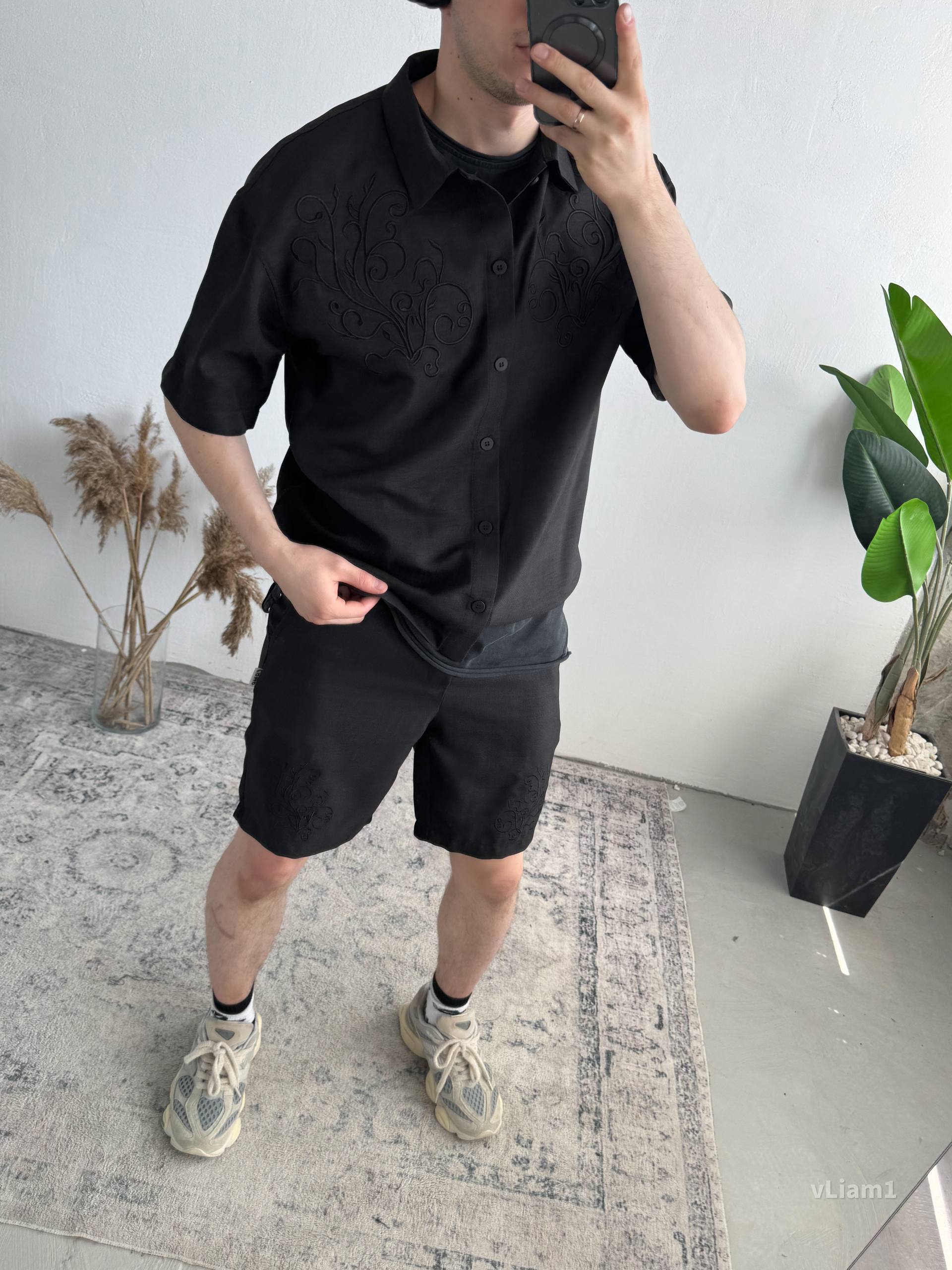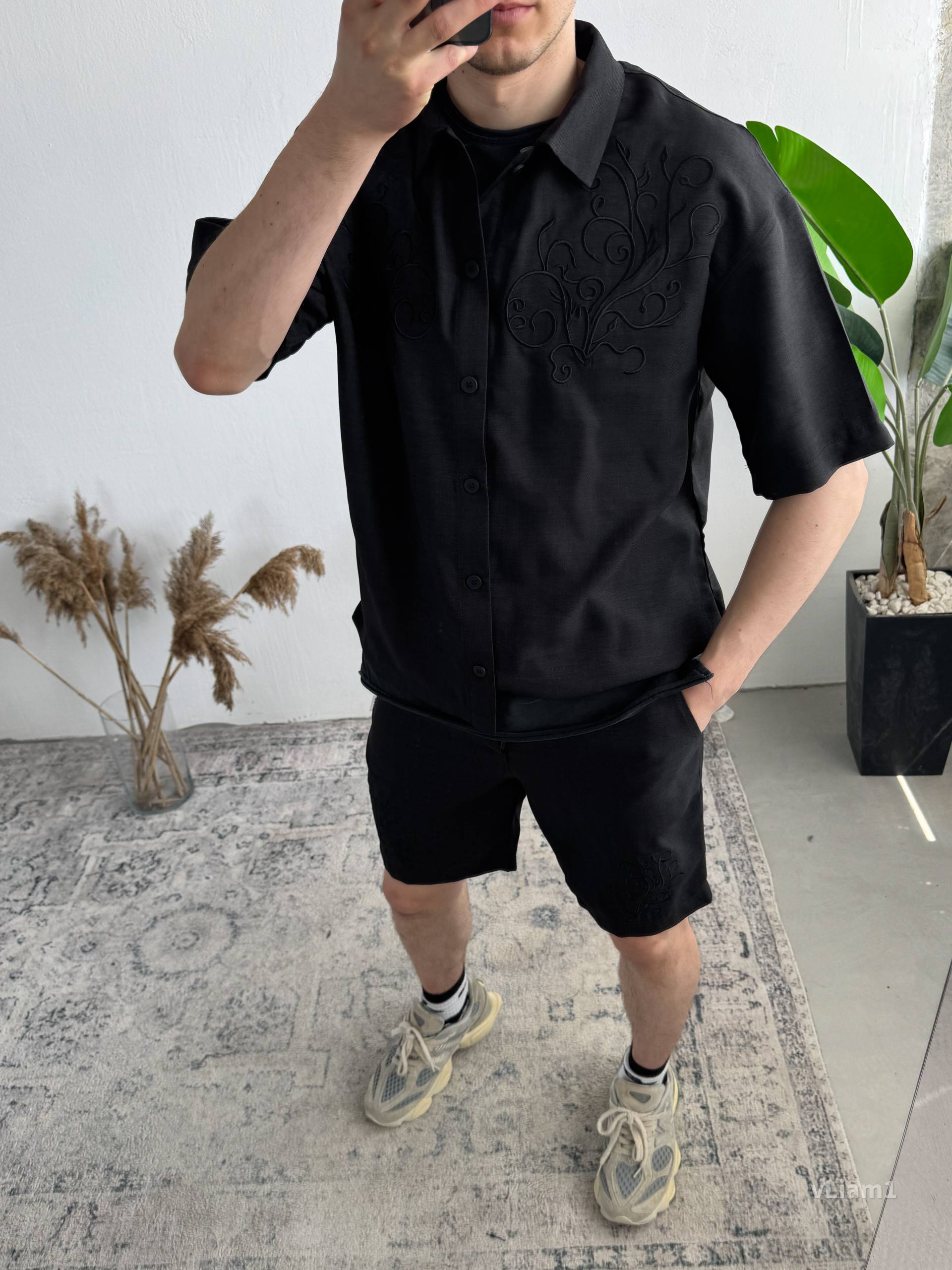 Мужской Льняной Черный Летний Костюм Рубашка Шорты Жатка с Вышивкой