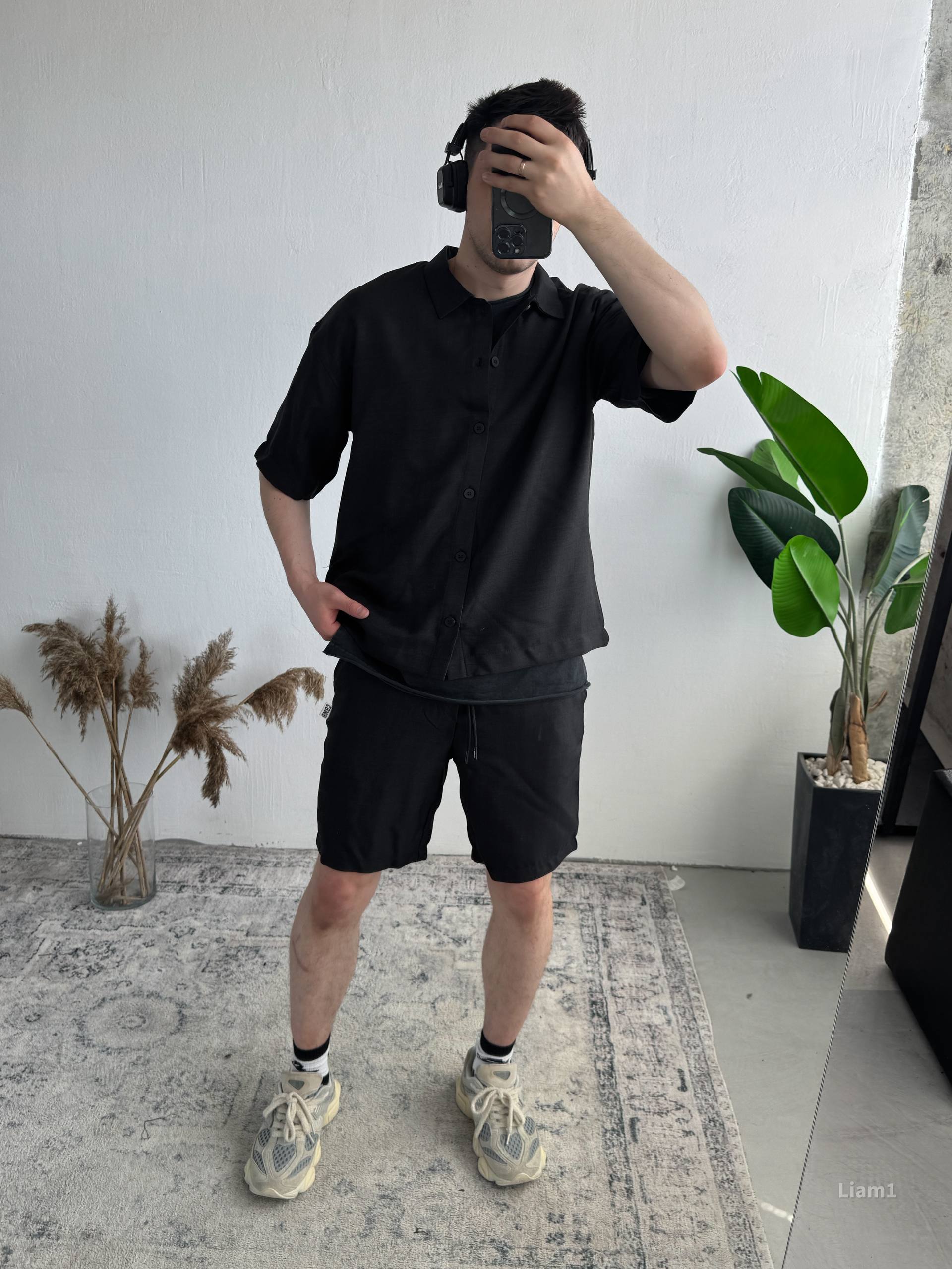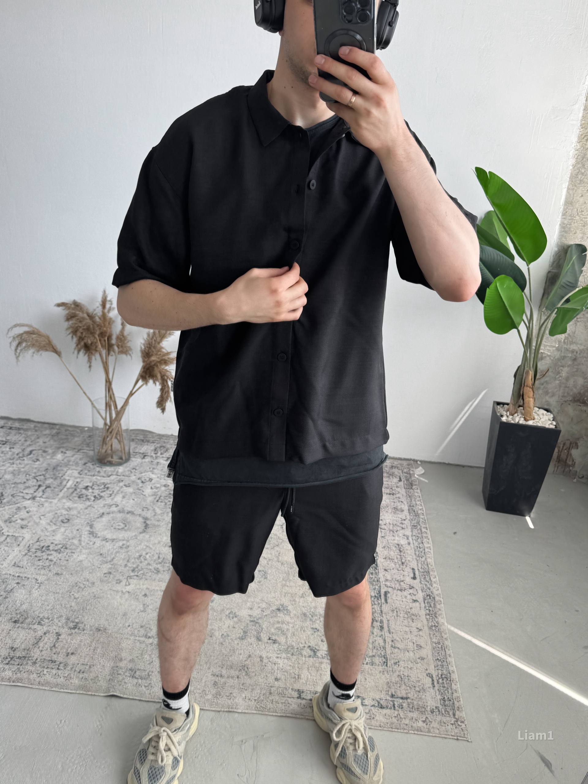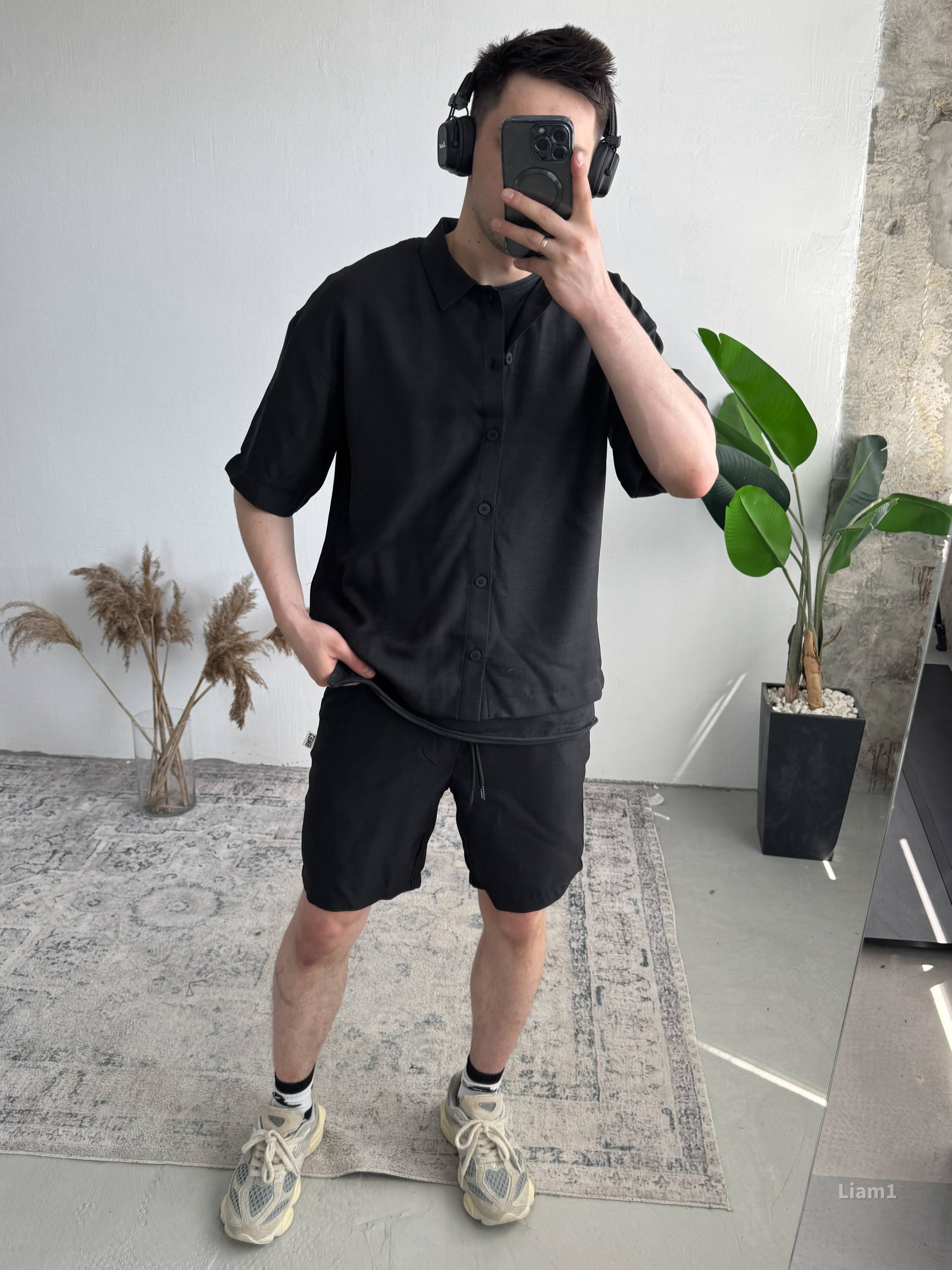 Мужской Льняной Черный Летний Костюм Рубашка Шорты Жатка