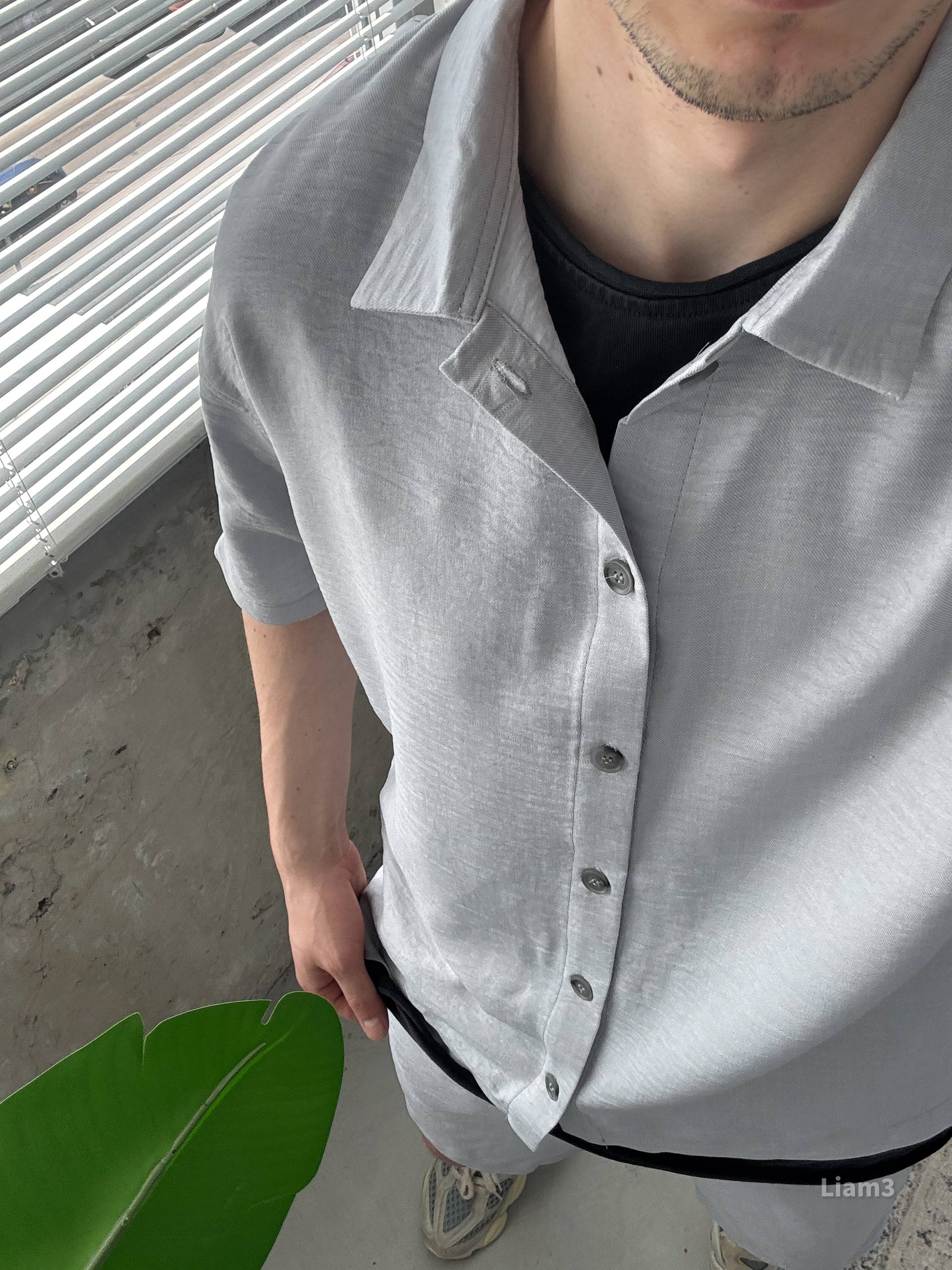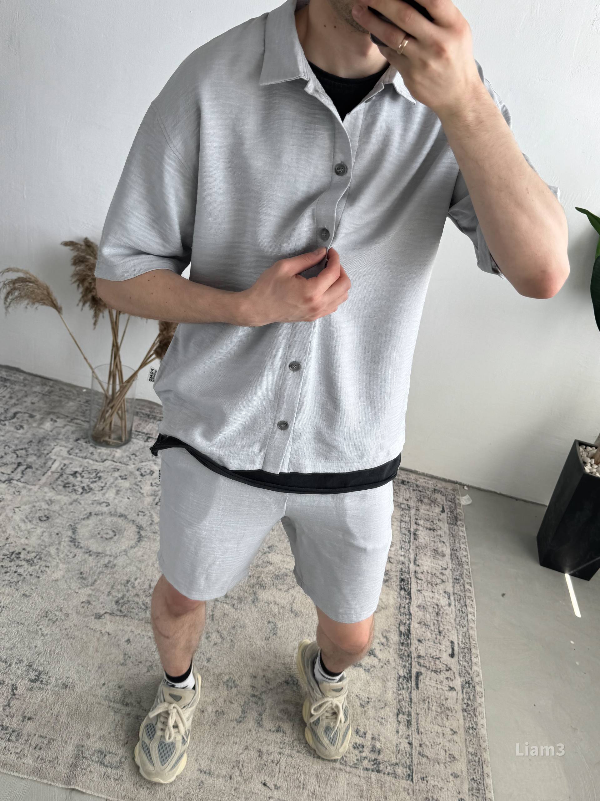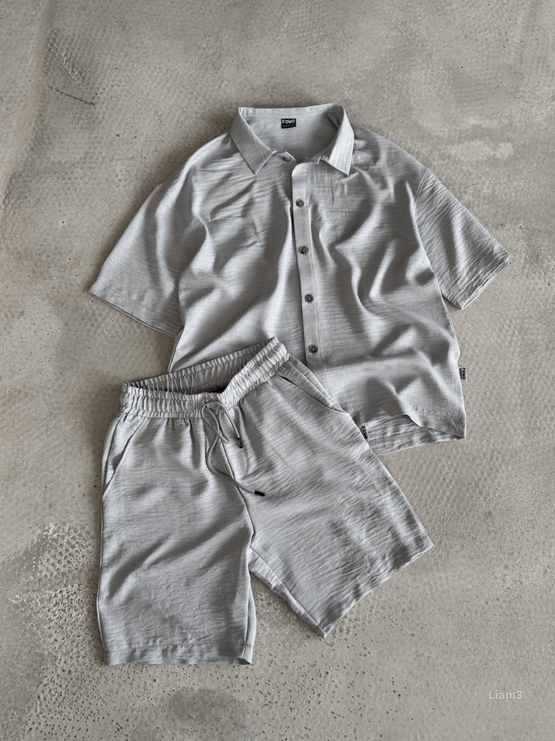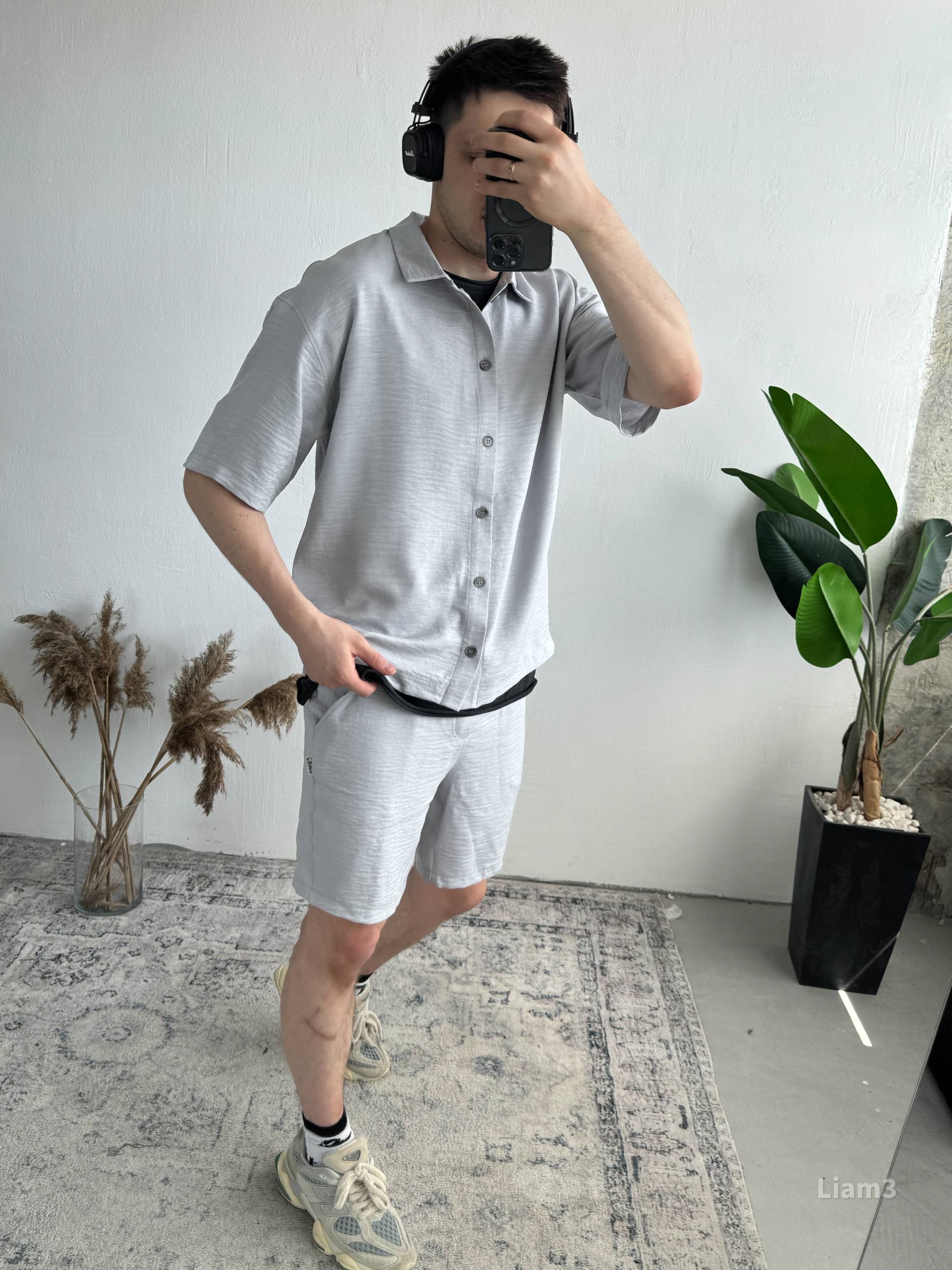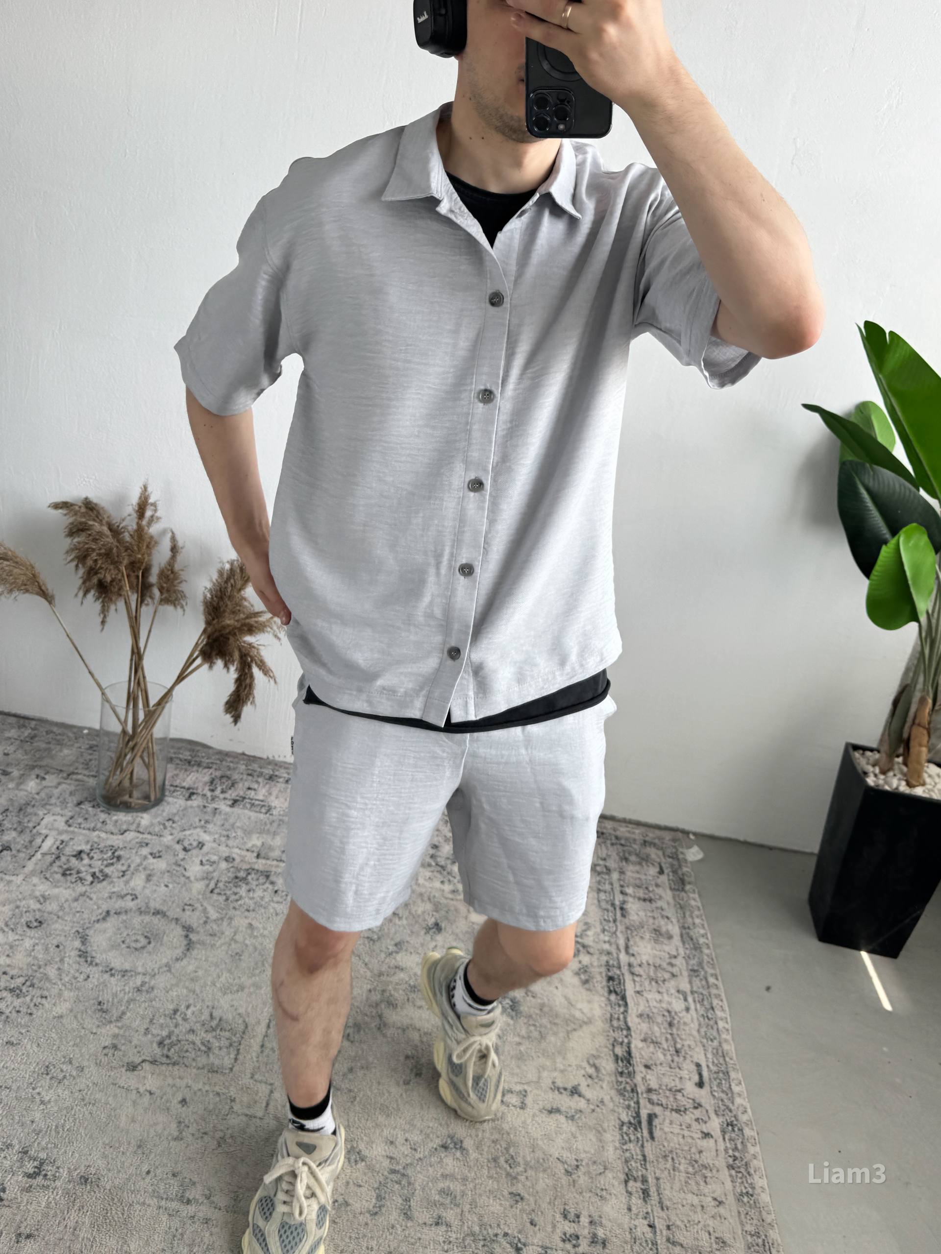 Мужской Льняной Серый Летний Костюм Рубашка Шорты Жатка