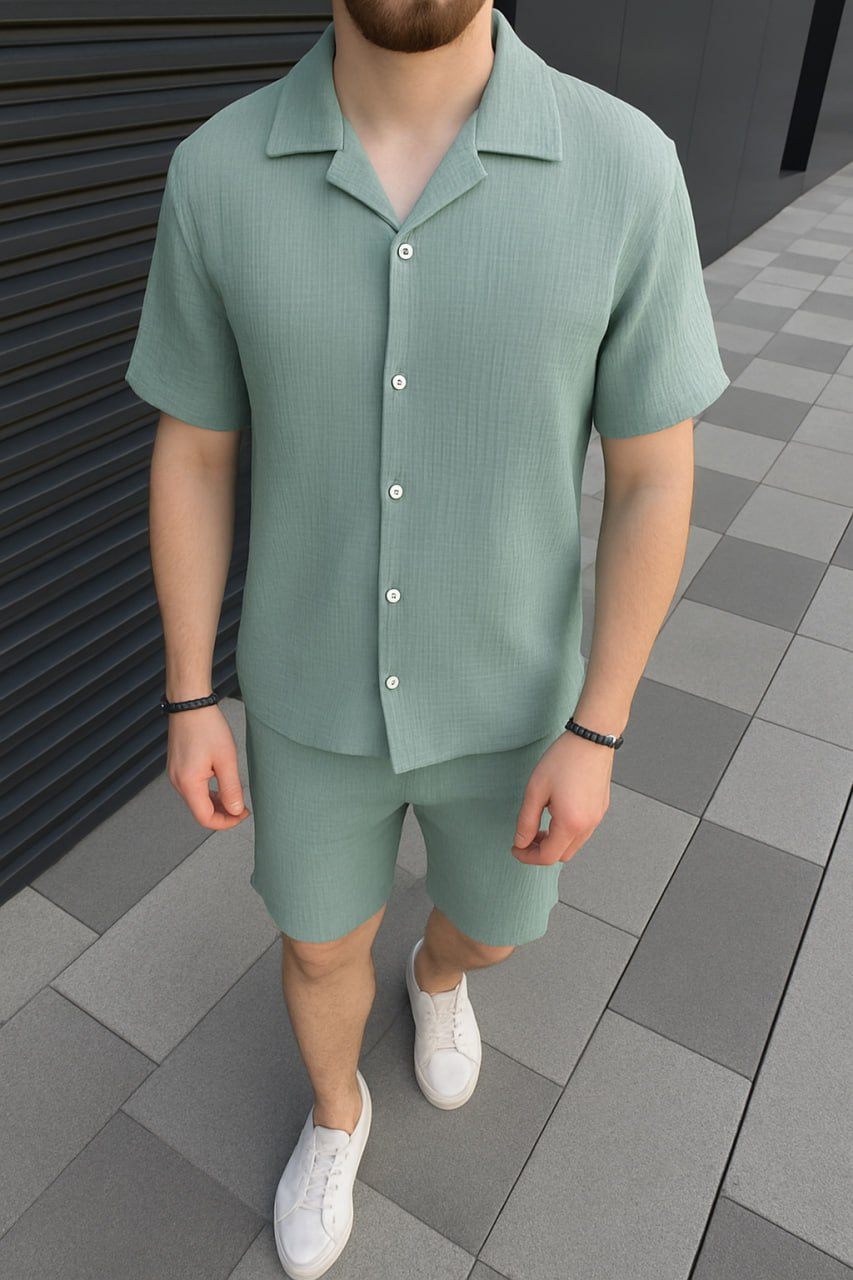 Мужской Мятный Легкий Летний Костюм Муслин – Рубашка с Коротким Рукавом + Шорты
