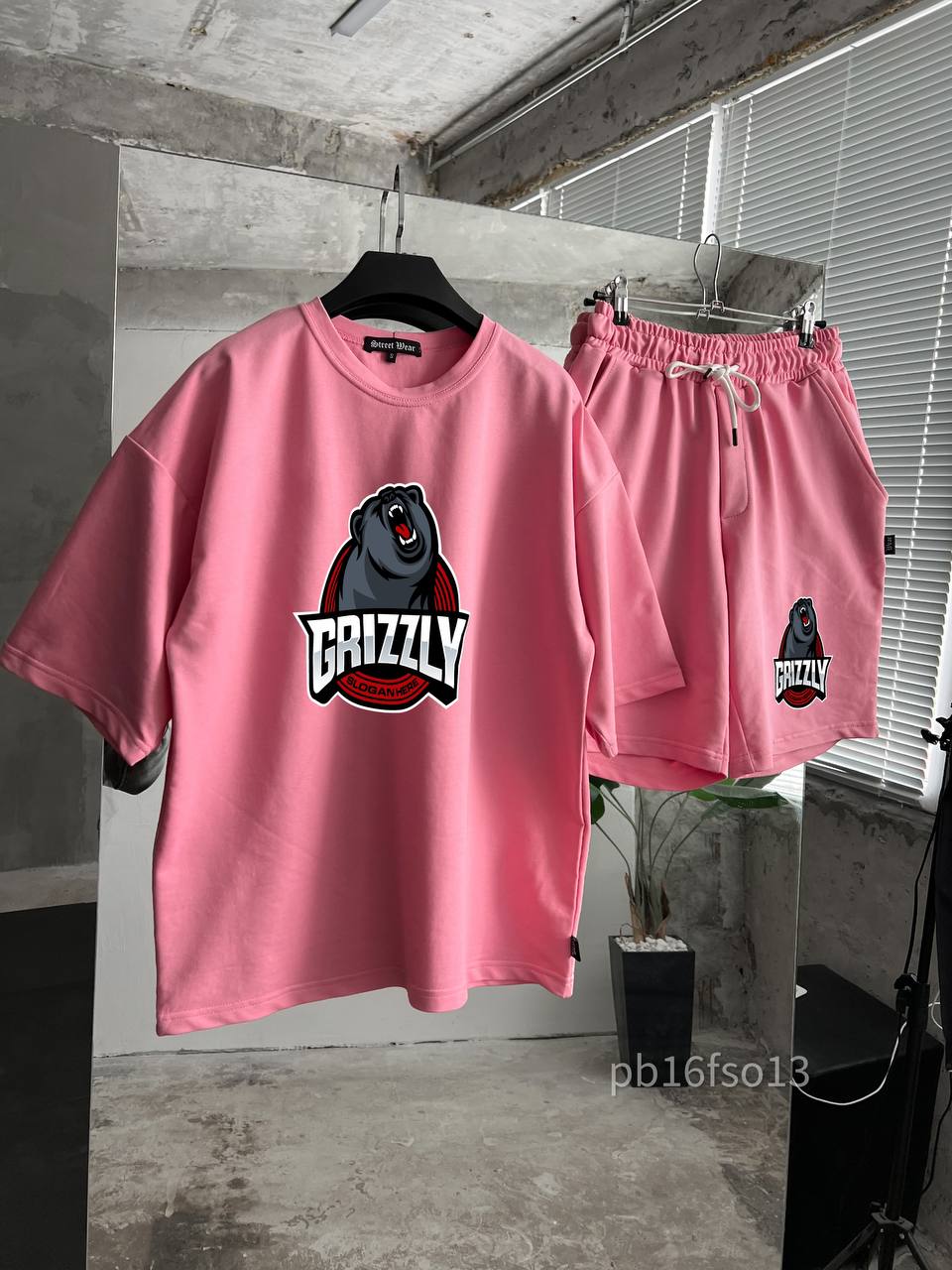 Мужской Розовый Летний Костюм Футболка Шорты – Хлопковый Свободного Кроя с Принтом Grizzly