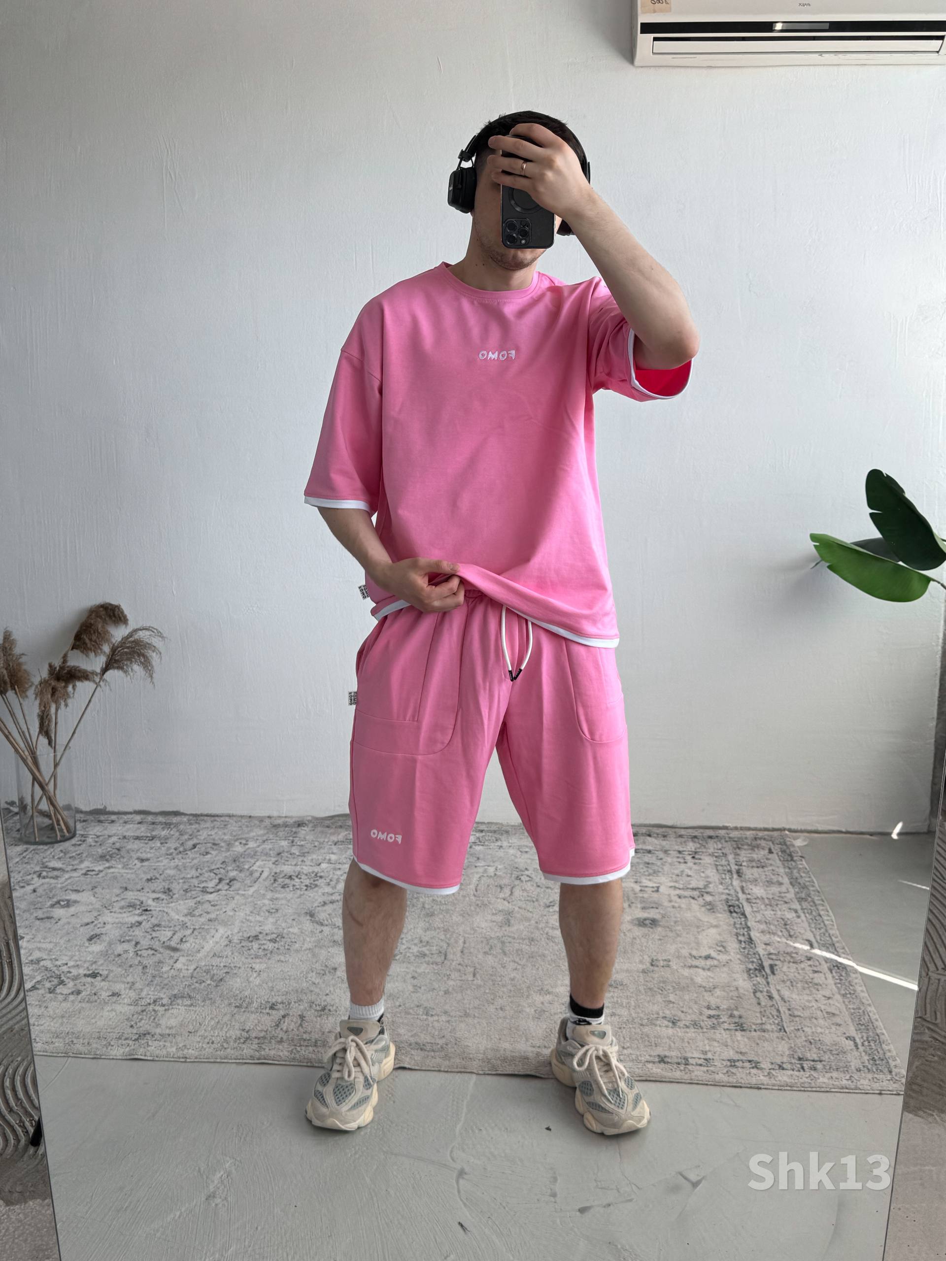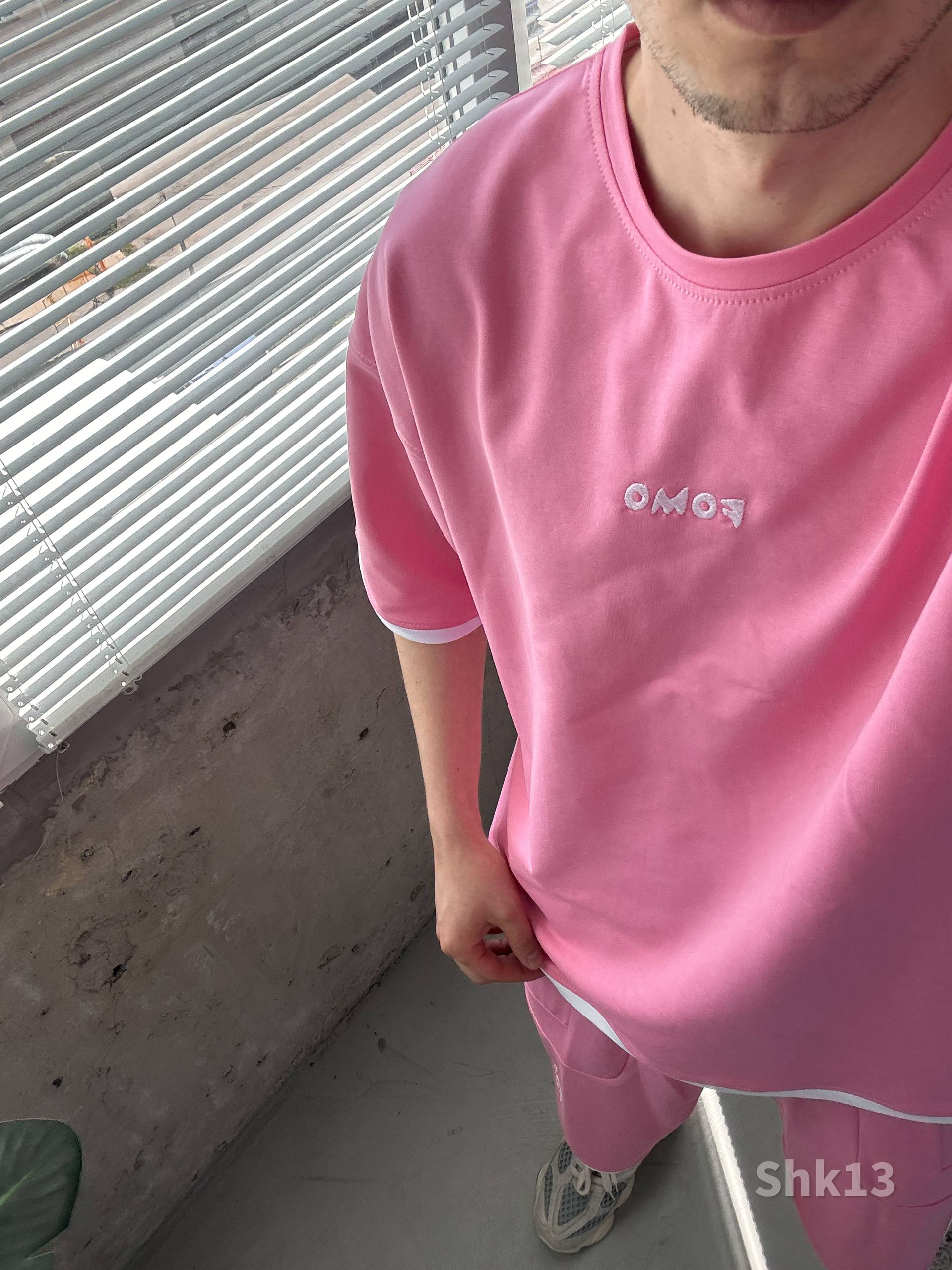 Мужской Розовый Летний Костюм Футболка Шорты Свободного Кроя с Окантовкой