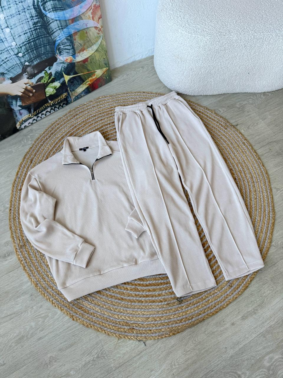 Мужской Светло-Бежевый Костюм Вельвет – Кофта с Высоким Горлом + Штаны со Стрелками
