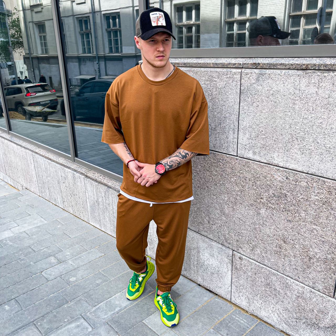 Мужской Свободный Легкий Коричневый Костюм Комплект Летний – Футболка и Штаны Базовые Одного Тона