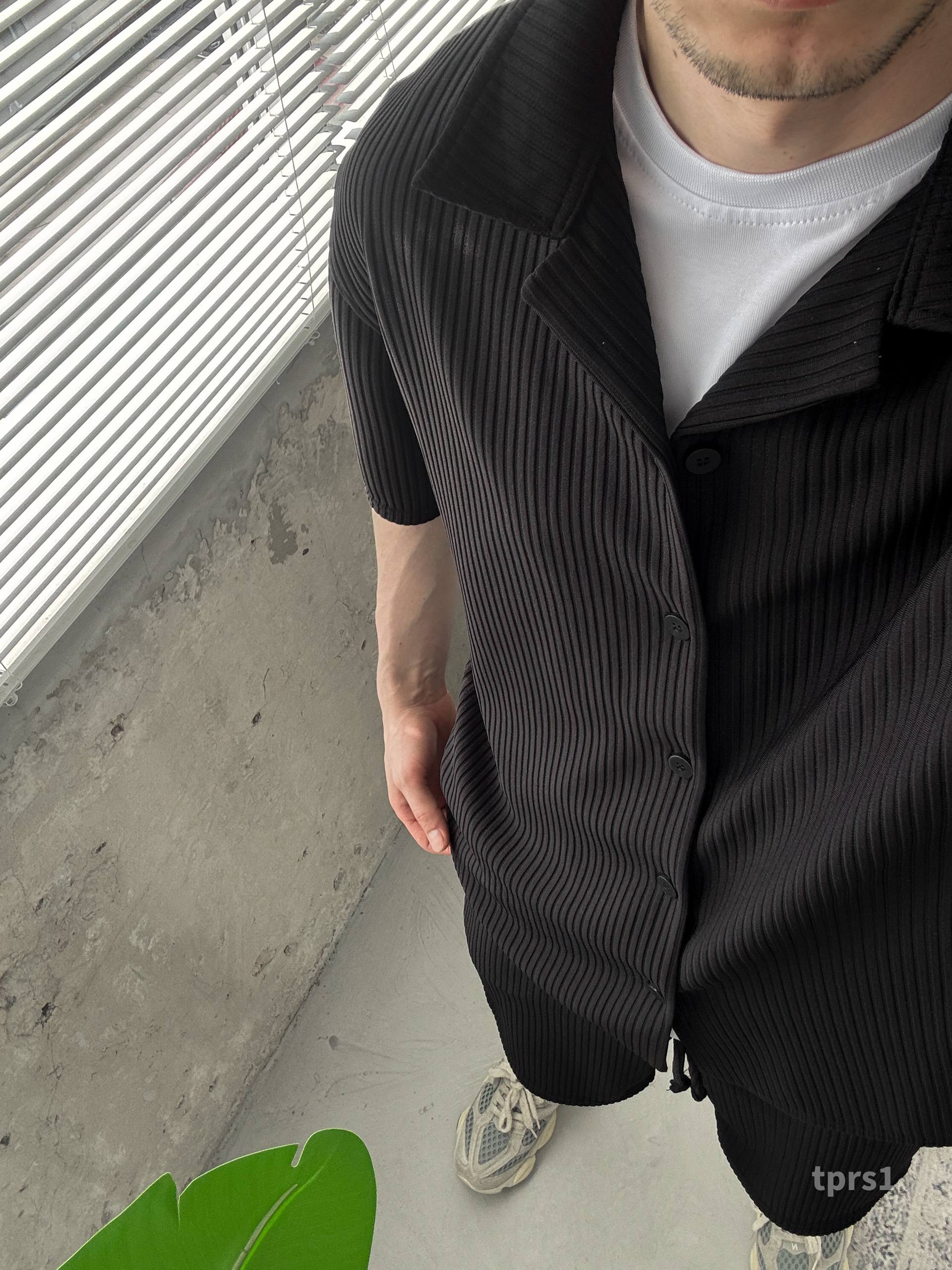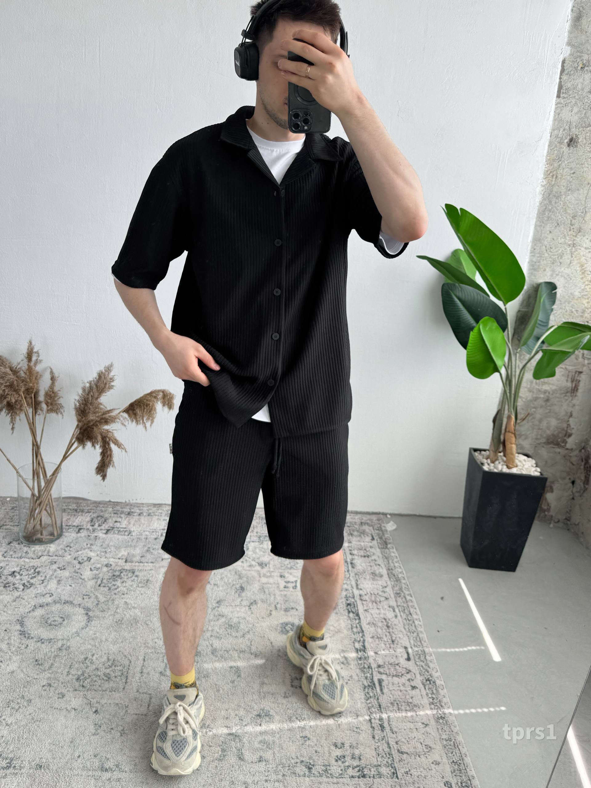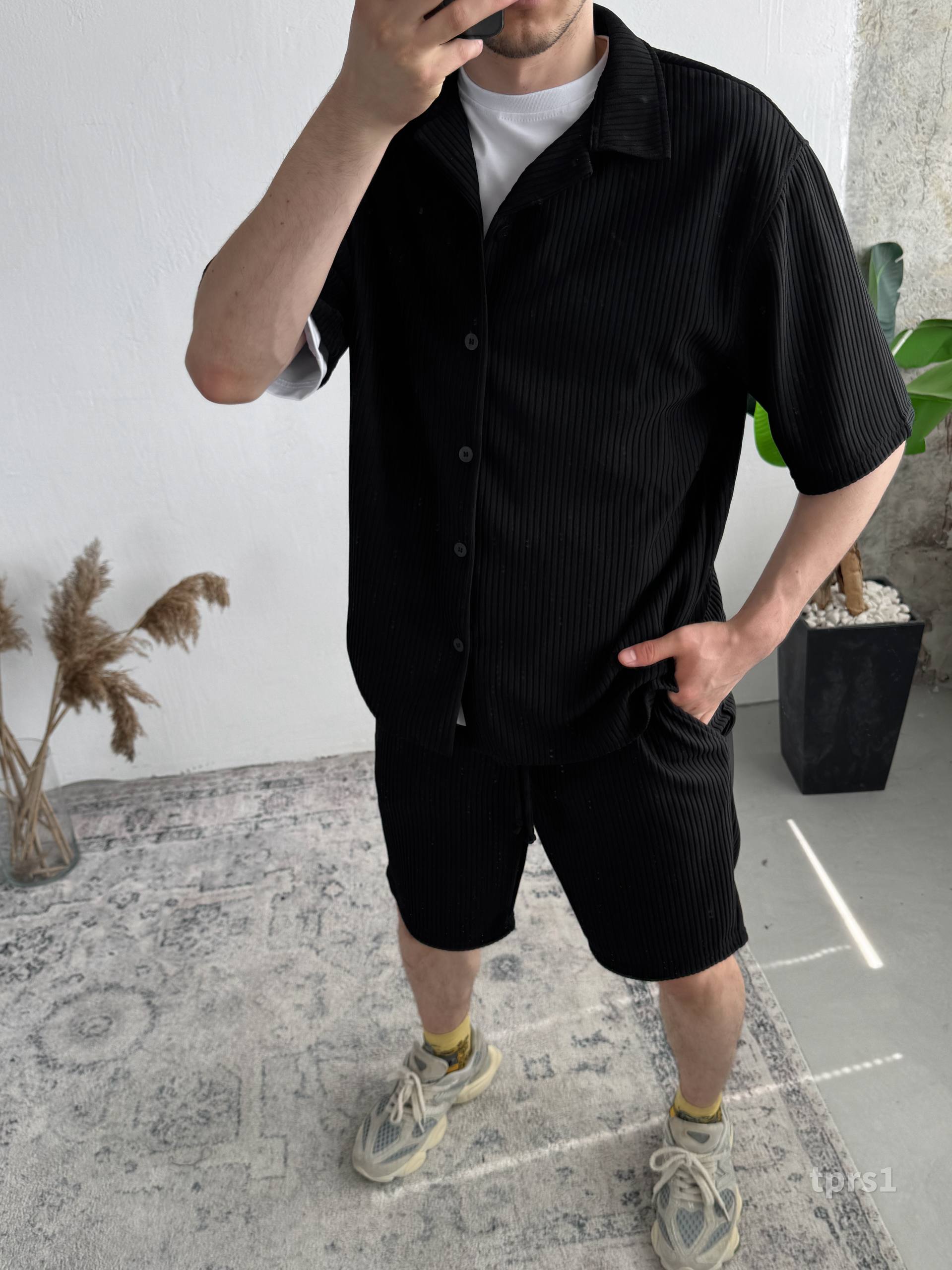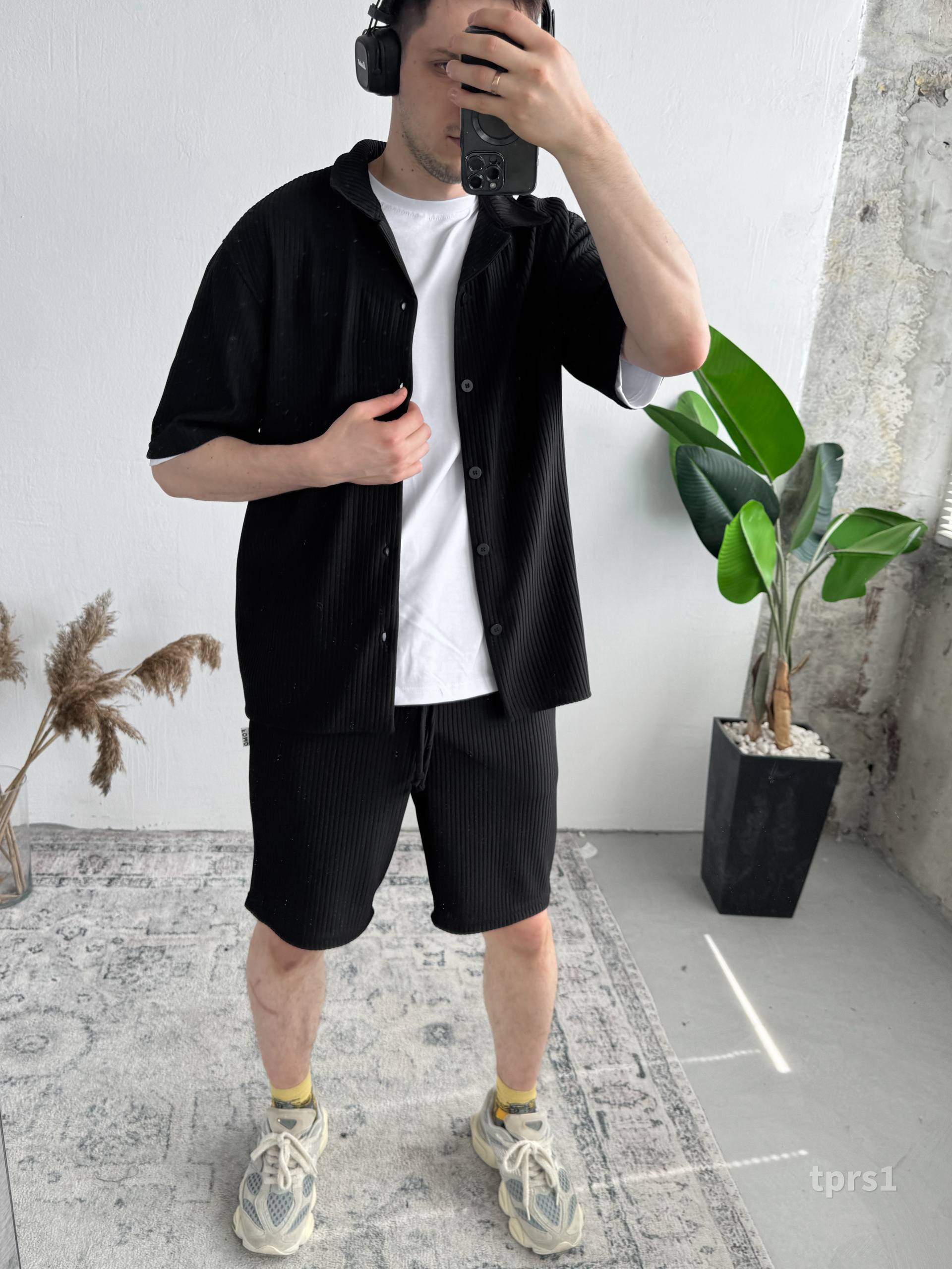 Мужской Свободный Летний Черный Костюм Рубашка Шорты в Рубчик