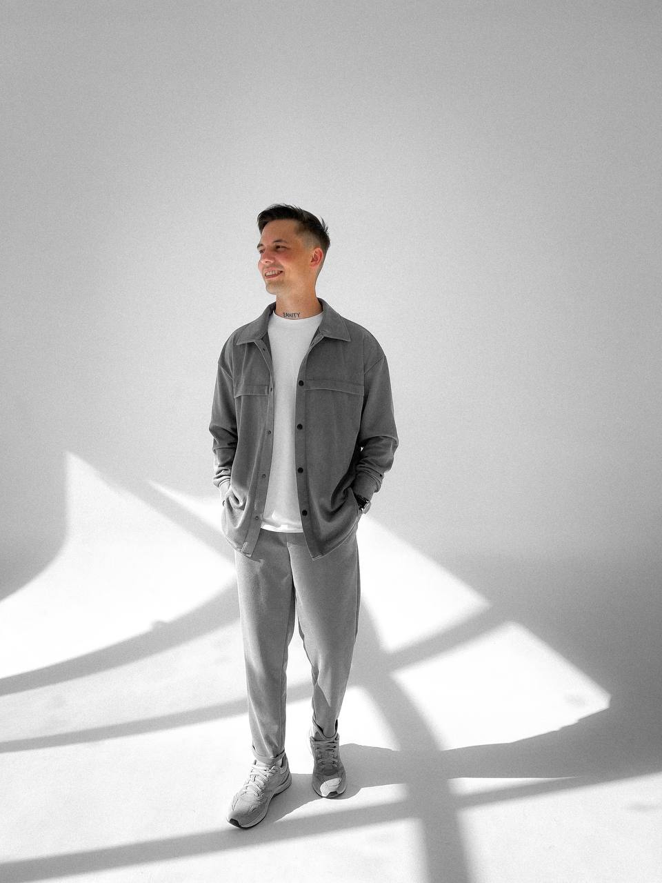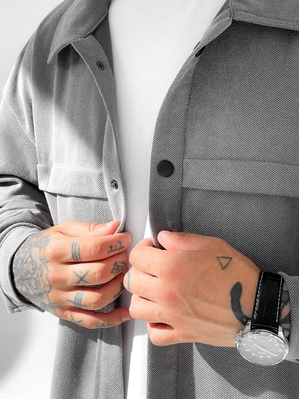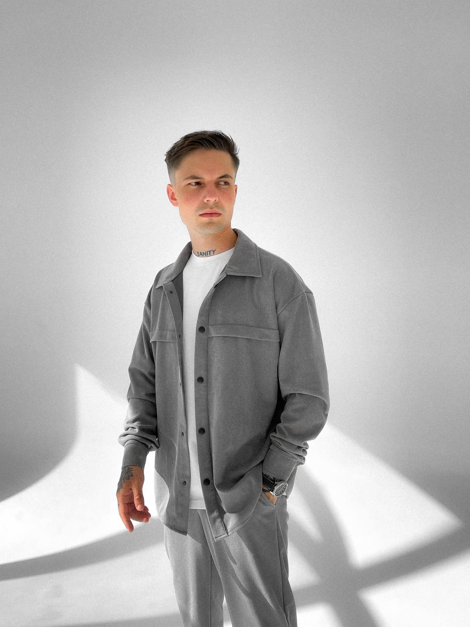 Мужской Свободный Серый Костюм – Рубашка Оверсайз + Укороченные Штаны с Подворотами