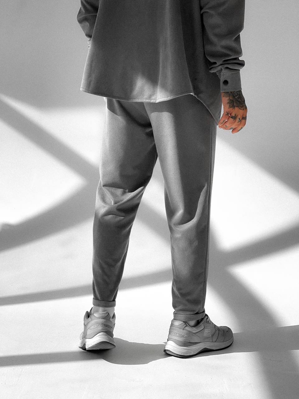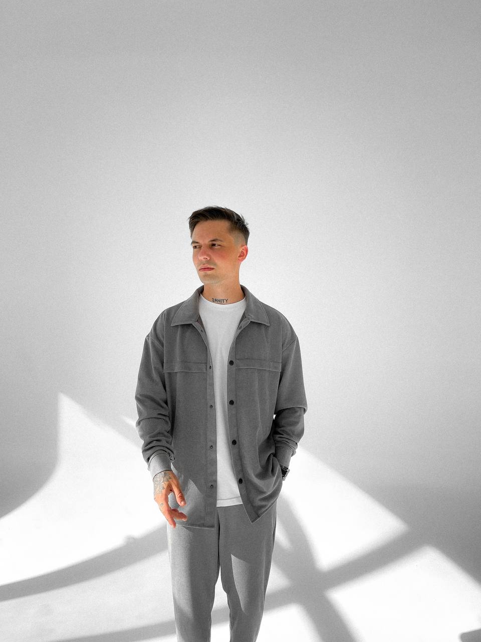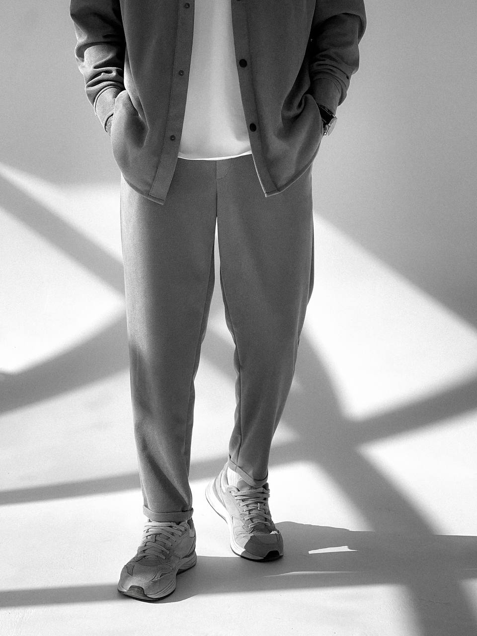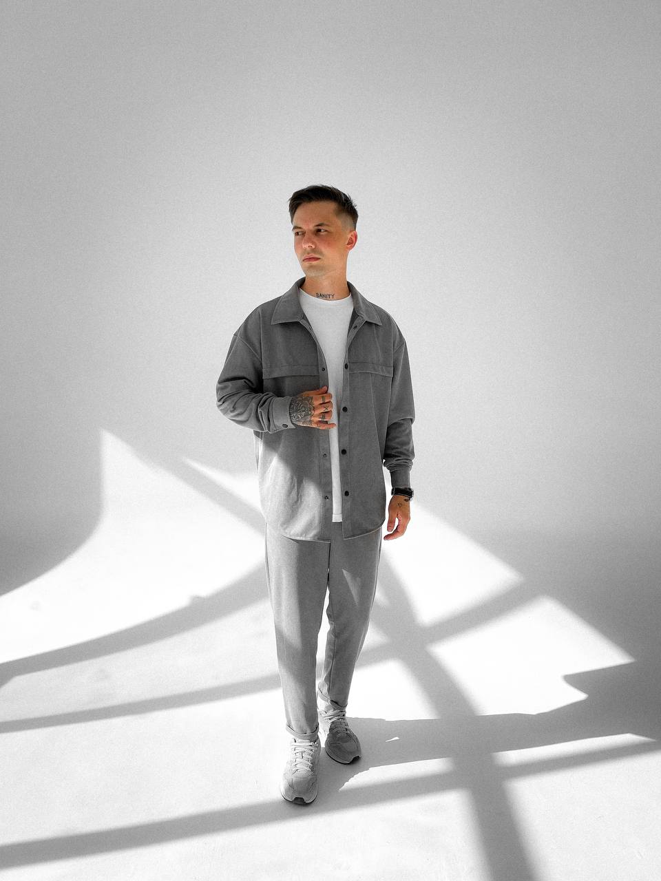 Мужской Свободный Серый Костюм – Рубашка Оверсайз + Укороченные Штаны с Подворотами