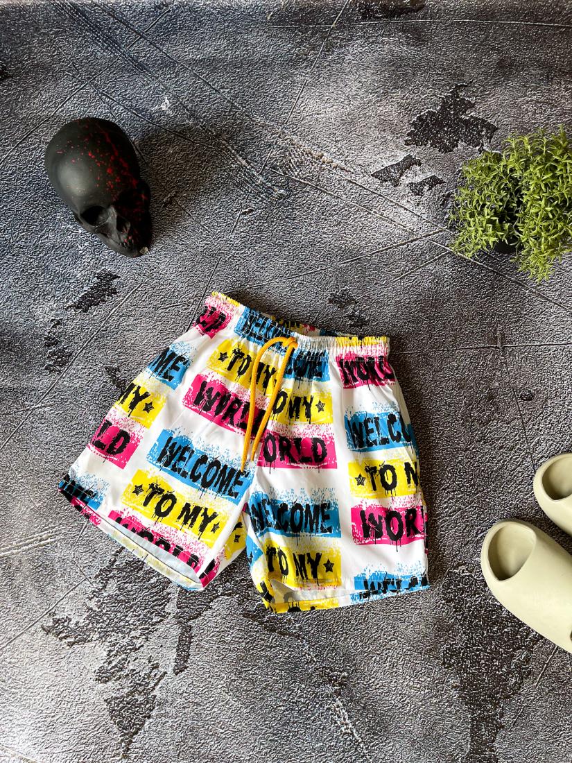Мужские Белые Пляжные Шорты с Разноцветными Надписями – Плащевка на Подкладке