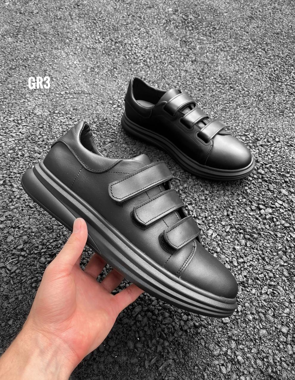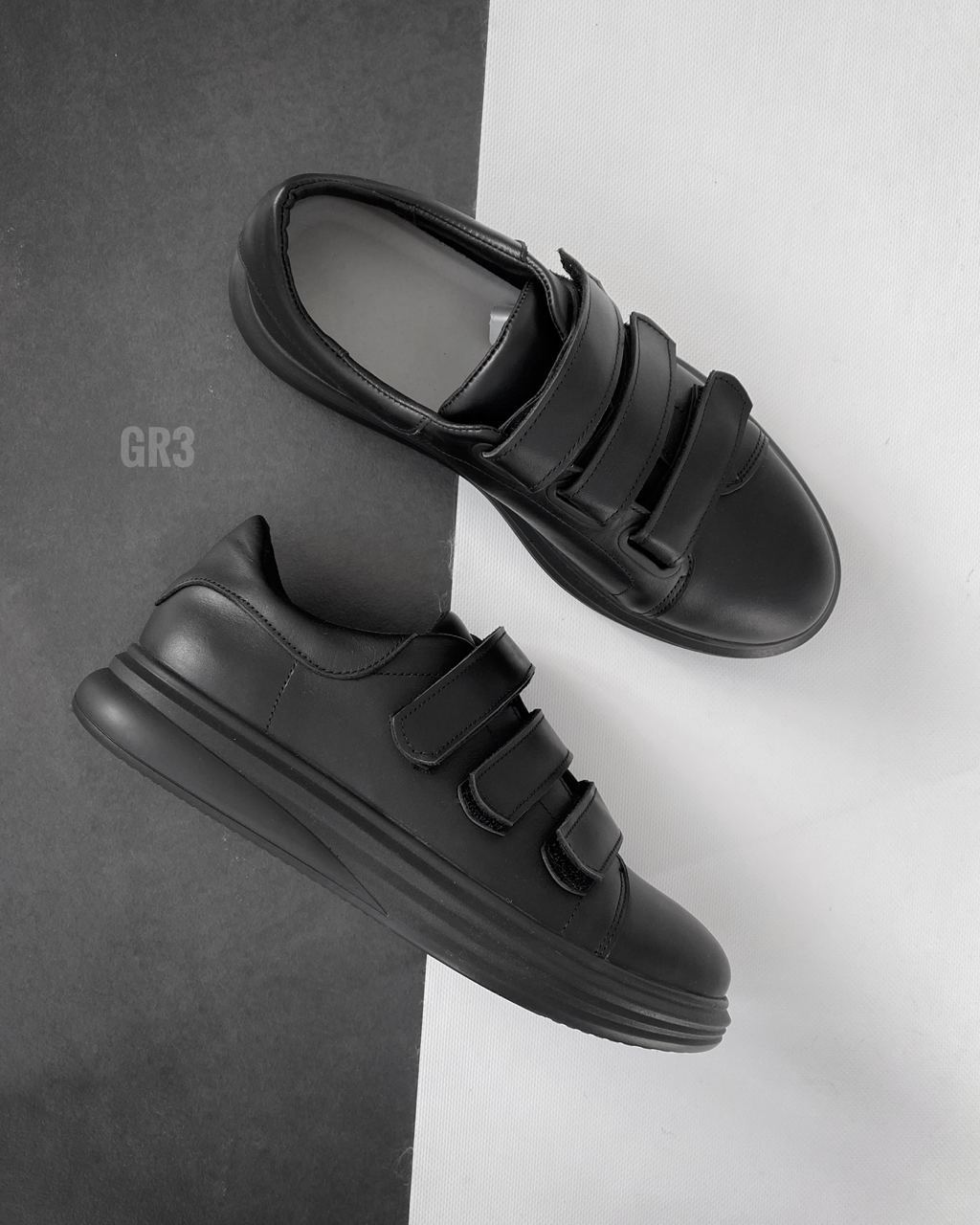 Мужские Кожаные Кроссовки Черного Цвета на Липучках с Черной Подошвой