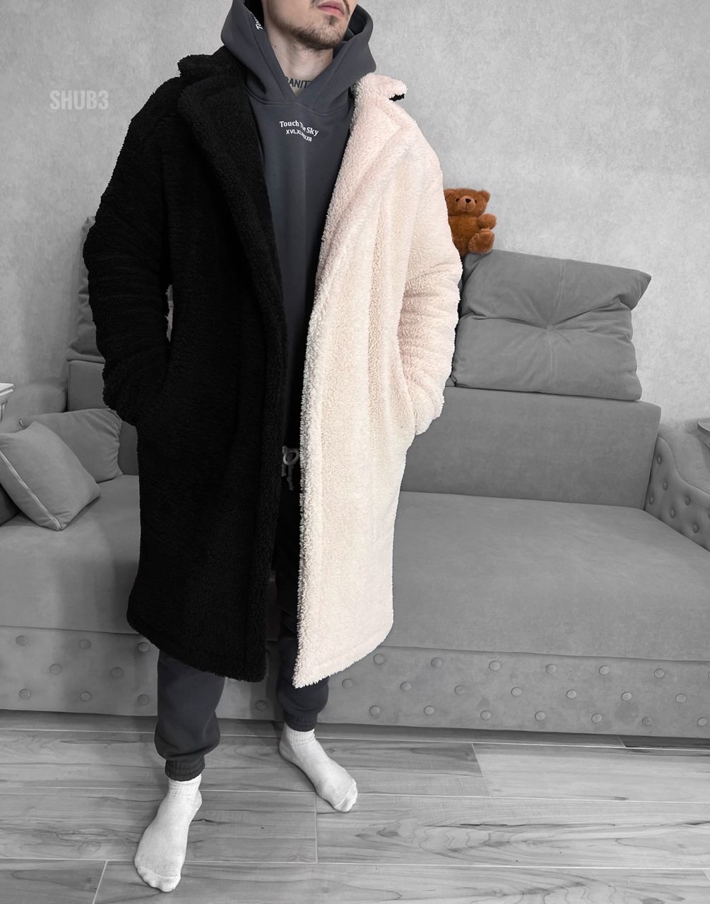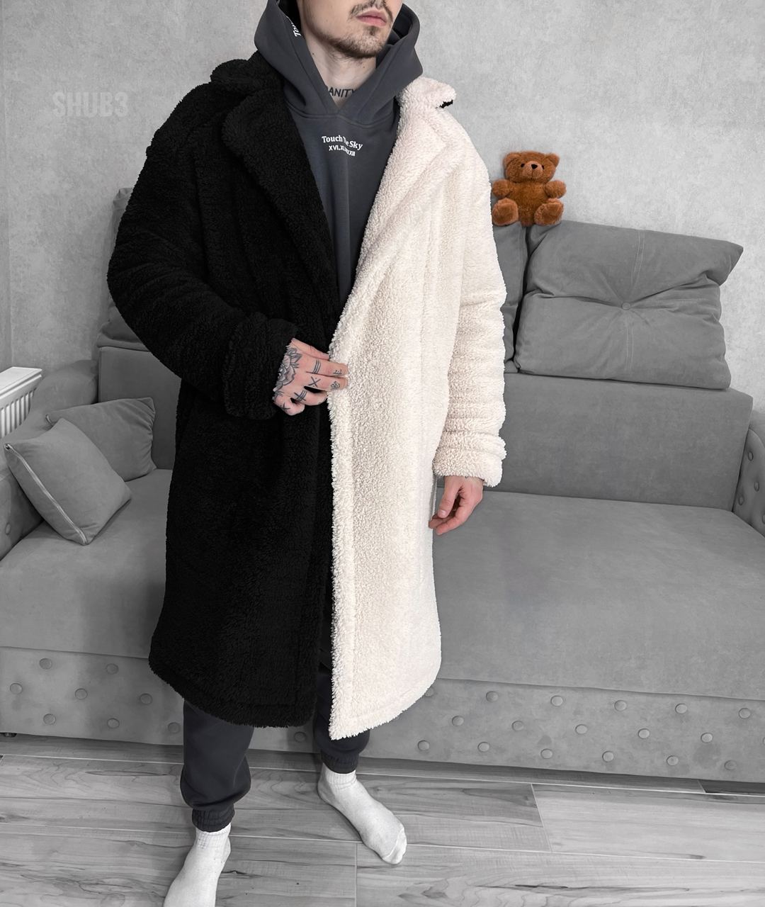 Мужская Двухцветная Молочно-Черная Шуба Барашек – Теплая Мягкая Оверсайз с Большими Карманами
