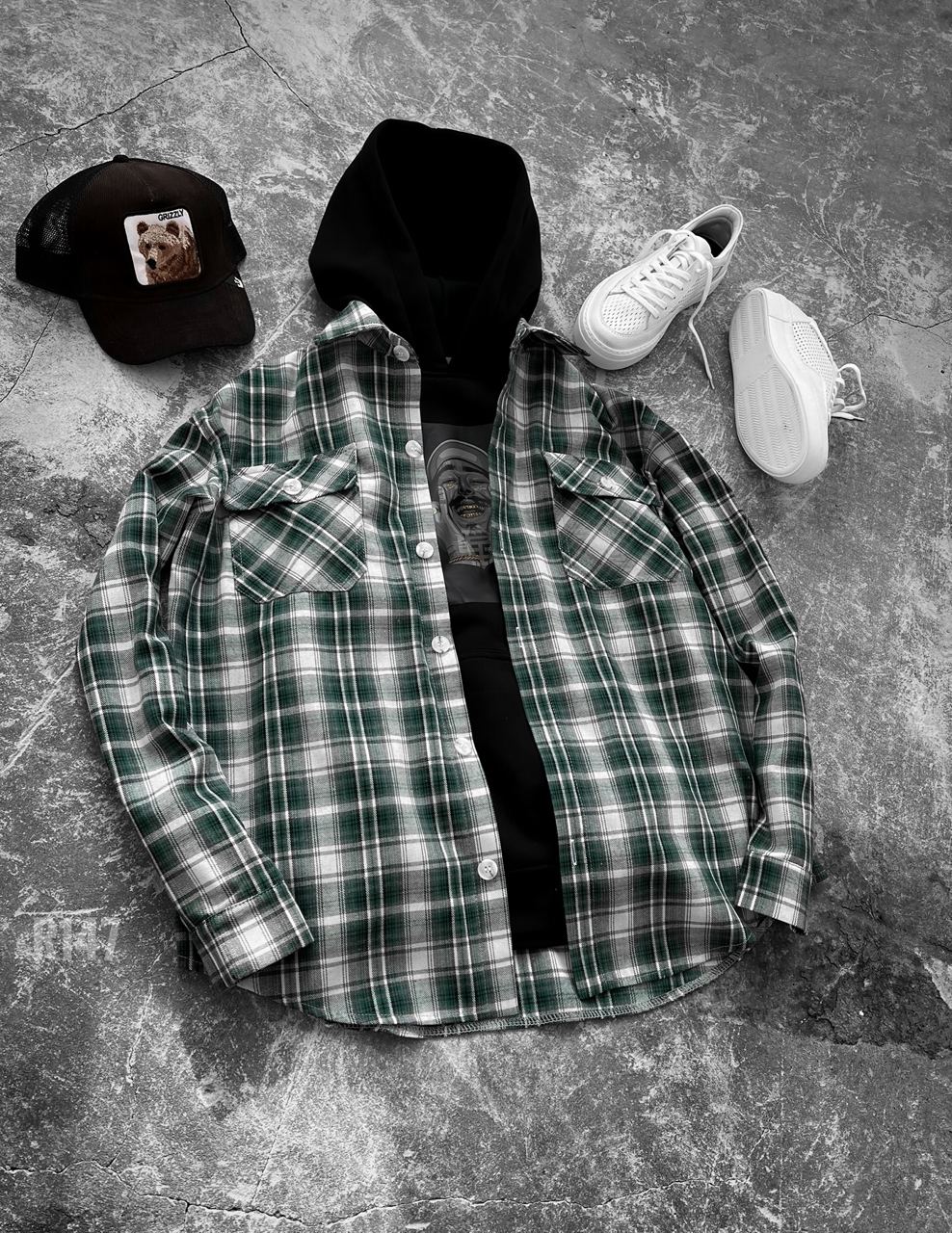 Мужская Байковая Зеленая Рубашка – Классическая в Клетку Свободного Кроя