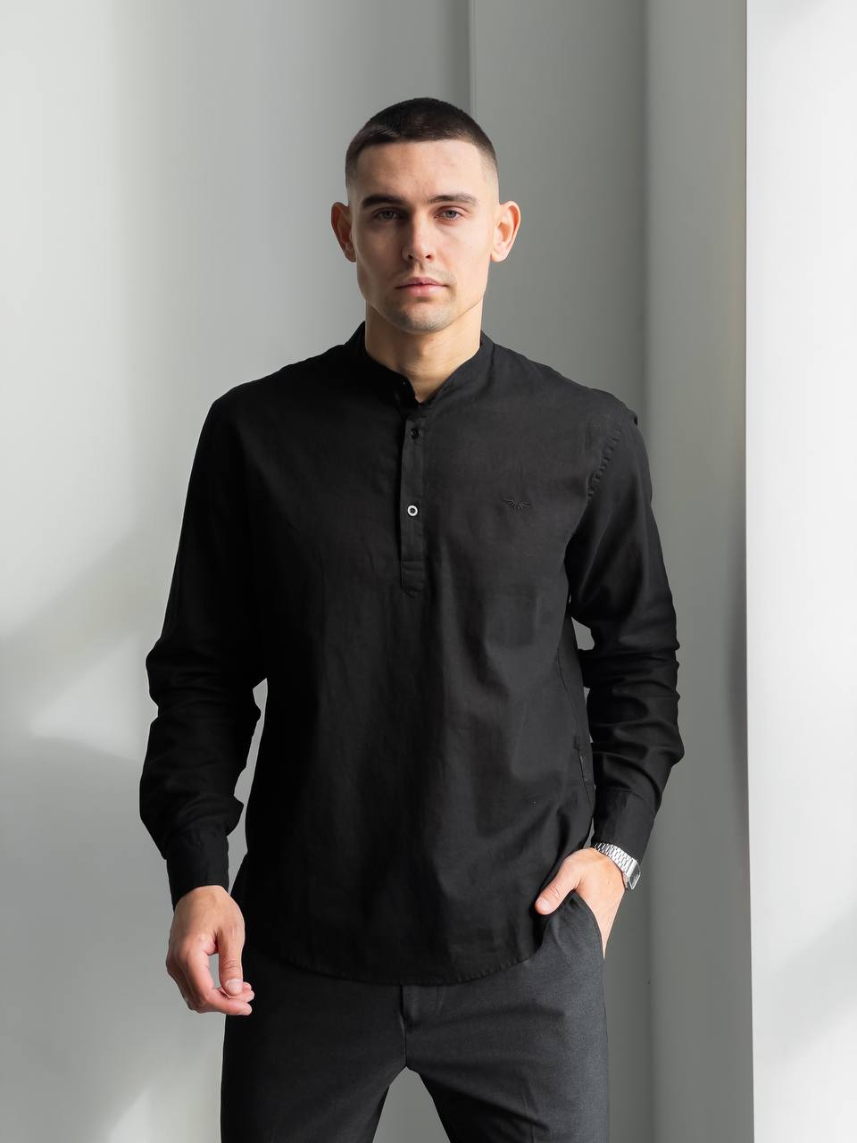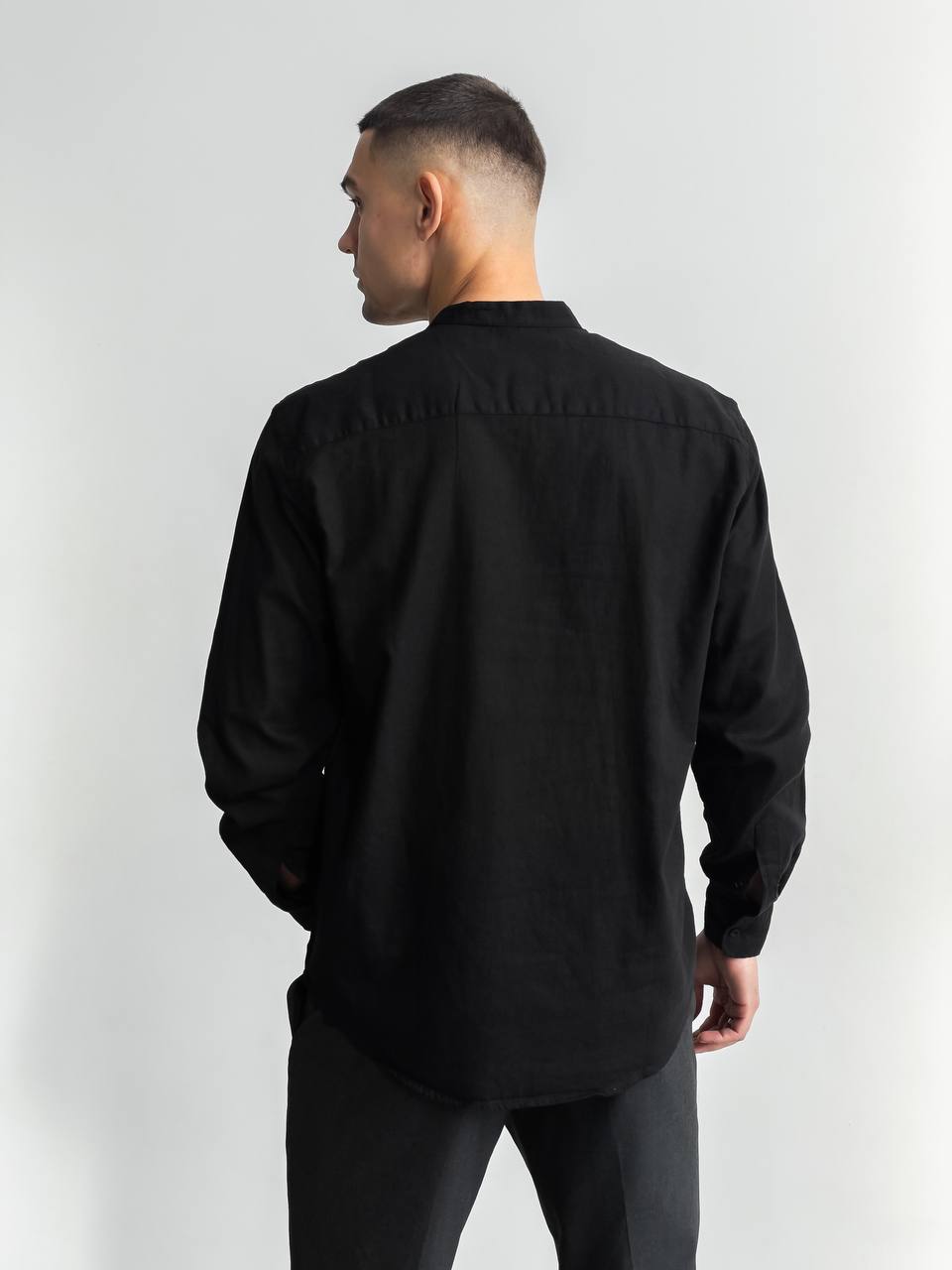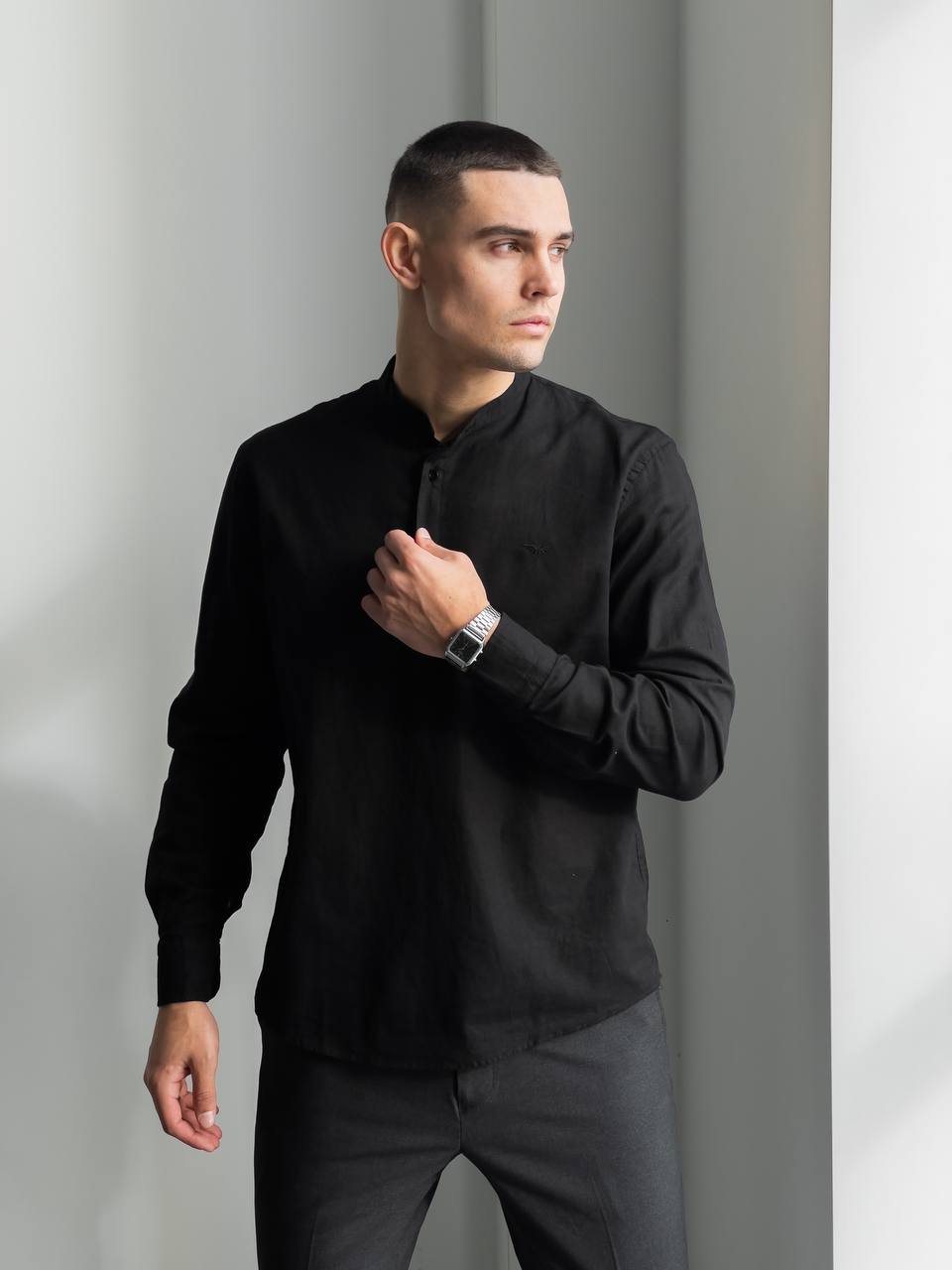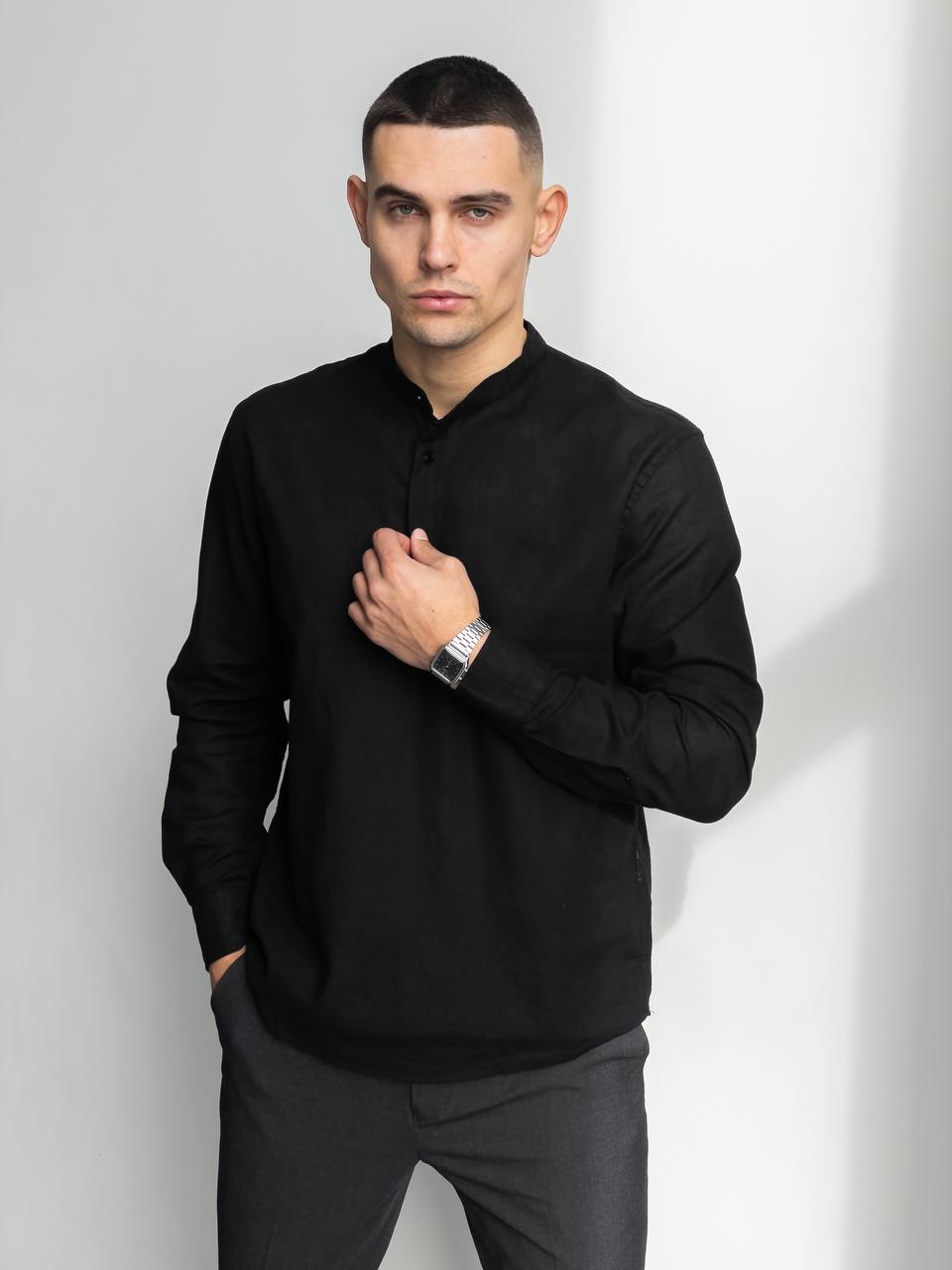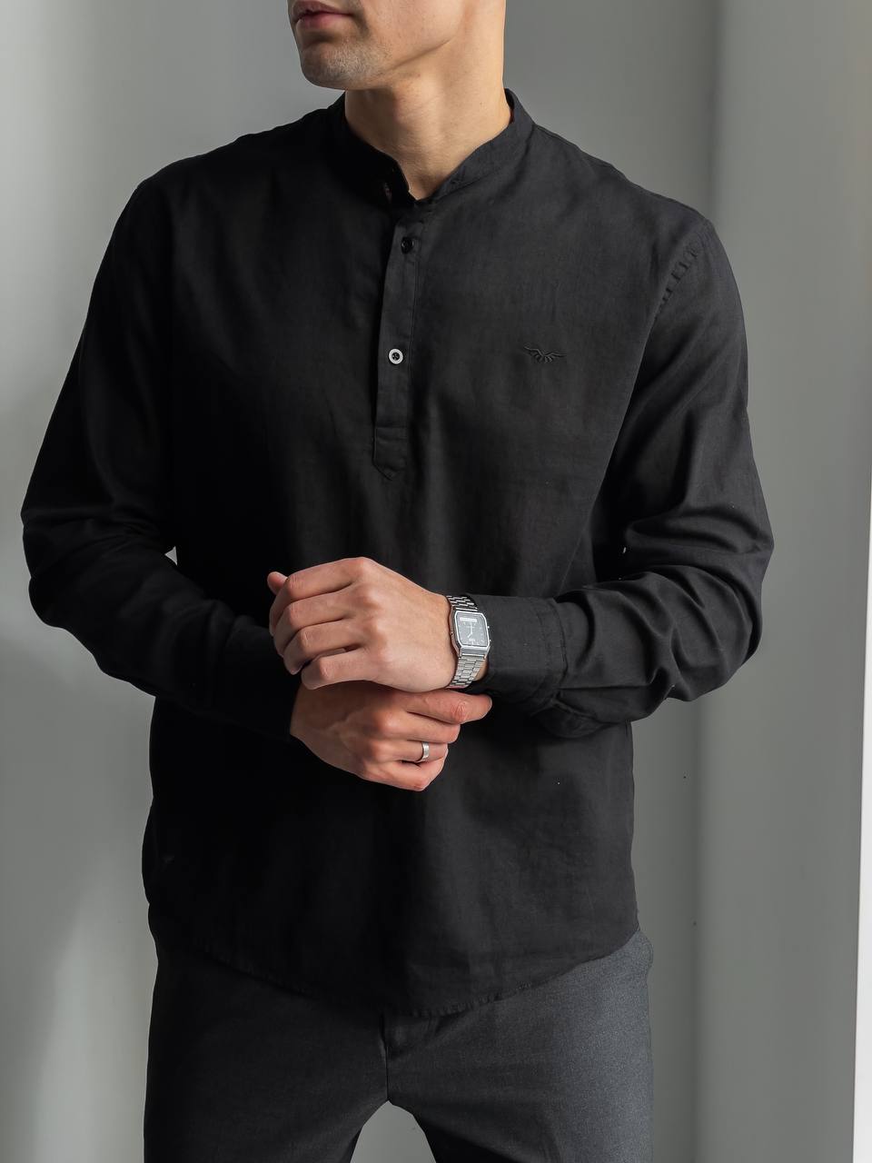 Мужская Базовая Льняная Черная Рубашка с Пуговицами