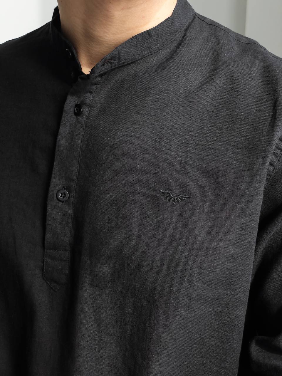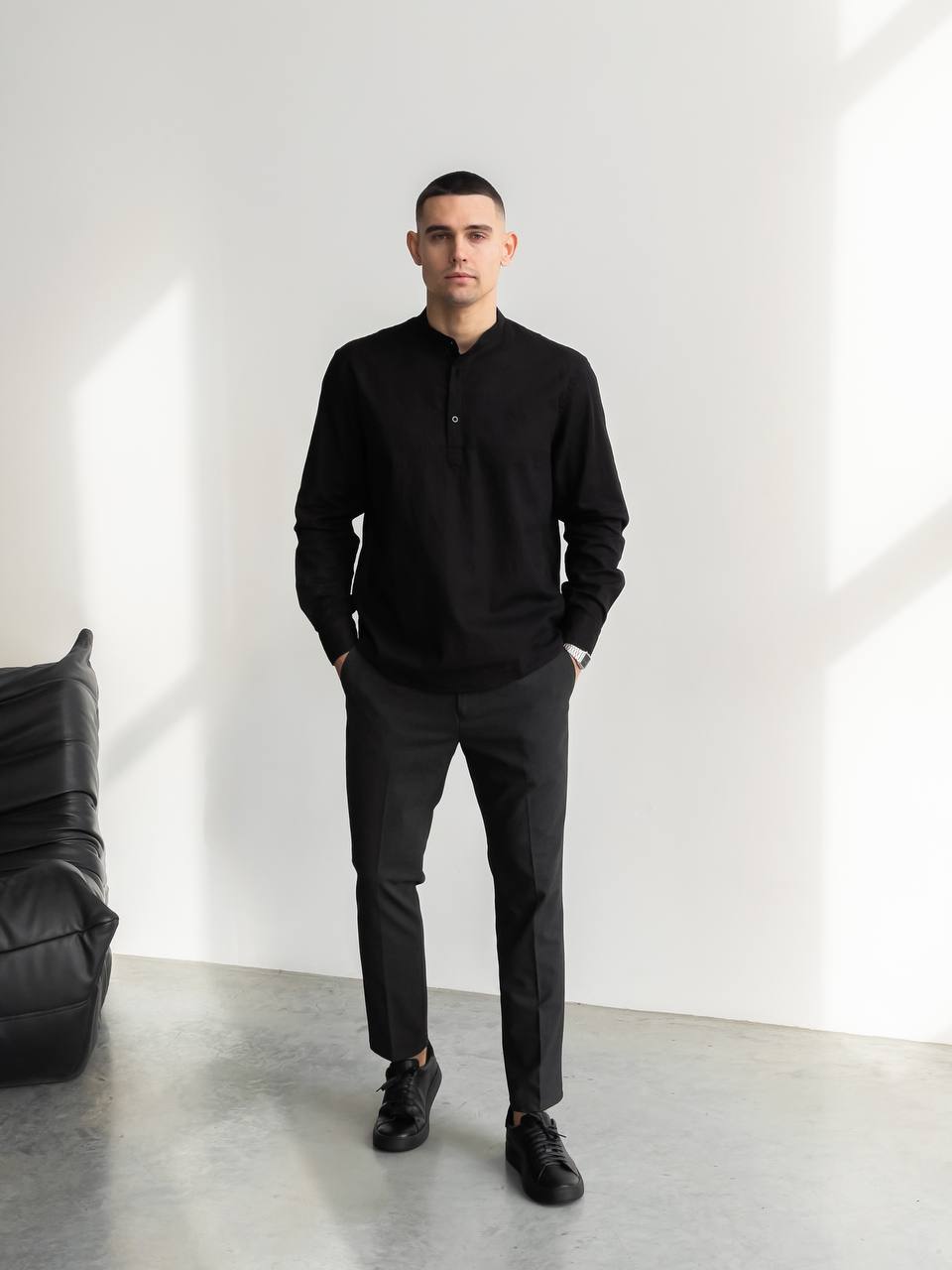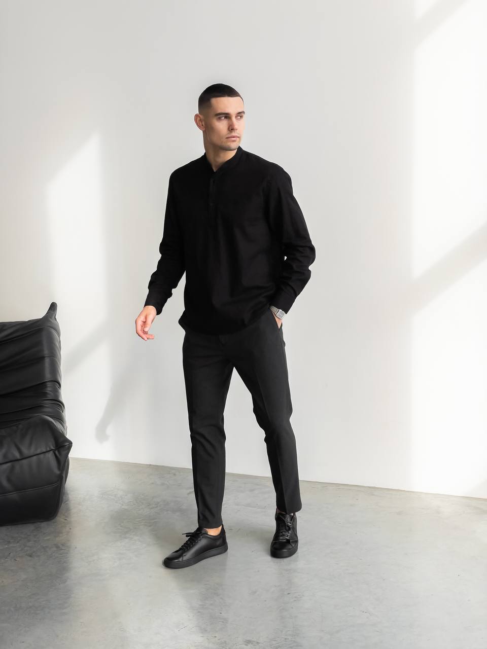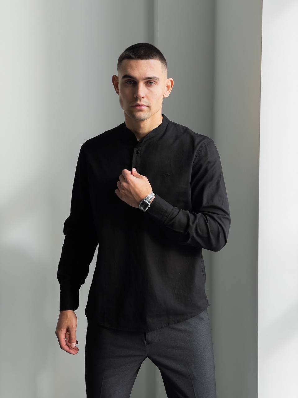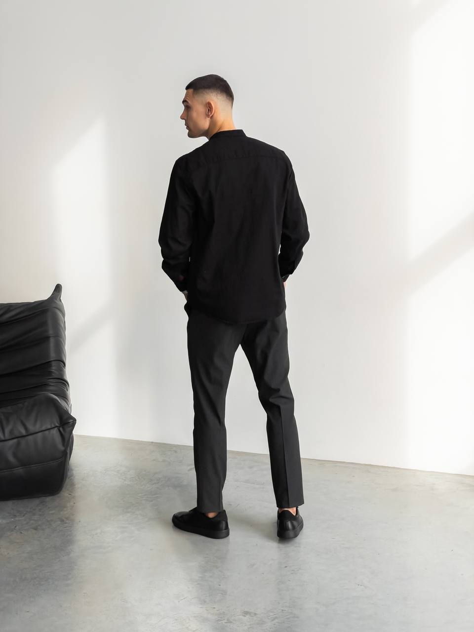 Мужская Базовая Льняная Черная Рубашка с Пуговицами