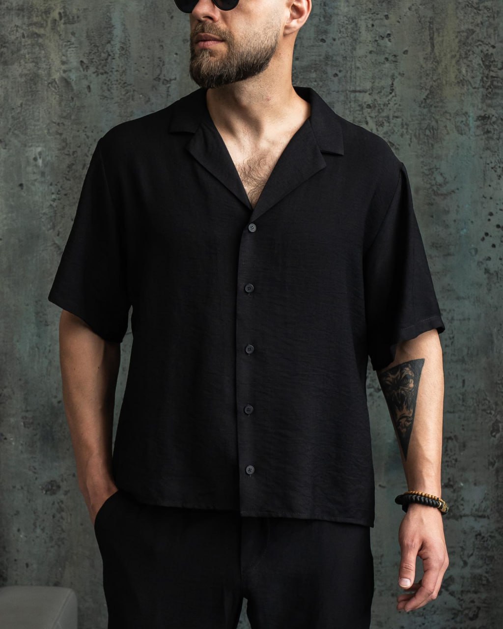 Мужская Летняя Черная Рубашка Свободного Кроя – Легкая Льняная Жатая