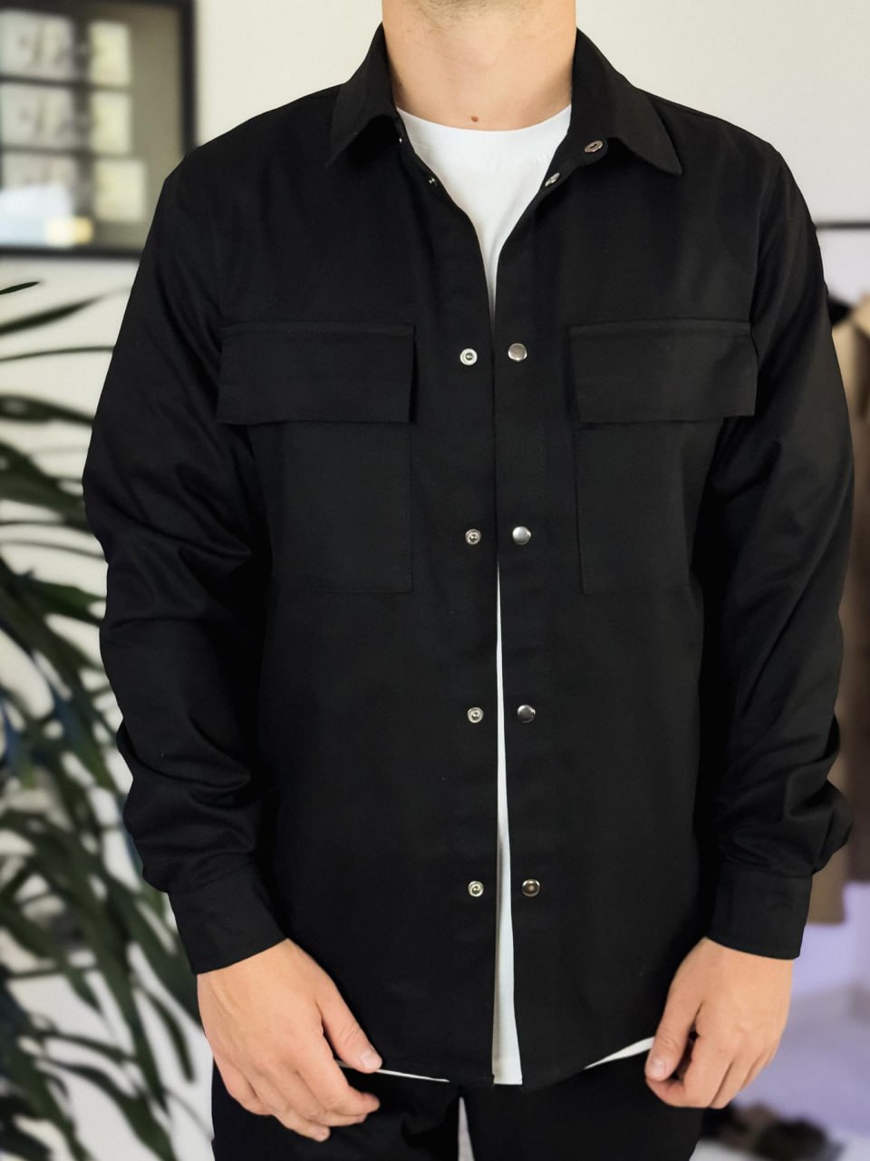 Мужская Плотная Хлопковая Черная Рубашка – Базовая на Кнопках с Накладными Карманами