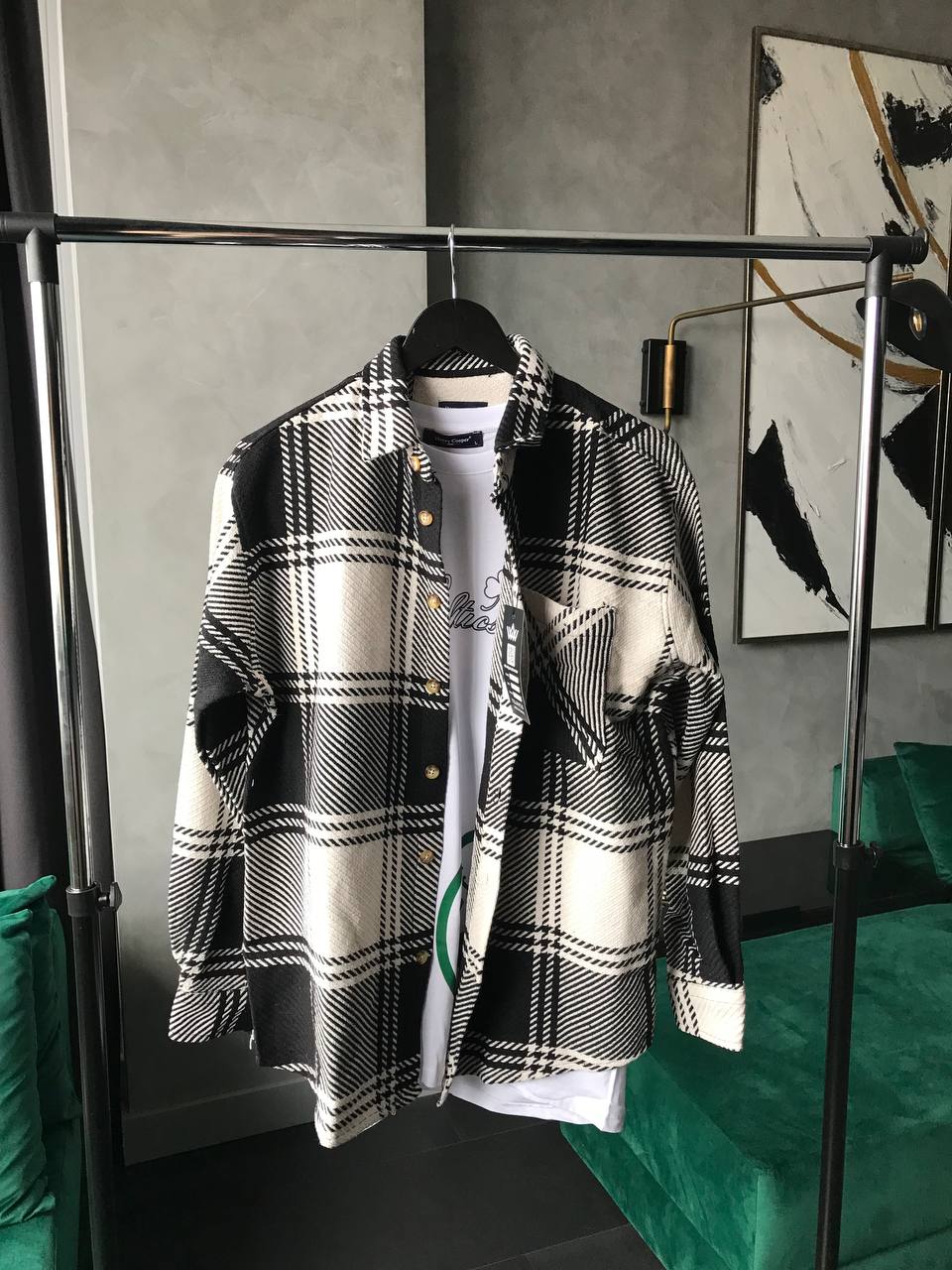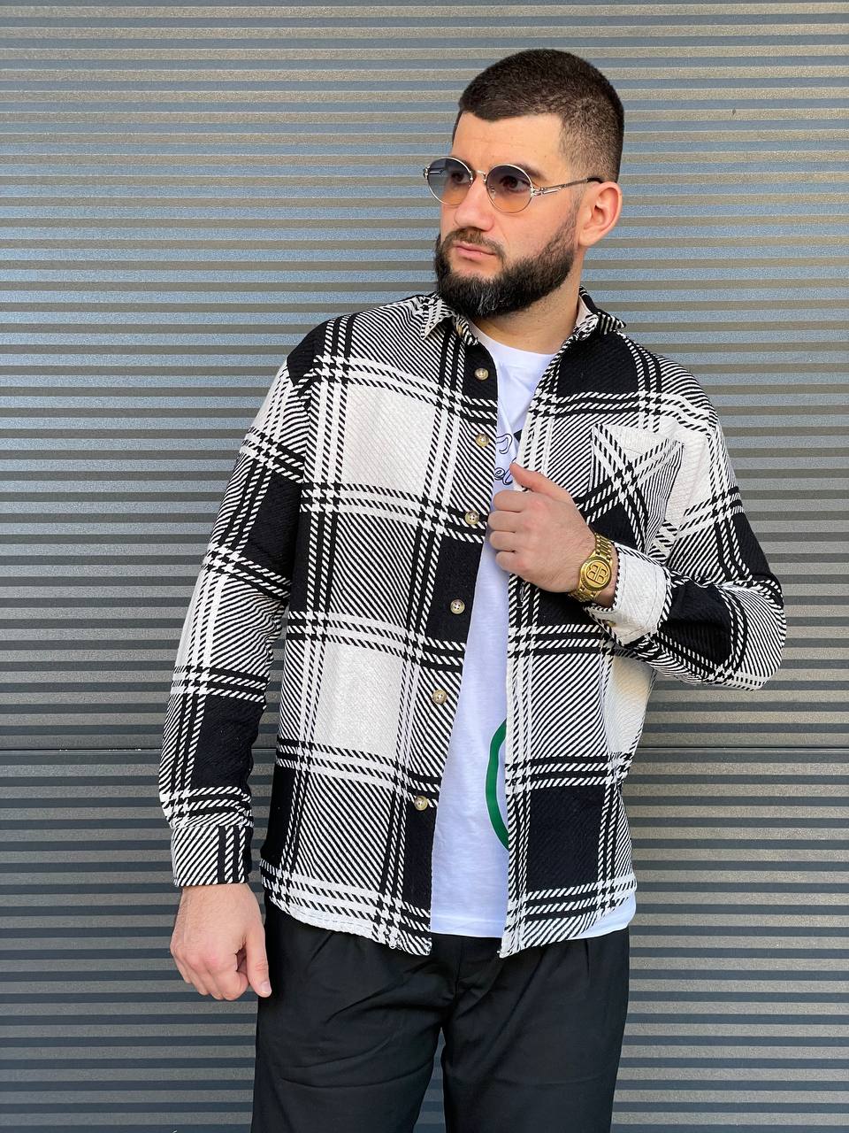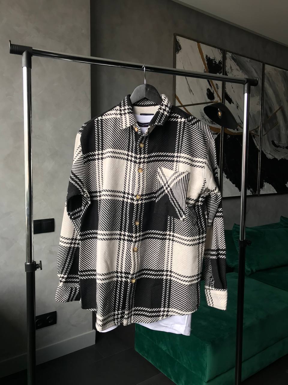Мужская Теплая Байковая Черно-Белая Рубашка Оверсайз в Крупную Клетку