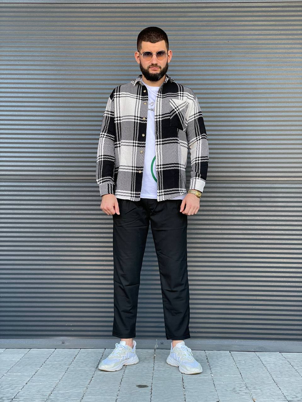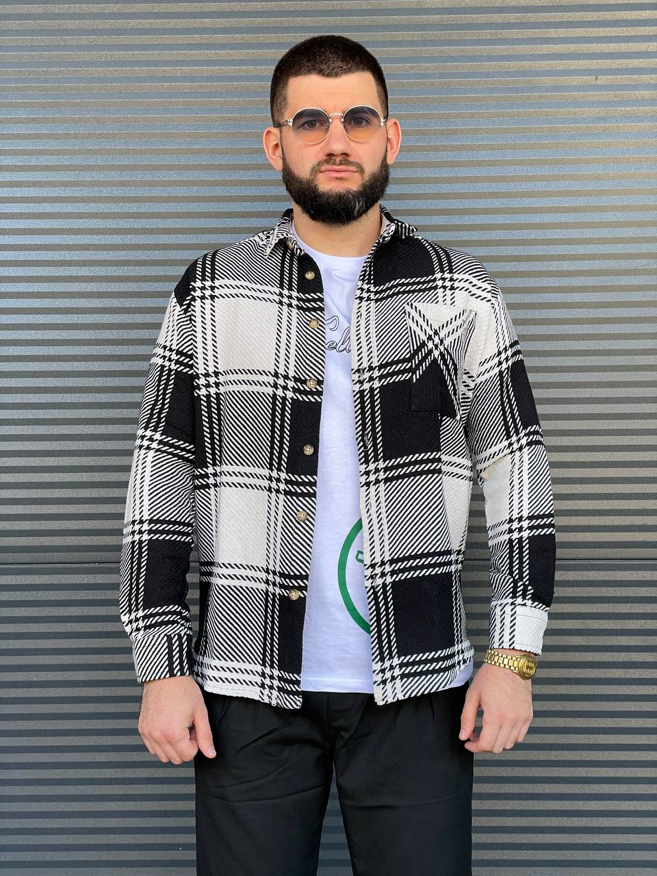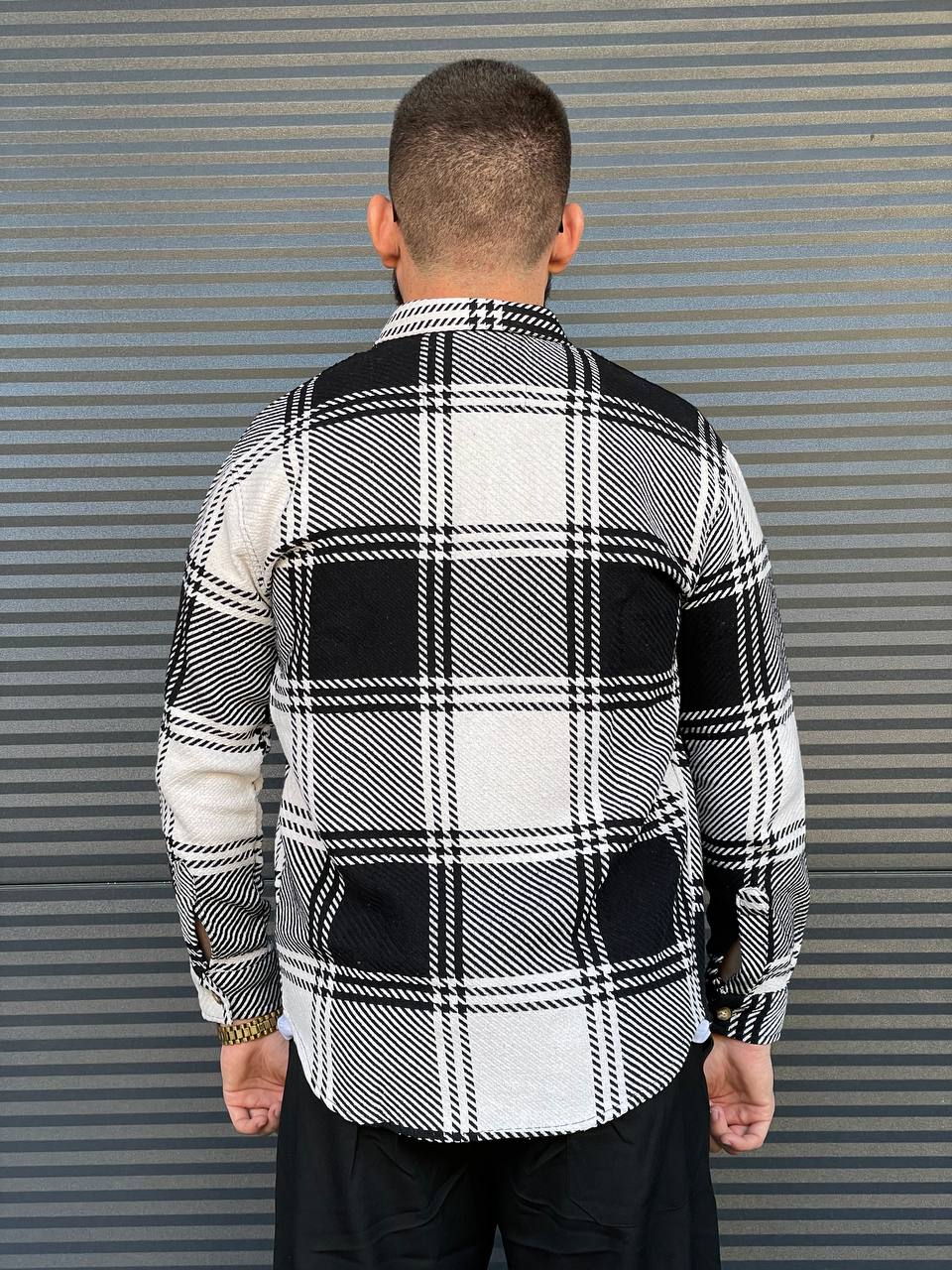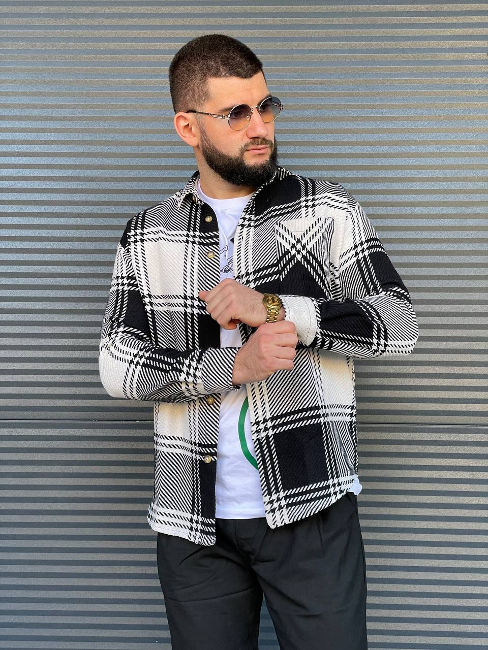 Мужская Теплая Байковая Черно-Белая Рубашка Оверсайз в Крупную Клетку
