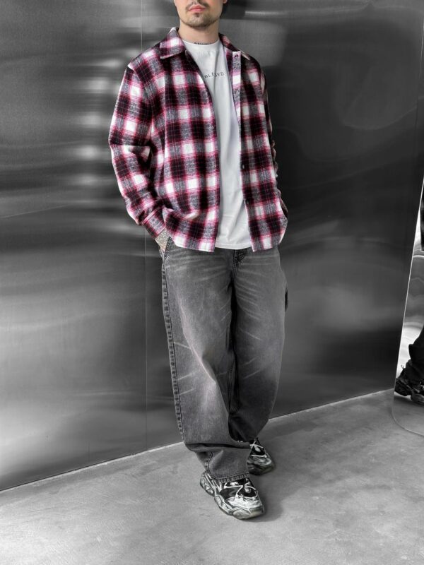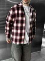 Мужская Теплая Рубашка Черно-Белая с Красным – Свободная в Клеточку на Кнопках