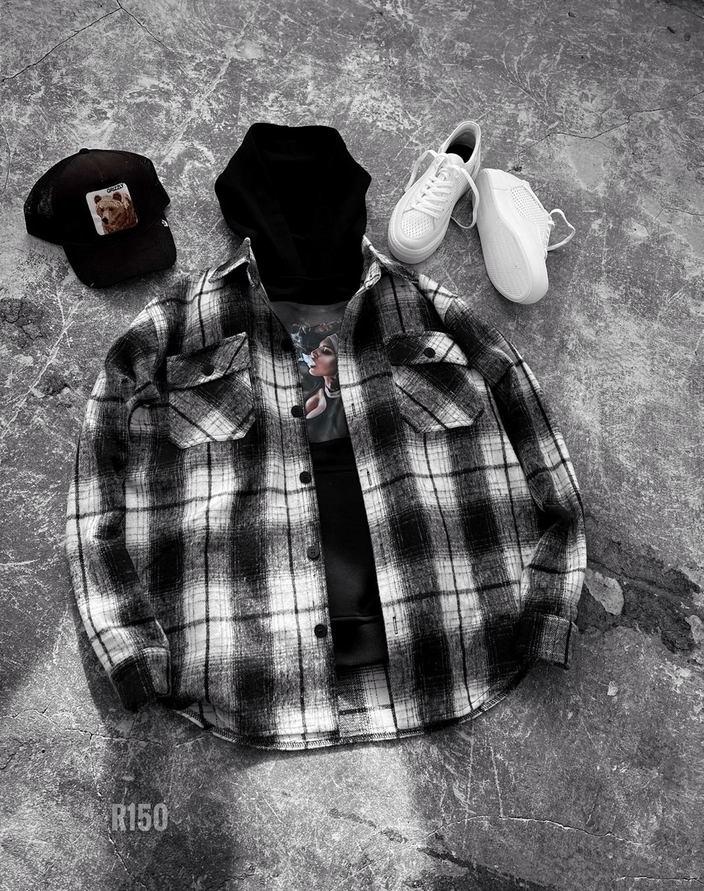 Мужская Байковая Черно-Белая Рубашка – Классическая Клетчатая Свободного Кроя